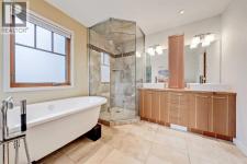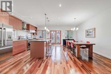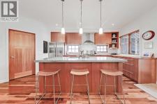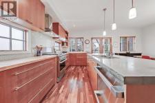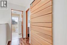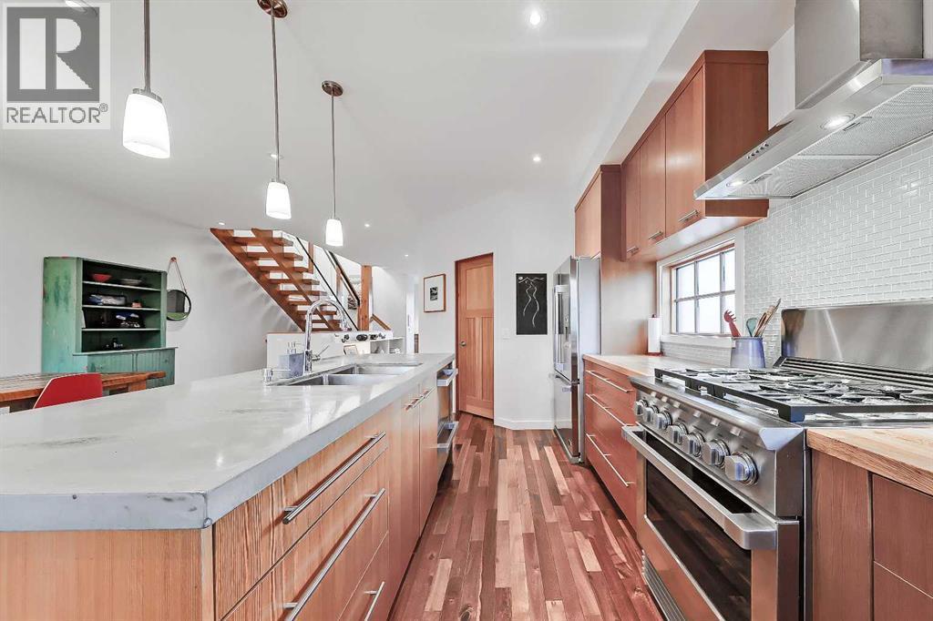 Quick possession available and updated photos! Discover this stunning semi-detached home in the heart of Parkdale, offering a blend of natural design and modern amenities. Step inside to a “modern mountain cabin” aesthetic, featuring acacia hardwood floors, fir interior doors, and oversized windows that fill the main floor with natural light. The inviting living room boasts a cozy gas fireplace, while the chef’s kitchen impresses with a walk-in pantry, custom cabinetry, premium stainless steel appliances, butcher block countertops, glass tile backsplash, and a concrete-topped island with bar seating. The spacious dining area opens to the upper rear deck through French doors, ideal for entertaining.Upstairs, the primary suite offers large windows, a walk-in closet, and a barn door leading to a luxurious five-piece ensuite with dual sinks, a freestanding soaker tub, tiled glass steam shower, and heated travertine floors. Two additional bedrooms with built-in closets share a four-piece bath, and a barn-door-enclosed laundry closet adds convenience. Handcrafted barn doors throughout the home serve as unique artistic features. The fully developed lower level includes a recreation room with flexible gym space, a two-piece bathroom, and a tiled mudroom/foyer with direct access to the heated double garage. Additional amenities include Vacmuflow rough-in, snow-melt system rough-in for the driveway, and under-stair storage. Just minutes from the Bow River Pathways and transit routes, offering easy commuting to the Foothills Hospital, University of Calgary and Downtown. (id:6769)
