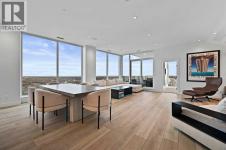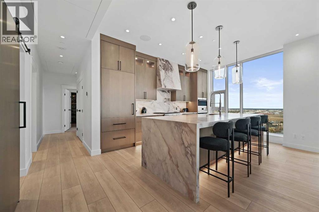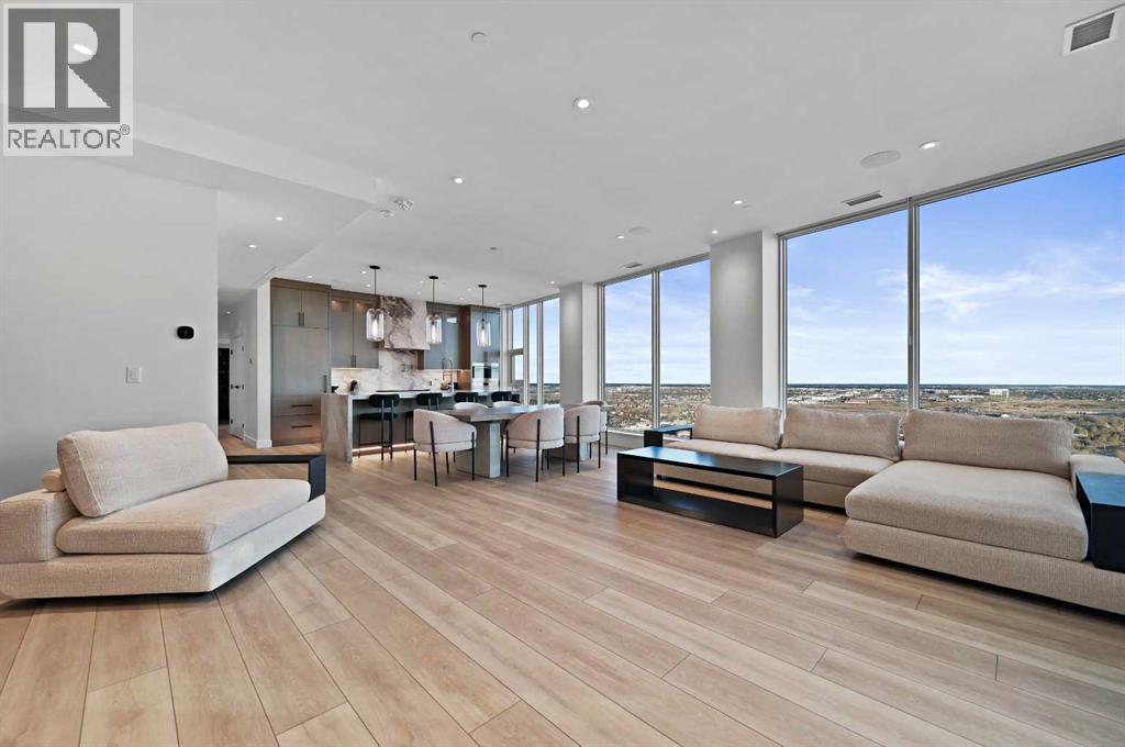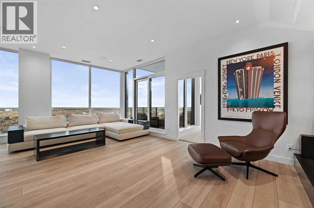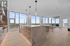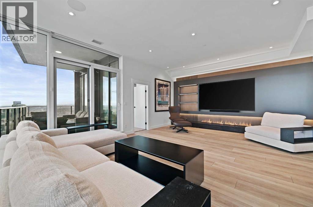 Perched high above the city on the 41st floor of The Arris West, this extraordinary 3-bedroom, 2-bathroom penthouse redefines modern luxury with over $400,000 in bespoke upgrades, world-class amenities, and cinematic, unobstructed views stretching from the majestic Rocky Mountains to the sparkling Bow River and the glowing lights of the Calgary Tower & Saddledome. This is more than a home—it's an elevated lifestyle experience.From the moment you step inside, the grandeur is unmistakable. Floor-to-ceiling windows wrap the expansive open-concept living area, immersing you in panoramic vistas that shift beautifully from sunrise to sunset. Wide 12" oak plank flooring, a Lutron wireless lighting system, integrated Sonos audio, smart thermostats, and power blinds set a refined tone of modern comfort and control.The culinary experience here is nothing short of exceptional. The chef-inspired kitchen showcases quartz waterfall countertops, upgraded fixtures including a premium kitchen faucet and pot filler, and a lineup of elite appliances: 36" Sub-Zero fridge/freezer, Wolf gas cooktop, wall oven and built-in microwave. A rare butler’s pantry—appointed with custom cabinetry, a wine fridge, and an additional built-in Miele coffee machine—elevates both function and sophistication. Host with ease around the oversized island or unwind beside the mesmerizing 80" water-vapour steam fireplace, with a 100" living-room TV creating a true theatre-like atmosphere.All bedrooms are generous in scale, enhanced with custom built-in closets, while the primary suite impresses with its spa-like ensuite featuring double sinks, vanity storage, and an oversized glass-enclosed shower. A well-designed foyer with front closets and full in-suite laundry completes the practical luxuries within.This penthouse also includes an exceedingly rare oversized heated underground double garage with EV charger, plus a large private storage room—a prized convenience in downtown living.Residents enjoy a ccess to Club Arris, a jaw-dropping 25,000 sq. ft. amenity haven featuring a four-season indoor pool, hot tub, dry and steam saunas, an unrivaled fitness centre (spin, weight, yoga, and TRX zones), a lush indoor/outdoor dog park, video-conference rooms, elegant lounges, a party room, and spectacular outdoor terraces with fire pits, barbecues, and even outdoor chess. All of this rests above the new urban-format Real Canadian Superstore—everyday convenience at your doorstep.Sophisticated, smart, and spectacular, this penthouse at The Arris West is a rare offering for those who demand the finest in luxury, lifestyle, and limitless views. Welcome to the pinnacle of urban living! (id:6769)