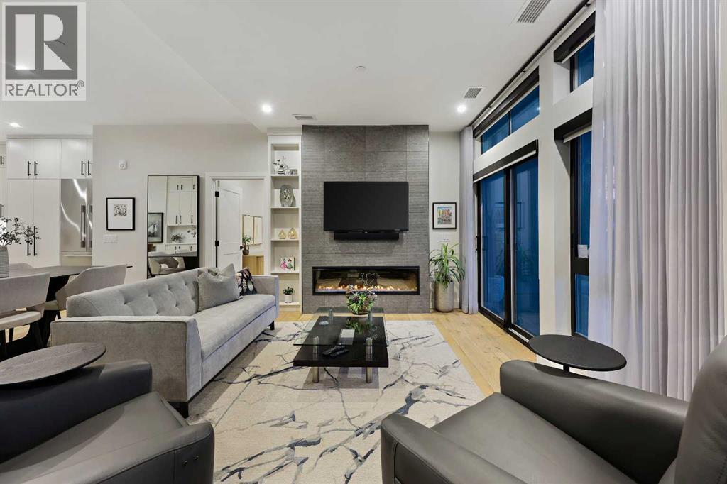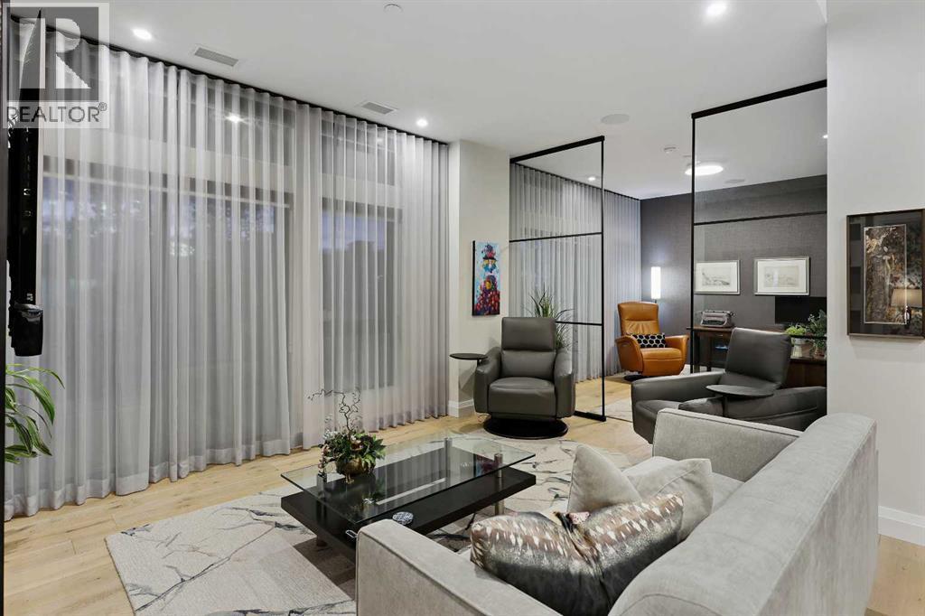 Your opportunity to experience maintenance free elevated living in the sought after West District awaits. This meticulously designed 2 Bedroom + Den residence will have you in awe from the moment you enter – boasting over 1400 square feet of interior living space and over 400 square feet of outdoor private patio, this park facing unit truly does not miss. As you enter the unit you will immediately notice the large closets offering you plenty of storage space, an in suite laundry room, and the open concept functional layout. The quality of this home is apparent from the custom millwork, the hardwood floors, and the expansive floor to ceiling windows - allowing natural light to beam through the home (all complete with custom window coverings). The chef’s kitchen with its stunning waterfall island, full height custom cabinetry and a professional grade gas cooktop is an absolute show stopper. The Primary space is a true retreat, with beautiful windows, a custom feature wall, spacious walk-in closet and a spa like en-suite bathroom with its own soaker tub, dual vanities and a luxurious walk-in shower. The second bedroom is spacious with its own walk-in closet and additional bathroom. The custom glass partitioned office offers a dedicated workspace while maintain the airy open concept.Residents of this exclusive concrete building enjoy luxury amenities including 2 underground heated parked stalls, EV charging station, car wash, expansive rooftop patio with lounge seating, fireplaces, and panoramic views of Calgary, a fully equipped gym, and a stunning owners lounge perfect for hosting private parties. Located in the vibrant West District, this property is walking distance to many restaurants, shops, and is directly across from a tree lined park with walking paths and a water feature which becomes a skating rink in the winter months. This home truly does not miss a beat: Luxury and exclusivity all while offering a maintenance free lifestyle with a prime location . (id:6769)