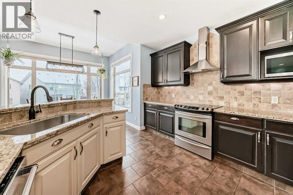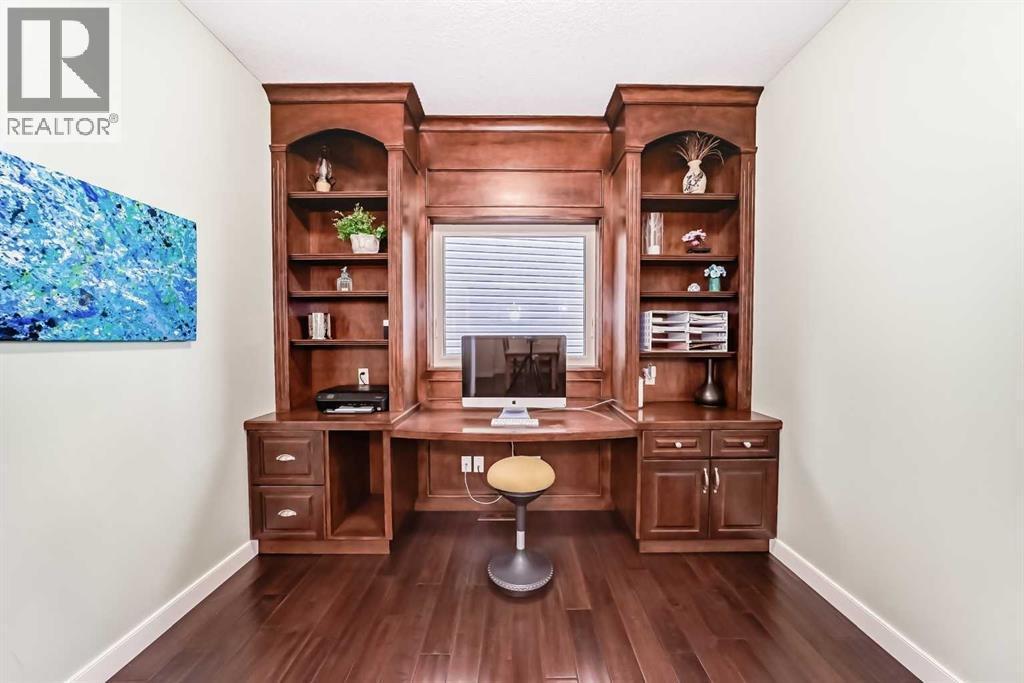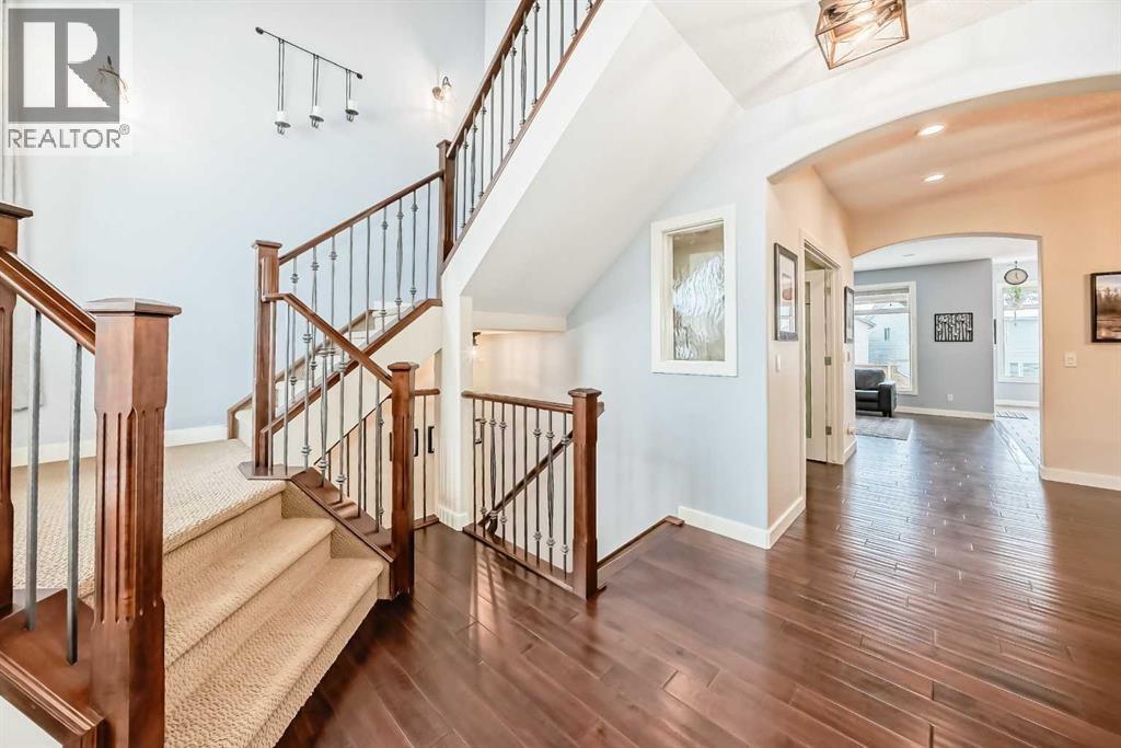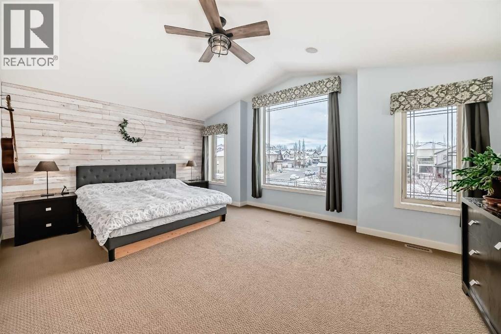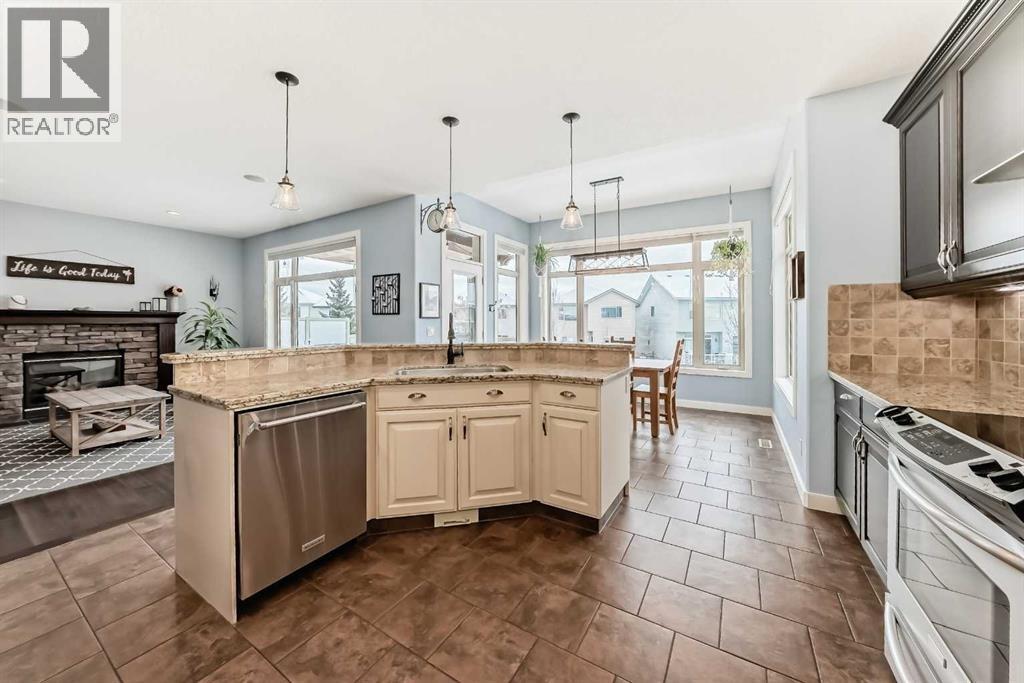 Welcome to this BEAUTIFULLY MAINTAINED custom Jensen-built home tucked into, a quiet, friendly cul-de- sac in the coveted Lower part of Sunset Ridge- a two time Best seller community. Step through the tall, light- filled entry where an expansive window opens the entire space. The main floor unfolds with an open, flowing layout surrounded by vast floor-to ceiling windows and 9-ft ceiling ceilings that fill the room with natural sunlight from morning thru evening. The kitchen features granite counter tops, a raised eating bar and spacious workspaces. From the kitchen a large walk-thru pantry with abundant shelving leads to a tucked-away mudroom and laundry area. The living room is anchored by a cozy gas fireplace and wide south-facing vistas towards the backyard. A dedicated main-floor office / formal dining room and a 2 pce bathroom completes the main floor.Upstairs, FOUR generous bedrooms offer remarkable versatility. The custom primary suite is a true retreat with tall vaulted ceilings, oversized windows framing its sunrise views. The ensuite includes a corner soaker tub/walk-in closet with smart built-ins. The additional bedrooms easily accommodate queen beds. A 5-pce bathroom completes the upper level. Epic mountain views from the back bedrooms. The professionally finished Daylight Lower level bright and open thanks to oversized windows and 9 ft ceilings. This level includes a generous wet bar with granite counter tops, additional bedroom / 4 pce bathroom. The large family room for entertainment with a gas fireplace. Double attached garage. SPACIOUS YARD. Step outside to over 400 sq ft of deck space, complete with a beautiful wooden pergola, the perfect vantage point for sunsets, mountain silhouettes, and family gatherings. The landscaped, gated yard features mature trees / a Rundle Stone Pad for a firepit. A PRIZED + PRIME LOCATION, with immediate access to Hwy-22 /Easily walk or cycle to the Ranchehouse paths and even Glenbow Pathway system/ playgrounds / out door fitness, and the upcoming community centre. This home EXCEPTIONAL location puts it walkable to Ranchview school (K-8) St Timonthys High School and the 6 acre pond, park and paths. Steps up the street you have a cozy community hub with a daycare/country market, pub, gas station, wine & spirit store, pharmacy, dental, medical services. This home is priced to sell. (id:6769)