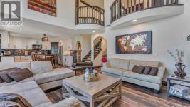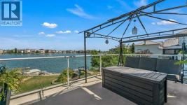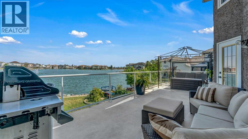 BACKING ONTO LAKE WITH A PRIVATE DOCK | BEAUTIFULLY RENOVATED | 5 BEDROOMS + DEN | LAKE VIEWS FROM EVERY LEVEL | LUXURIOUS WALKOUT | BEDROOM & FULL BATH ON THE MAIN FLOOR | Nestled on a quiet cul-de-sac and set on an extra-deep 132’ lot, this beautifully renovated lakefront home blends timeless design with an unmatched lakeside lifestyle. Enjoy direct water access from your private dock, multiple outdoor living spaces and captivating views from every level. The elegant stucco exterior, inviting front porch and durable metal roof provide lasting appeal and peace of mind. Inside, rich flooring, crown moldings and refined lighting elevate the home’s character. A bayed front living room sets the stage for formal gatherings, while the private den offers a quiet workspace. At the heart of the home, the family room impresses with soaring cathedral ceilings, a statement gas fireplace with stone surround and expansive windows that frame the sparkling lake. The adjoining dining room, wrapped in bayed windows, opens onto the full-width upper deck, ideal for seamless indoor/outdoor entertaining. Culinary creativity is inspired in the gourmet kitchen featuring full-height shaker cabinetry, stainless steel appliances including a gas stove, upgraded backsplash, pantry and generous counter space for everyday prep or hosting. A versatile main floor bedroom (or 2nd den) and full 4-piece bathroom add flexibility for guests or multigenerational living. Upstairs, crown moldings continue through four spacious bedrooms, including a serene primary suite with a cozy sitting area, walk-in closet and a spa-inspired ensuite with dual sinks and an oversized tiled shower, all framed by sweeping lake views. A second 4-piece bath serves the additional bedrooms, one of which overlooks the family room below and can be closed for privacy. The fully finished walkout basement expands your living space with a flexible recreation zone for media, games or fitness, opening directly to the covered patio and landscaped yard. A stylish wet bar with peninsula seating enhances entertaining, while a 5th bedroom and full 4-piece bath create a private retreat for guests or extended family. Outside, lush landscaping leads to a paver stone patio and firepit overlooking the water, offering the perfect spot to unwind at sunset. A private dock invites swimming, paddling or simply relaxing by the lake. Additional highlights include a double attached garage, two high-efficiency furnaces and ample storage. Located in Calgary’s only Californian-themed lake community, residents enjoy year-round recreation - beach days, skating, green spaces, walking paths and community events all within walking distance of schools, parks, shopping and services. A truly exceptional home offering luxury, comfort and the best of lakeside living! (id:6769)