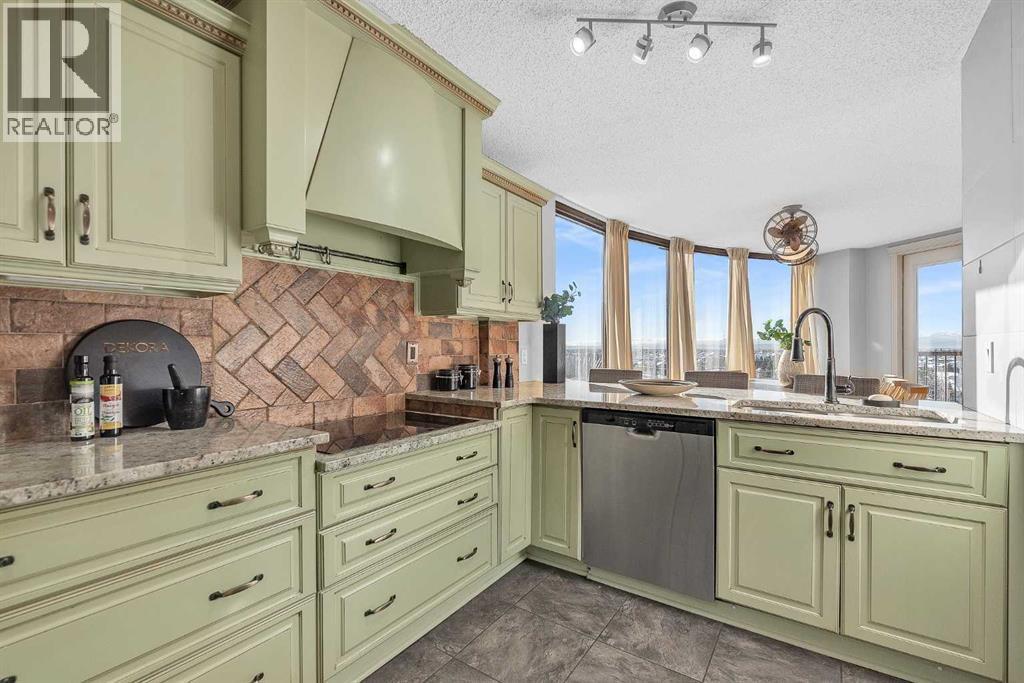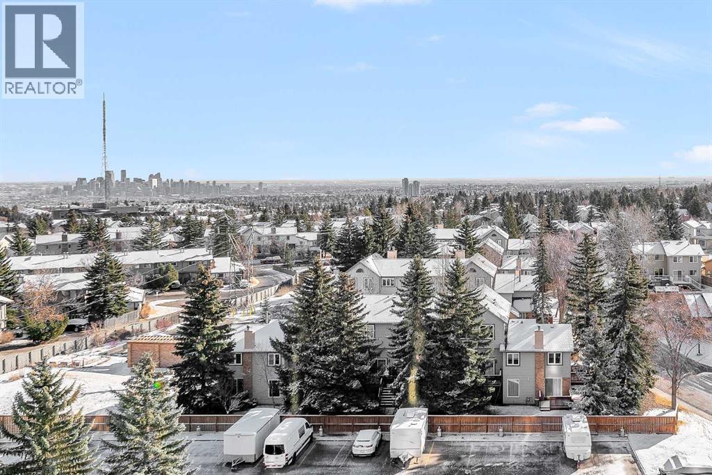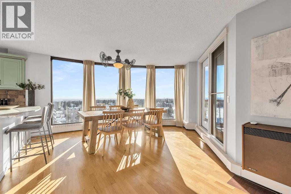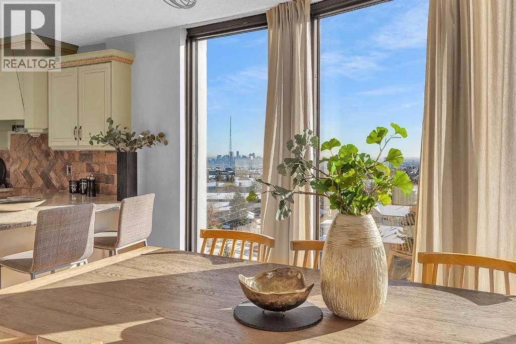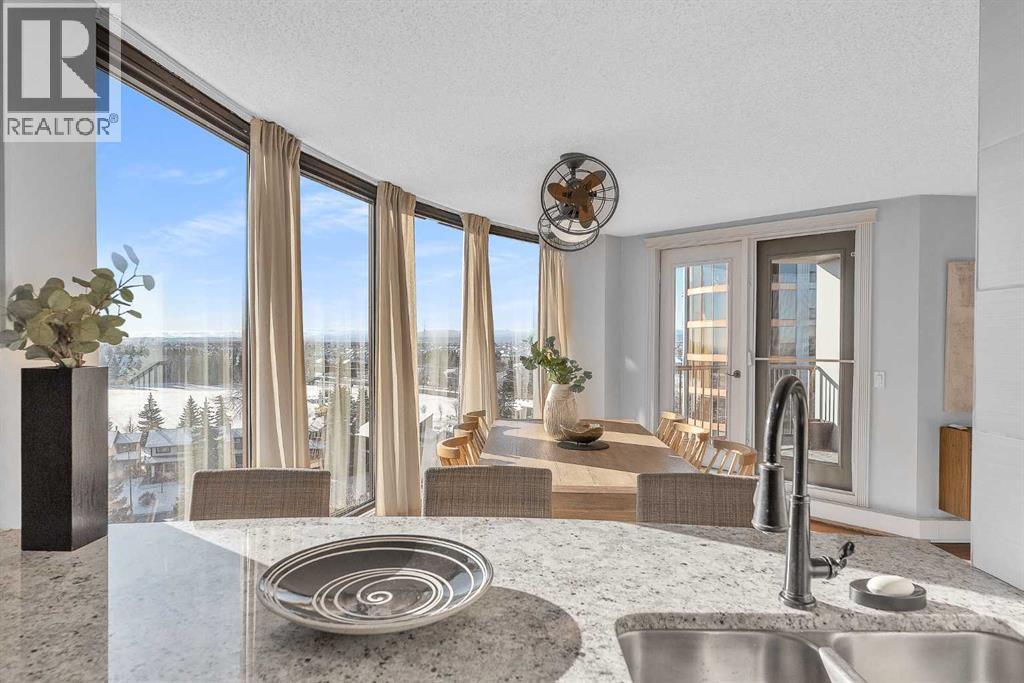 SPACIOUS 9TH FLOOR CONDO WITH 180° DEGREE VIEWS OF DOWNTOWN, CITY, AND MOUNTAINS– 1352 SQFT | 2 BEDROOMS | 2 BATHROOMS | 2 PARKING STALLS |Welcome to executive living at the iconic Odyssey Towers. This unique concrete building is designed with large floorplans that provide privacy, style and function. With wall to wall windows and open plan living space, this home is filled with natural light and provides views from every room. On the interior you will find a spacious french country inspired kitchen equipped with stainless steel appliances, granite countertops, a large corner pantry, and breakfast bar. Enjoy sitting at your dining table and watching the sun rise up behind the downtown skyline- the dining room leads out to the covered balcony where you can relax on a summmer evening and watch the sun set behind the Rocky Mountains. The adjacent nook area provides a great area for a buffet or a desk. Leading to the show- stopping living room with panoramic city and mountain views. . You’ll find both bedrooms to the front of the property and away from the living space, for comfort and privacy. The primary bedroom features a walk-in closet and and large ensuite bathroom with double vanity, and oversized shower. The second bedroom and full bathroom are perfect for guests. Additional conveniences include in-suite laundry with cabinetry and counter space, a large in-unit storage room, a linen closet, and an entry closet.Parking is convenient with two large stalls – one indoor and one outdoor (perfect for a small RV, trailer, or even a boat- permitted with board approval), and you have the benefit of an extra out of unit storage space.This adult-only (18+) no-pet building is quiet, secure, well-managed, and offers valued amenities including saunas, steam rooms, guest suites, and visitor parking. The location is unbeatable – walk to West District’s restaurants, shops, and services, explore the many walking paths in this established west-side community, or take ad vantage of the quick connections to downtown, Stoney Trail, and the mountains.Book your showing today to see why this is one of the most desirable west-side addresses for condo living. (id:6769)