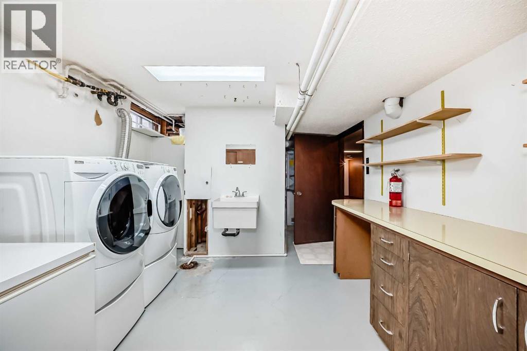 At the quiet heart of the community, this Willow Park bungalow showcases strong bones and exciting opportunities to update to your heart’s content. A tidily landscaped front yard and quality brickwork on the pathway and the home itself have a timeless appeal, and updates over the years have focused on function so you can simply add your personal aesthetic. Inside, a large entryway with a brick feature wall steps into a main floor with cool character elements and tons of natural light. The open concept living and dining room has big west-facing windows and statement exposed beams as well as a gas fireplace in a brick hearth – a few updates and you’ll have a gorgeous space with great visual style. In the kitchen, diner windows with an eating bar were added to connect the space to the living area, and an eat-up island with outlets makes multitasking prep and entertaining a breeze. Tons of counterspace and a pantry closet once again give you tons of options to make it your own without any major renovations. At the end of the hall, a spacious primary bedroom includes a two-piece ensuite and walk-in closet. There are two more bedrooms on this floor, along with the main bathroom in a great family layout. The walk-in linen closet is a rare find, and will impress the organizer of the household. A large mudroom provides access to the yard as well as a huge flex area or studio that could easily be used for a workspace, gym, or hobby space; complete with a wash station, a second gas fireplace, and a separate subpanel. French doors lead to the yard, adding convenience and sunlight. Downstairs, the basement is a retro blast from the past. The rec area has vintage built-in speakers, and a unique spa-style bathroom offers a sauna and a jetted tub as well as a separate shower and dual vanity. The non-conforming bedroom here is perfect for guests, and the utility room holds a laundry area with newer machines and a workbench. There is also plentiful storage on this level. This home in cludes central air conditioning and all new windows aside from the living room. Outside, the yard is a serene, treed paradise that feels very private and parklike. The patio is huge, so you can lounge, grill, and gather with room to spare. An irrigation system makes yard work easy, and the cedar fence is newer. The double-detached garage off the paved alley is well-set up with built-in shelving, workspace and a heater. The location of this home on the corner means you only have one direct neighbour. This community is known for its proximity to amenities, with nearby Macleod Trail providing shopping and dining options within minutes. In walking distance, Fairmount Place has a selection of shops, services, and restaurants at your doorstep. Schools and parks are also walkable, and the golf course is nearby as well. Set near several primary routes, everything you need is within a short drive, whether you’re commuting downtown, visit friends around the city, or running errands. See this one today! (id:6769)