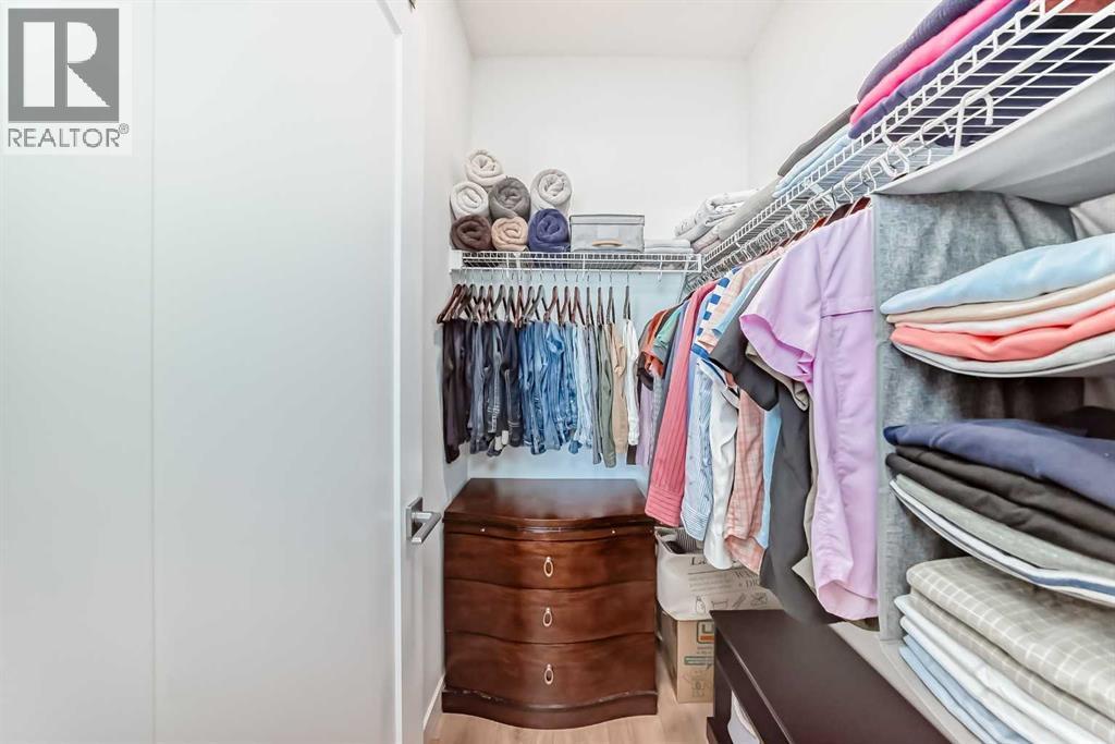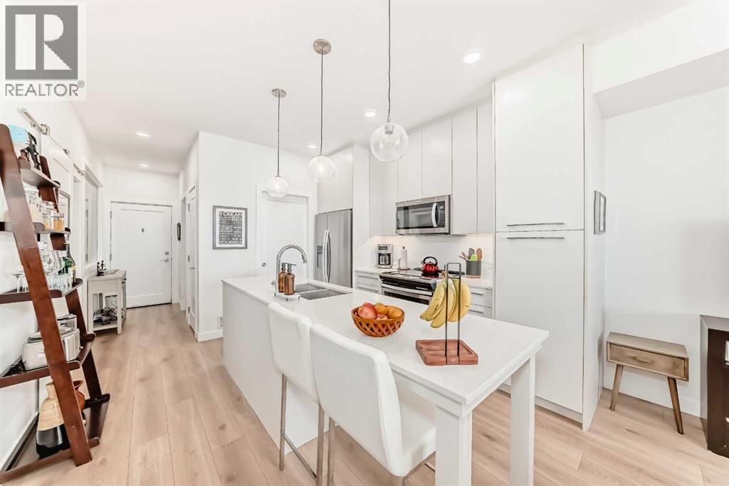 Welcome to this beautifully maintained 2-bedroom, 2-bathroom condo in the highly sought-after Legends of Cornerstone. Occupied by a single tenant since possession, this home has been exceptionally cared for and shows like new. Featuring 9 ft ceilings, oversized windows, and modern laminate flooring, the unit offers a bright, open-concept layout that provides both comfort and functionality.The contemporary kitchen is equipped with quartz countertops, stainless steel appliances, and sleek cabinetry extending to the ceiling—perfect for everyday cooking or hosting guests. The living area flows seamlessly onto a spacious private balcony, ideal for morning coffee, fresh air, or relaxing after a long day.The primary bedroom includes a walk-in closet and a 4-piece ensuite bathroom. A well-sized second bedroom and an additional full bathroom make this home ideal for small families, professionals, or investors.Enjoy the convenience of titled underground parking and assigned storage. Residents also have access to some of the best condo amenities in the city, including a fully equipped gym, yoga studio, spinning room, theatre room, pet spa, and a large community event space with a kitchen—perfect for larger gatherings or celebrations.Located in Cornerstone, one of Calgary’s fastest-growing communities, this condo is minutes from Stoney Trail, Calgary International Airport, shopping centers, schools, parks, and walking paths.A must-see opportunity—book your private viewing today! (id:6769)