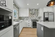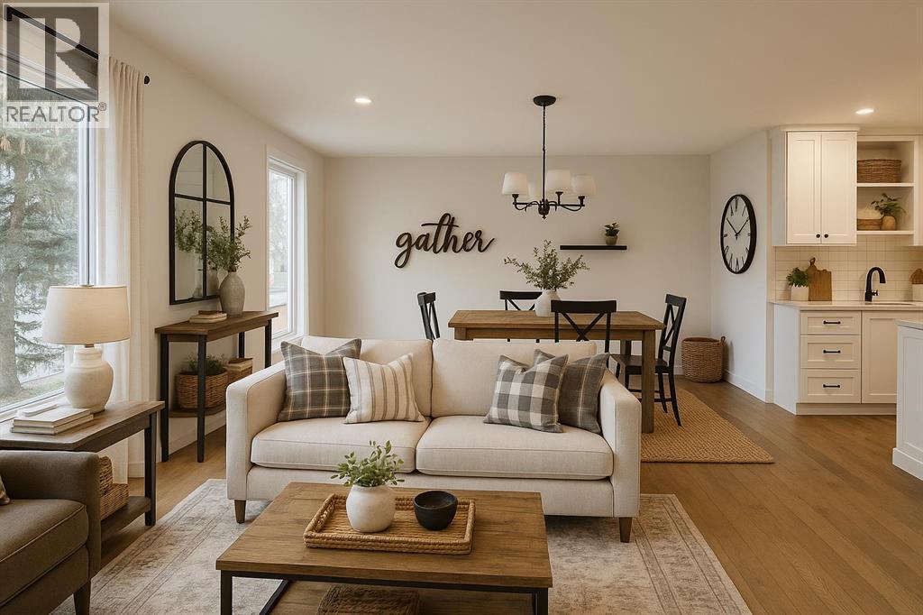 What a location !! Your move to Cochrane starts here. Tucked away on a peaceful, tree-lined street in Cochrane’s charming Old Town East Side, this beautifully renovated 1,250 sq. ft. bungalow offers the perfect blend of modern comfort and small-town serenity. Backing directly onto a tranquil hillside Ravine & Reserve. The setting alone feels like a private retreat. Step inside to an open, airy main floor where wide-plank hardwood flows throughout and natural light pours in through brand-new windows. The stunning new kitchen features quartz counters, a generous island, new appliances, and a seamless sightline over the living and dining areas—all framed by elegant California ceilings. With 3 bedrooms up, 2 fully updated bathrooms, and a convenient main-floor laundry, every inch of this home is designed for effortless living. The primary suite includes its own ensuite, and a massive pantry offers exceptional storage. Both back bedrooms have doors that open onto a sprawling new back deck and additional patio space—ideal for morning coffee, evening gatherings, or simply soaking in the peaceful reserve views. Central air conditioning, a new high-efficiency furnace, updated electrical and plumbing, new blinds, pot lighting, and a fresh H2O tank ensure comfort and reliability throughout. Outside, the appeal continues. The generous 46' x 140' lot is complemented by a newly paved driveway, new sidewalks, a welcoming front porch, gemstone custom exterior lighting, and an oversized 2.5+ car garage with impressive 9-ft ceilings—perfect for vehicles, hobbies, or additional storage. The finished lower level expands your living space even further and offers endless versatility, along with abundant storage for everything you need to tuck away. Located just minutes from parks, schools, and downtown Cochrane—only four minutes to every convenience—you’ll have the best of both worlds: peaceful living with quick access to everything you need. A beautifully updated home, a prime location, and a lifestyle you’ll love—this is your opportunity to make Cochrane home. Perfect for a small family, a couple looking to downsize or the perfect home to retire to. Renovation was approx $100,000. PHOTOS ARE ACTUAL, BUT VIRTUAL FURNITURE HAS BEEN ADDED FOR POTENTIAL BEFORE AND AFTER IDEAS (id:6769)
