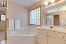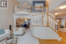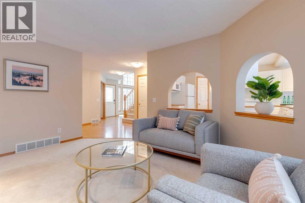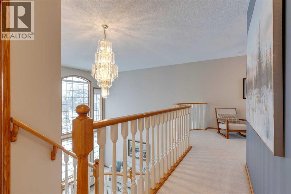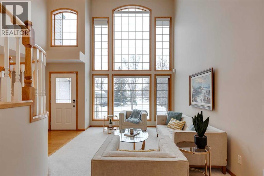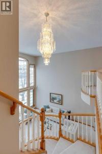 **READY FOR QUICK POSSESSION** This two-story home sits in an excellent, quiet location just steps off the Bow Valley Parkway, offering very pleasing curb appeal that leads into a welcoming two-story entrance. The living room also impresses with its two-story height, abundant windows + natural light, while the neutral décor + paint palette create a fresh, inviting feel throughout. Hardwood flooring + carpeting cover the main floor, which features a spacious kitchen with generous storage + counter space, a roomy breakfast nook overlooking the backyard + a cozy family room with fireplace. A mudroom + laundry area sit conveniently off the attached double garage. Upstairs offers a loft/sitting room plus two bedrooms, including a generous primary suite with ceiling fan, roomy en-suite bath + walk-in closet. The lower level is partly finished with a rec room + bathroom, providing ample opportunity to tailor the remainder of the space. The pretty, flat backyard with mature trees completes this appealing property. (id:6769)