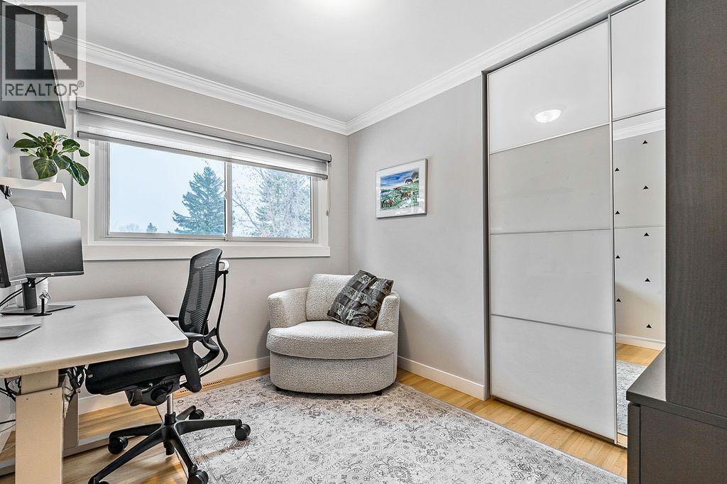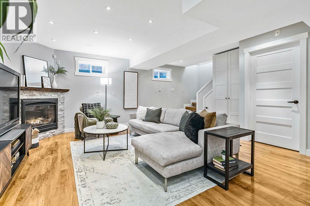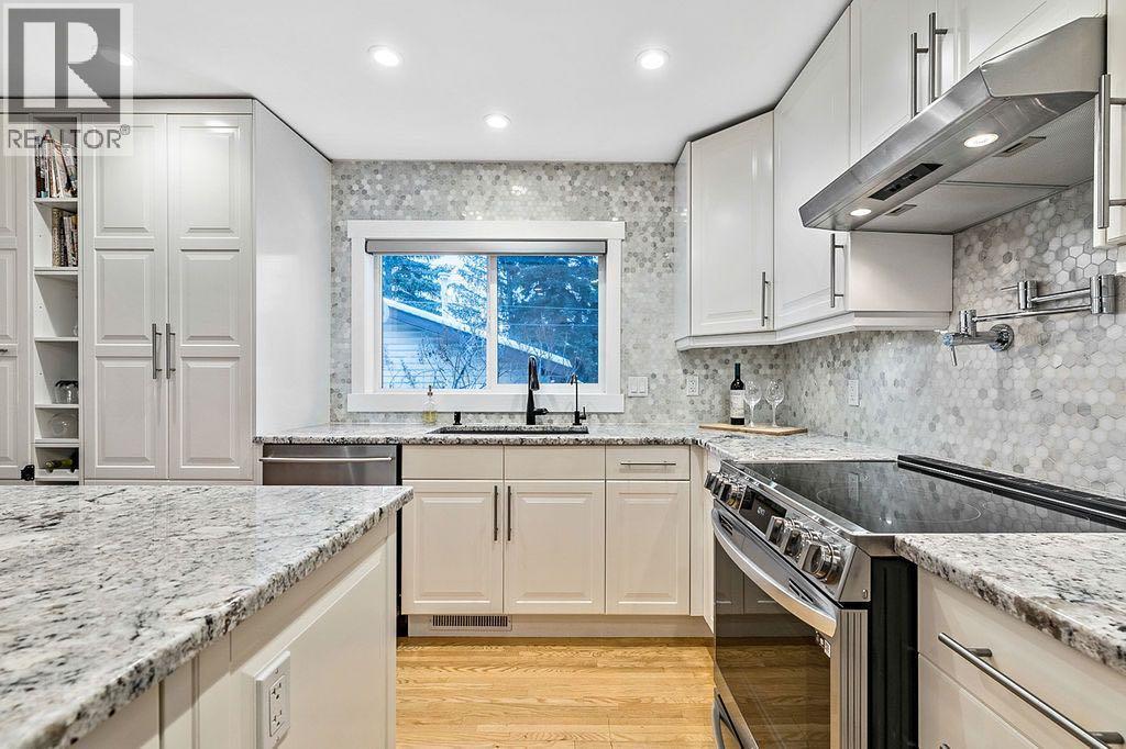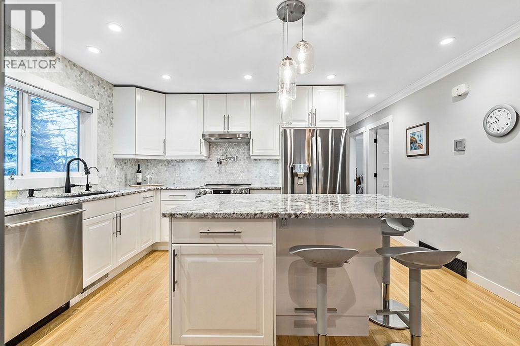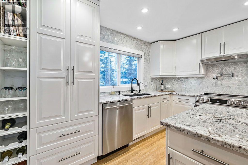 What a location for this beautiful, thoughtfully renovated bungalow in the north portion of Wildwood. Close to the ridge in Wildwood with Edworthy Park and the Bow river an easy walk away. One of Calgary's most sought out outdoor area for dog owners and hikers alike. An inviting home showing pride of ownership with the perfect main floor plan for entertaining, gourmet kitchen with granite counter tops, soft close drawers and hardwood throughout. Central air conditioning keeps things cool in summer and the gas fireplace offers cozy heat in the downstairs family room for cold winter months. Three bedrooms on main plus one large bedroom down with another flex room that could be yet another bedroom or a great gym space. Basement was professionally developed with flat ceilings, lots of pot lights, laminate floors, in-floor heat in the bathroom, wet bar and wired for surround sound. Outside the yard is truly the place to relax and enjoy the beautiful landscaping complete with 5 zone irrigation system, a cobblestone patio and a sunken fire pit surrounded by perennial beds, raspberry bushes, grasses and huge mature trees. Double garage is heated and has lots of storage and built in shelving. An amazing location from which to cycle to work and beat the traffic. Easy to leave town and head to the mountains and a short commute to downtown. City living with space to breathe. New shingles on garage - 2024, New hot water tank - 2024, Leaf gutter protection system - 2024. (id:6769)