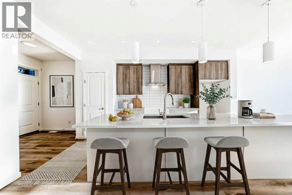 Introducing the exquisite “Tilsa” by Hopewell Residential in Calgary’s award-winning lake community of Mahogany—where thoughtful design, modern finishes, and four-season lifestyle all come together. From the moment you arrive, this home feels inviting and functional, with an expansive floor plan that’s made for busy families, casual get-togethers, and everything in between. Step inside and you’re greeted by a versatile main-floor flex room that can easily adapt as your life does—home office, kids’ homework zone, playroom, or hobby space. Just beyond, the open-concept living and dining area creates a seamless flow that’s perfect for entertaining. Large windows draw in natural light and frame your main floor in a warm, comfortable glow, whether you’re hosting friends for dinner or enjoying a quiet night in. At the heart of the home sits a chef-inspired kitchen that’s as beautiful as it is functional. The spacious central island offers plenty of seating for casual breakfasts or after-school snacks, while the gorgeous quartz countertops, two-tone cabinetry, extra drawers for organized storage, and classic stacked subway tile backsplash elevate the space with timeless style. A sleek chimney hood fan and stainless steel appliances complete the picture, giving you a kitchen that’s ready for everything from weeknight meals to holiday hosting. Upstairs, the layout is designed with family living in mind. A perfectly placed central bonus room separates the primary suite from the additional bedrooms, adding privacy and creating an ideal spot for movie marathons, game nights, or watching the big game. The primary bedroom is a true retreat—spacious, serene, and tucked away—featuring a luxurious 5-piece ensuite with dual sinks, a soaker tub, separate shower, and a large walk-in closet to keep everything neatly organized. The additional bedrooms are bright and comfortable, ideal for kids, guests, or a second home office. The upper-floor laundry is just steps away from all bedrooms, making day-to-day living that much easier. Outside, this home is set up for sun-filled outdoor living. With sunny south exposure, you’ll enjoy warm, bright days on your future deck or patio—perfect for summer BBQs, backyard hangouts, or just unwinding after a day at the lake. The 9' foundation and secondary side entrance open the door to future basement development, making this home ready for a potential secondary suite or extended family space down the road (a secondary suite would be subject to approval and permitting by the city/municipality). A double attached garage provides plenty of room for vehicles, storage, and all your lake toys. Living in Mahogany means you’re not just buying a home—you’re stepping into a lifestyle. This is one of Calgary’s most sought-after communities, centred around a 63-acre freshwater lake with two private beaches, perfect for swimming, paddleboarding, and lakeside picnics in the summer, plus skating and winter fun when the seasons change. (id:6769)