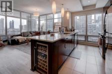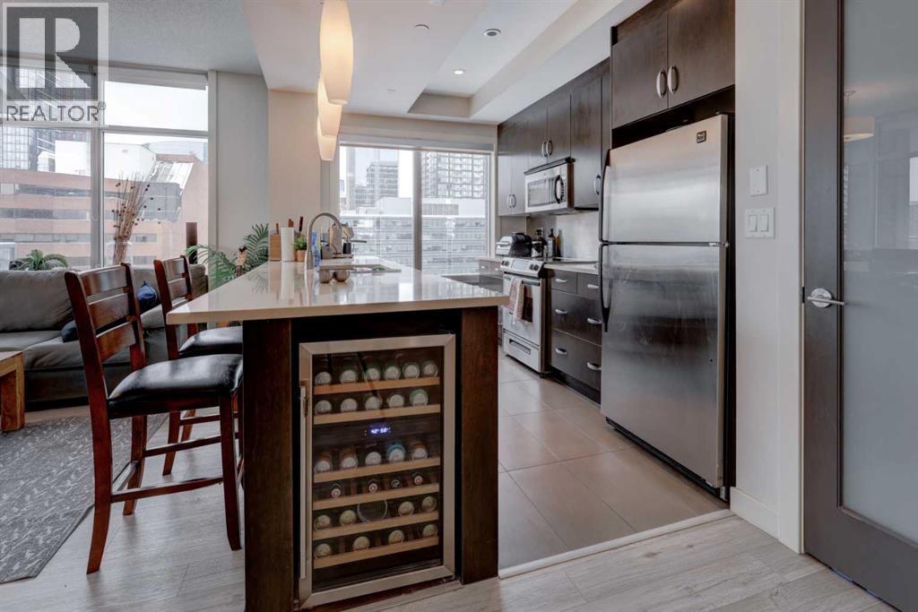 Welcome to this beautiful, modern 2 bedroom, 2 bathroom Premium Beltline condo featuring panoramic views to the north & west and titled parking stall and storage unit. Spanning 1,116 sqft, the sophisticated corner layout is framed by floor-to-ceiling windows capturing sweeping sunset, mountain and city skyline views. A huge, almost 300 sqft patio, is an entertainer’s dream, ideal for summer barbeques, morning coffee or evening cocktails under Calgary’s glowing skies. Inside we have a sleek open-floorplan with luxury vinyl plank and tile flooring throughout, quartz kitchen countertops, 9 ft ceilings, stainless steel appliances, a wine fridge and convenient office/study corner with built-in desk and cabinets. The kitchen overlooks the living area with spacious countertop and cabinet space, pantry and stainless steel appliances. The serene primary suite features a generous walk-in closet and spa-inspired ensuite with dual sinks, while the second bedroom offers ideal flexibility for guests, roommates or a home office with its own access to a full bathroom. In-suite laundry and central A/C are an added bonus. Castello is one of Calgary’s premier executive buildings, offering residents a fitness centre, guest suite, concierge services, car wash, bike rack area and pets are welcome (with restrictions). Perfectly located in the heart of the Beltline, you’re steps from 17th Ave and 4th Street restaurants, shops and vibrant nightlife. (id:6769)