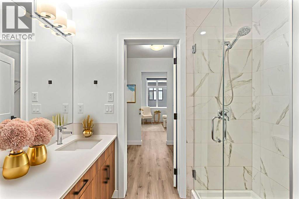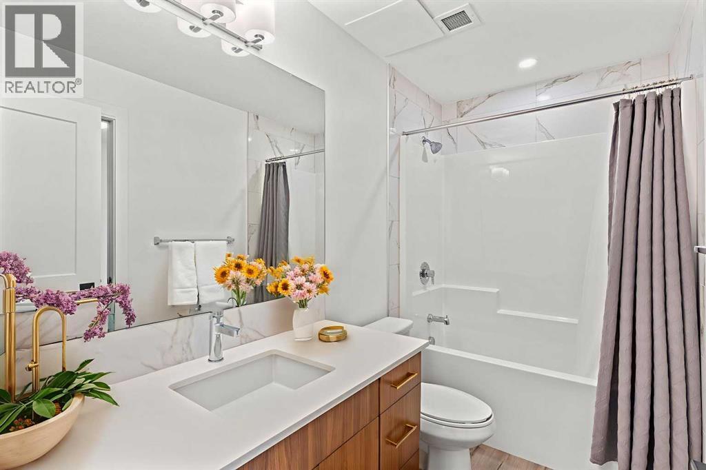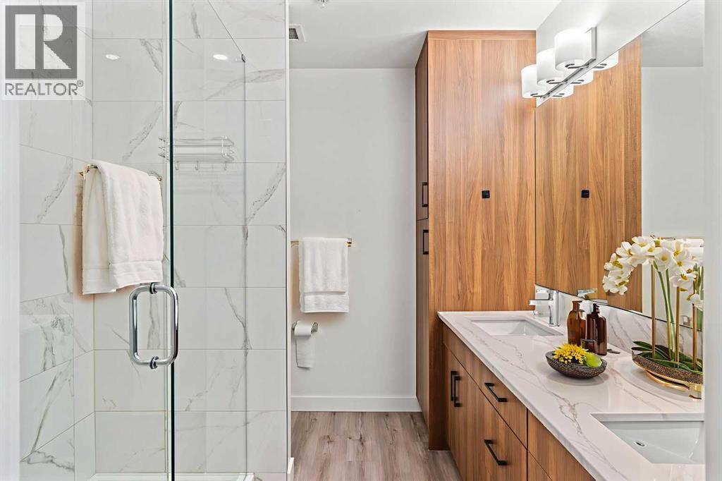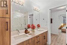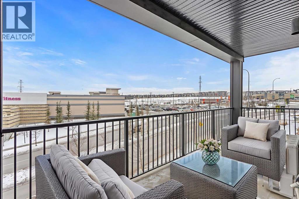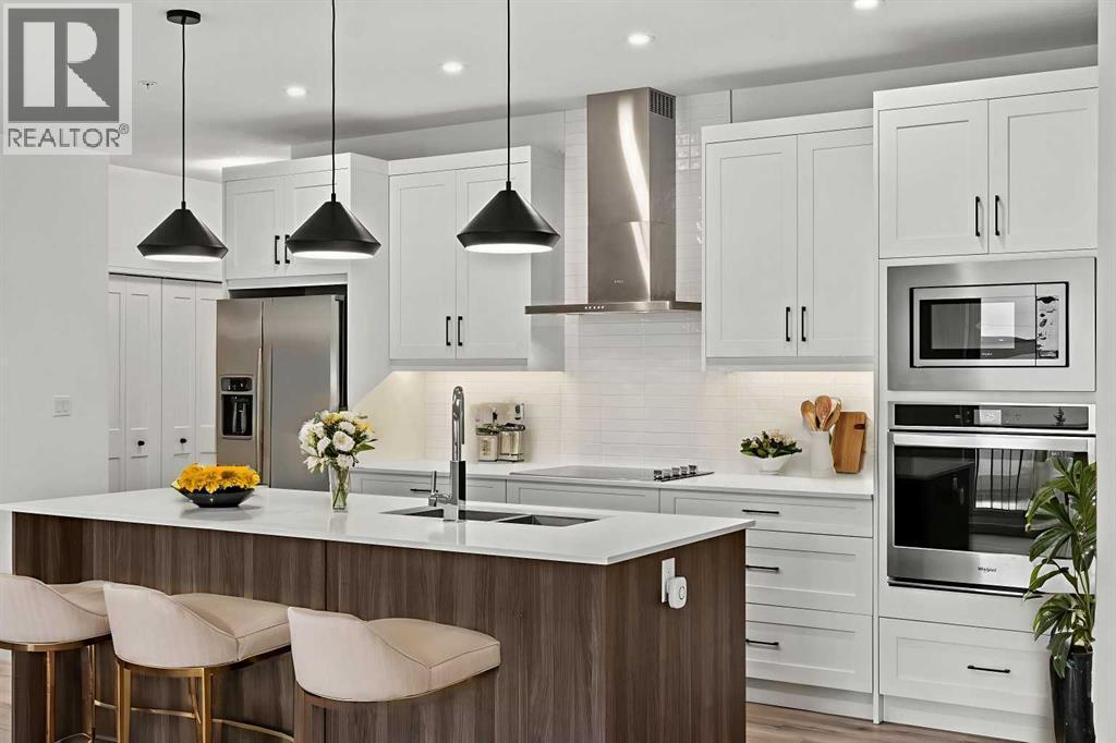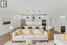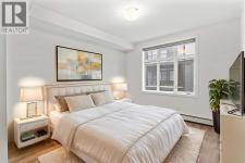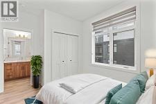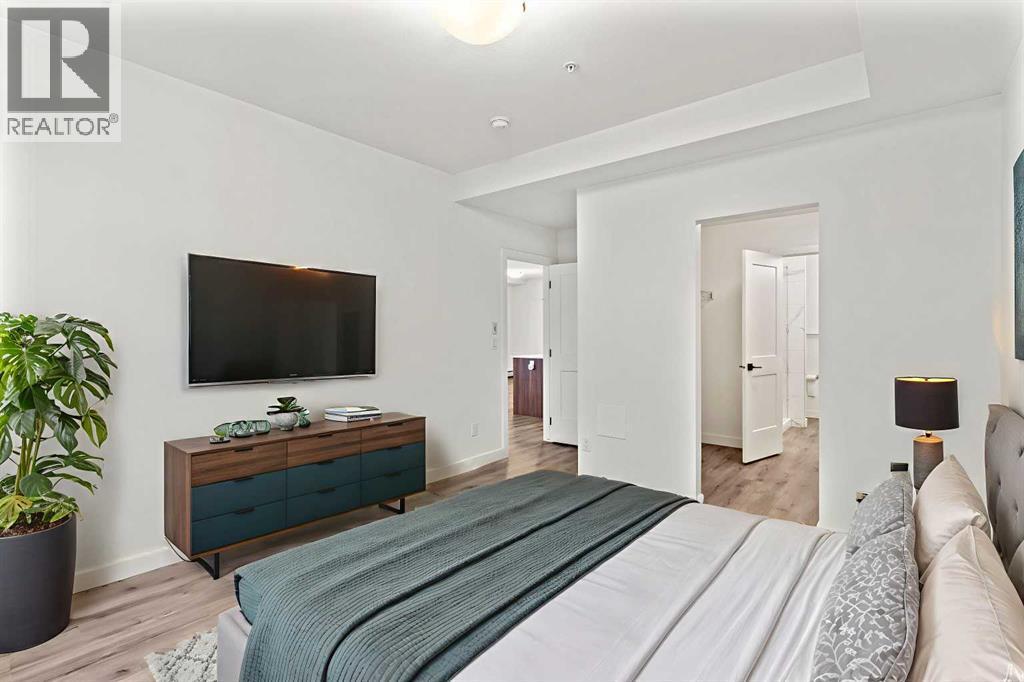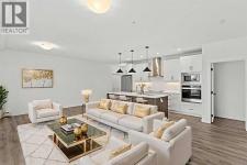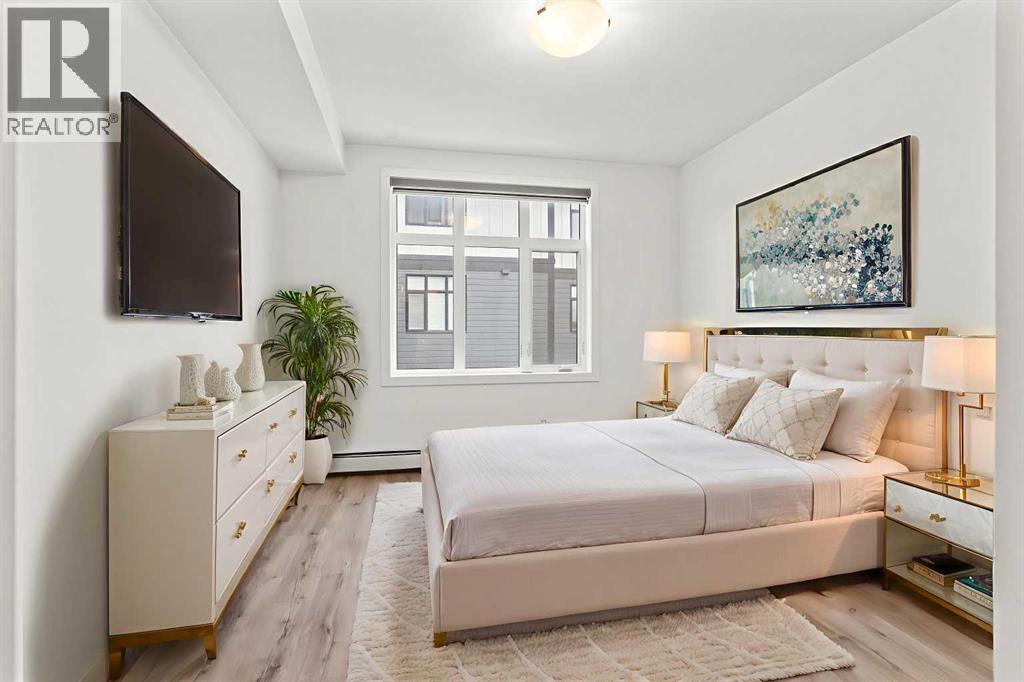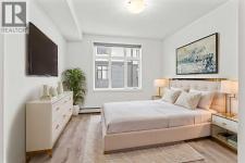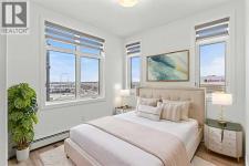 Welcome to elevated condo living—where refined design, thoughtful upgrades, and everyday comfort come together seamlessly. This impeccably maintained end-unit residence is filled with natural light, framed by 9-foot ceilings and expansive south- and east-facing windows that create an airy, upscale atmosphere throughout.The upgraded kitchen is a true showpiece, featuring quartz countertops, extended 41-inch upper cabinetry, and a striking oversized island designed for both entertaining and effortless daily living. Luxury vinyl plank flooring flows throughout the home, connecting the generous dining area to a spacious living room that’s perfect for hosting or unwinding in style. Convenient in-suite laundry adds to the home’s functional appeal.The primary suite is a private retreat, offering a generous layout, an extra-large walk-in closet with custom organizer, and a spa-inspired 4-piece ensuite complete with a tiled shower and upgraded cabinetry. The second bedroom provides excellent flexibility, enhanced by a pocket door offering direct access to the main bathroom—ideal for guests or a home office setup.With over $27,000 in builder upgrades, this home stands apart. Motorized zebra blinds (throughout, excluding the second bedroom) and builder-installed air conditioning deliver both comfort and convenience year-round. Step back and take in the open views, all while being moments from shops, dining, and everyday amenities in a vibrant, well-connected community.The offering is completed by one of the largest heated underground parking stalls in the building, paired with spacious storage—a rare and valuable combination.This is modern condo living done right. Thoughtfully upgraded, beautifully finished, and perfectly located—an exceptional opportunity to own a home that truly delivers on lifestyle and quality. (id:6769)