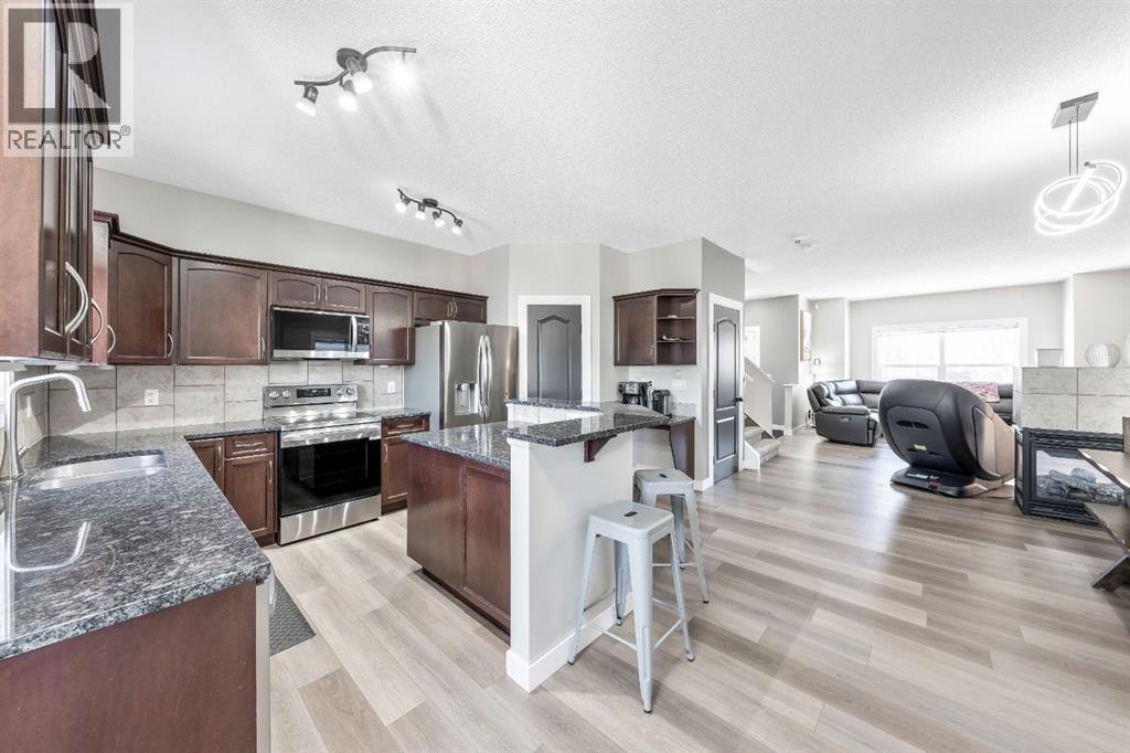 This thoughtfully designed home offers nearly 2,350 square feet of fully developed living space and is ideally located on a quiet street in the family-friendly community of Cimarron. Upon entry, you’re welcomed by soaring 9’ ceilings, a spacious front foyer, gleaming new flooring, and stylish updated light fixtures. The inviting front living room is filled with natural light and features a three-sided fireplace that adds warmth and ambiance. Adjacent is the bright dining area. This seamlessly connects to the chef-inspired kitchen, complete with rich espresso cabinetry, gorgeous granite countertops, new stainless steel appliances, a tile backsplash, and a convenient corner pantry. This level also includes a tucked-away powder room and a rear mudroom area with direct access to the backyard—perfect for entertaining with a large deck, raised garden beds, and a carport. Upstairs, you’ll find two generously sized bedrooms, a full 4-piece bathroom, and an expansive primary retreat. The primary suite is a true sanctuary, offering a large walk-in closet and a private 4-piece ensuite. The fully finished lower level expands your living space with a large rec room, a fourth bedroom, a 4-piece bathroom, a dedicated office, and a laundry room. Ideally located within walking distance to schools, parks, pathways, shopping, and professional services, this home offers both comfort and convenience. Schedule your private showing or view the virtual tour today. (id:6769)