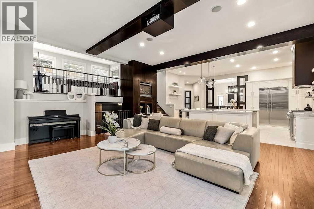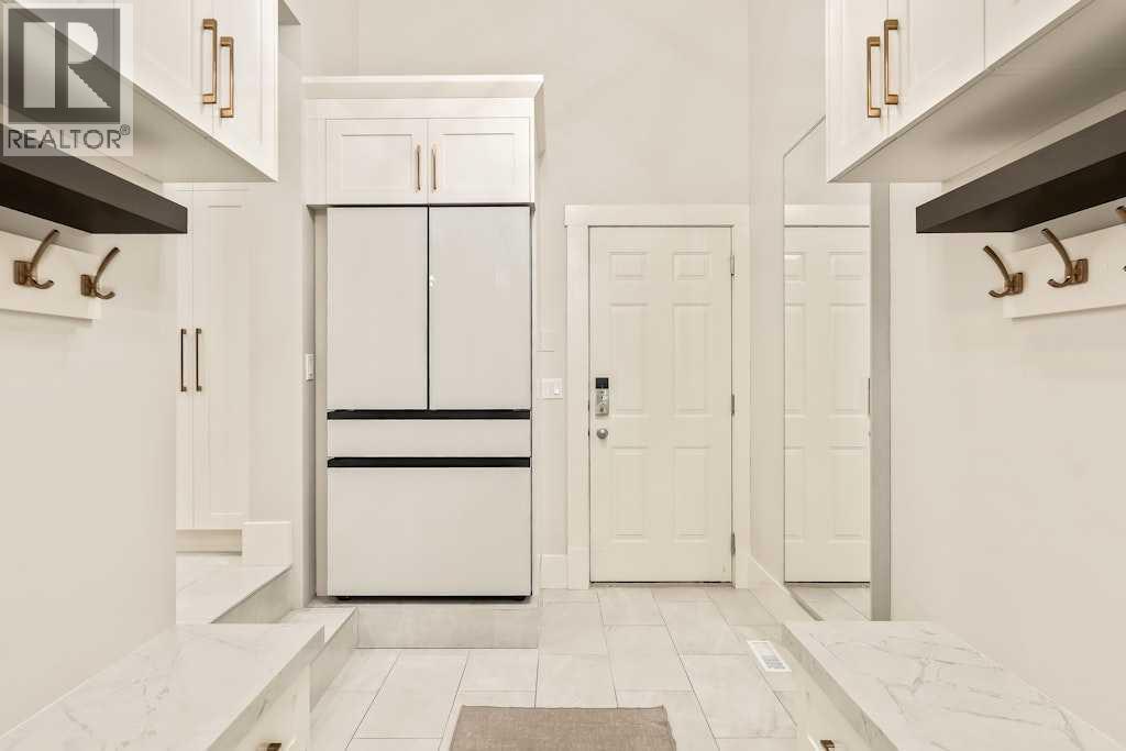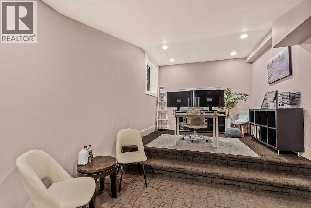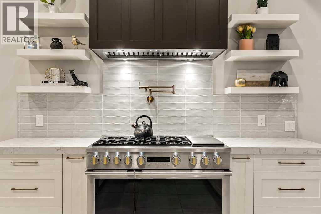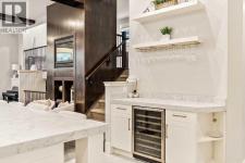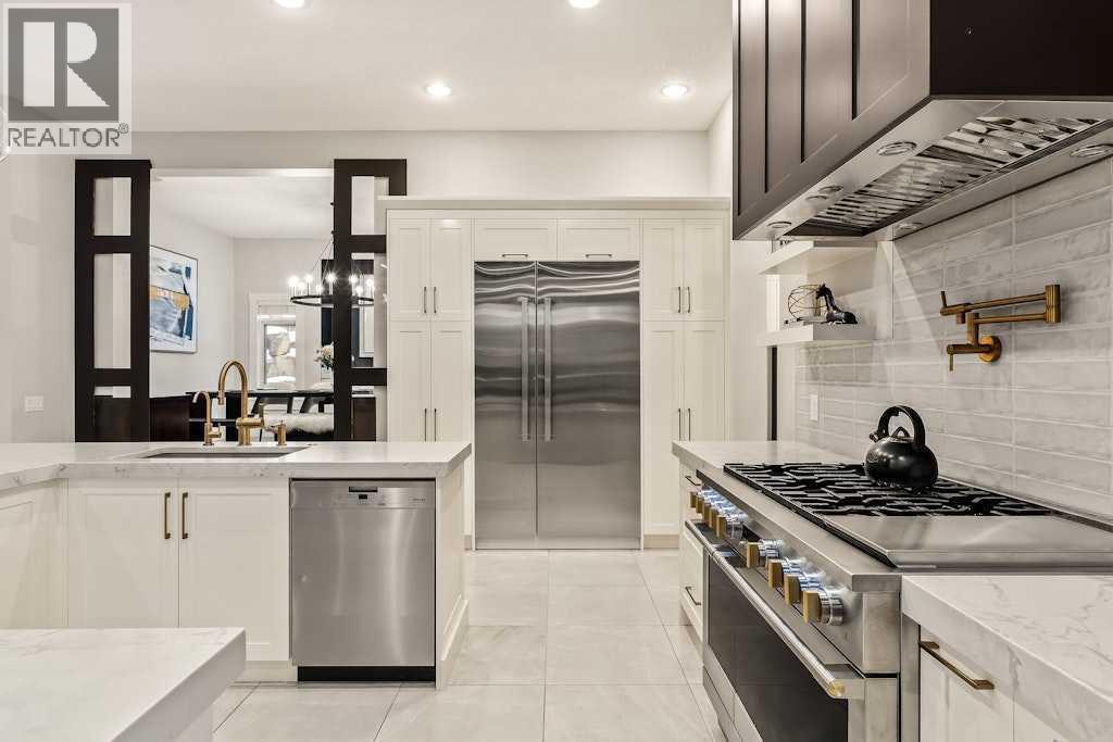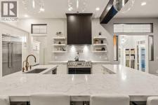 Extensively renovated and impeccably appointed, this architecturally striking five-level split is positioned on a quiet cul-de-sac in Signal Hill, offering almost 3,500sqft above grade and over 5,500sqft total, on a multi-tiered pie shaped lot with multiple outdoor living areas and mountain views. The heart of the home is a the huge custom created kitchen which has been thoughtfully renovated and designed with extensive built-ins, premium stone countertops with a 2.5" mitre edge, and a high-end appliance package including a 48" Monogram gas range, Miele dishwasher, separate built-in JennAir refrigerator and freezer units. A dedicated wine bar with custom cabinetry, new countertops, built-in wine fridge, floating shelves, and hanging wine rack seamlessly connects the kitchen to the dining and living spaces, making it ideal for both everyday living and entertaining. The main living areas are enhanced by custom millwork, updated lighting, and a new fireplace with tile surround, while the dining room features custom built-in cabinetry and lighting. The main floor also features a large private office, tastefully designed powder room, the spacious welcoming foyer, huge mudroom and access to the oversized attached garage. Ceiling heights add to the sense of scale, with approximately 13ft ceilings in the entry, 11ft ceilings on the main level, and 9ft ceilings in the basement. The upper level is anchored by a spacious primary retreat with coffee bar, two walk-in closets full of built-ins, access to the rooftop patio showcasing mountain views, and the ensuite complete with oversized double headed steam shower, dual vanity, heated tile, extra deep soaker tub and designated hair/makeup vanity. Two spacious additional bedrooms, connected by a jack-and-jill bathroom, as well as one of two laundry rooms complete this level. The basement rec room is wide-open and large enough to accommodate the needs of almost anything you can imagine, while still offering a designated gym space, arts&craft room, teen bedroom with its own hangout space, full bathroom, second laundry room and seemingly endless storage space. Practical upgrades include; Hunter Douglas blinds throughout, a radon mitigation system installed in 2022, a new furnace (2024), recently refinished roof top balcony with new TufDek waterproof vinyl decking and the addition of a new 8’ x 8’ patio door enhance flow to the huge outdoor space off the upper living/flex room. Outdoor living is a standout feature, offering multiple exterior spaces including a front porch with gas hookup, oversized entertaining deck, rooftop deck, fenced grass yard, and dedicated dog run. Located close to schools, parks, shopping, and westside amenities, this home represents a rare opportunity to own an extensively renovated, move-in-ready property in one of Calgary’s most established communities. (id:6769)