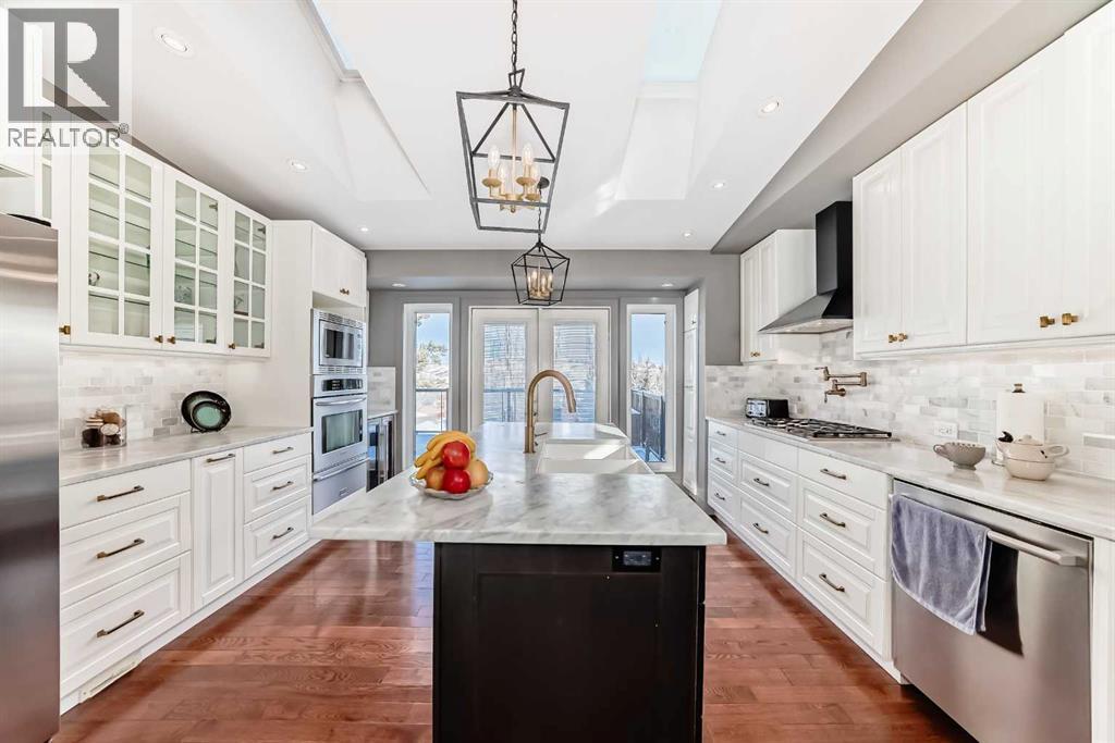 Magnificent Backyard View to this fully updated WALKOUT 5 bedroom bungalow backing onto Green Space, Pathway. Stunning Open Concept Design with vaulted hardwood floors leading into an open concept kitchen/dining/living room with view through the main floor to the beautifully landscaped, secluded back yard with access to the Pathway system.This dream kitchen is thoughtfully designed with a pot filler above the built-in gas cooktop, a dual-temperature beverage and wine fridge tucked beneath the coffee and tea nook, and a warming drawer located under the built-in oven. A large central island features a timeless ceramic apron sink and provides ample seating for several bar stools. The space is completed with an abundance of cabinetry and elegant marble countertops. Overhead, the vaulted ceiling is enhanced by two skylights, one of which opens and closes remotely and is equipped with a rain sensor that automatically closes at the first sign of precipitation. Truly endless possibilities await in this exceptional kitchen.Step through the kitchen’s French doors onto the expansive upper deck that spans the full width of the home, offering outstanding options for entertaining and showcasing beautiful views of the park and beyond. The nighttime city lights create a spectacular backdrop to enjoy and unwind.The main floor is filled with natural light thanks to the abundance of windows and provides an ideal layout for open entertaining or relaxed family living. The primary bedroom features patio doors leading directly to the deck and includes a lovely four-piece ensuite with a storage cabinet. Two additional bedrooms and a four-piece bathroom complete this level.The fully finished walk-out basement, with its separate entrance, adds exceptional versatility. It includes two more bedrooms, a stylish four-piece bathroom, a spacious laundry room, and a recreation room with a separate wet bar area complete with cabinetry and countertops. This space is perfect for older children to host friends or enjoy their own private retreat.Notable updates completed in 2020 include a new furnace and hot water heater. A playground is conveniently located just down the street, while the pathway system behind the home leads to a nearby school and small business centre. Enjoy close proximity to transit, abundant shopping, Stoney Trail Ring Road, Country Hills Boulevard, and a short drive to Calgary International Airport. This BEUTY won't last!! (id:6769)