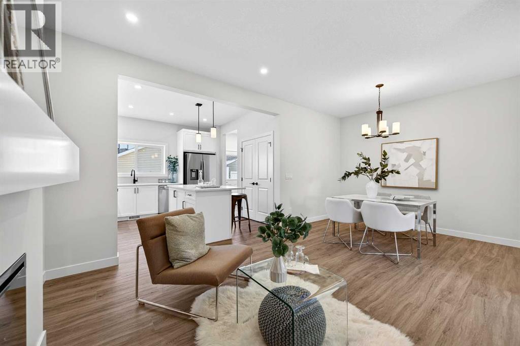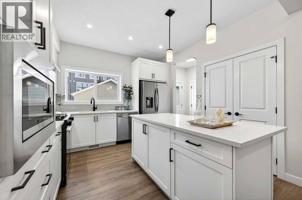 Welcome to The Amber by Genesis Builders, a beautifully designed two-story home offering 1,515 sq. ft. of comfortable living space with an additional unfinished basement with legal basement suite rough-in. The main floor features an open-concept layout with a front flex room, bright great room, and a modern kitchen complete with a central island, quartz countertops, flat-panel cabinetry, and a full stainless steel appliance package. It’s a space that feels inviting and functional, perfect for daily life or entertaining guests. Upstairs, you’ll find three bedrooms, a full bathroom, and a conveniently located laundry area. The spacious primary suite includes a walk-in closet and a private ensuite designed for everyday comfort. This home is equipped with smart-home features including a Ring doorbell, Weiser Smart Code lock, Ecobee thermostat, and Amazon Echo Show. Additional highlights include 9-foot main floor ceilings, upgraded railing, a BBQ gas line, rough-in gas line for the range and a 10' x 10'. The exterior showcases Hardie board siding with Smartboard trim and durable vinyl accents. Located near future parks, pathways, and community amenities, The Amber combines modern design, quality craftsmanship, and lasting value in the heart of Keystone Creek. *Photos are representative and may not reflect the exact finishes of this home. Mood board for colours and selections are in the photos. Rms calculated from builder blueprints provided by the builder. Possession is tentative and scheduled for September 2026. (id:6769)