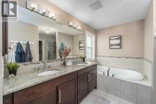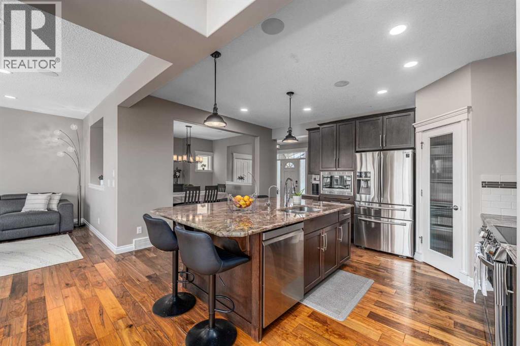 LAKE COMMUNITY | WALKOUT BASEMENT | 5 BEDROOMS | BACKING ONTO PARK & PATHWAY. This home has it all! Check out the virtual tour!Nestled in the highly sought-after, family-friendly lake community of Auburn Bay, this stunning home offers over 3,800 sq. ft. of living space with 4 bedrooms up and a fully finished walkout basement. Step inside to a bright and inviting layout featuring warm hardwood floors, large windows, and a two-sided gas fireplace that elegantly connects the living room and flex area - perfect as a sitting area, office/homework space or cozy reading nook. The kitchen is a chef’s delight, showcasing granite countertops, full-height maple cabinetry with soft-close drawers, stainless steel appliances, a corner pantry, and a large island with seating for five. Enjoy serene views of the landscaped backyard and pathway from the spacious upper deck.Upstairs, retreat to a luxurious primary suite with a spa-inspired ensuite, along with three additional bedrooms, a bonus room, and a convenient upper laundry room. The walkout basement - now featuring brand-new carpet - offers a large recreation room, a fifth bedroom, and a full bathroom, ideal for guests or extended family. Outside, you’ll love the hot tub with privacy enclosure, stone patio, pergola, and direct access to the park and walking path. The heated double garage includes epoxy flooring and a utility sink. Additional features include central A/C and exterior Gem Lights.Enjoy year-round lake access with swimming, paddleboarding, and skating just minutes away. Don’t miss your chance to live in one of Calgary’s most desirable communities—Auburn Bay! (id:6769)