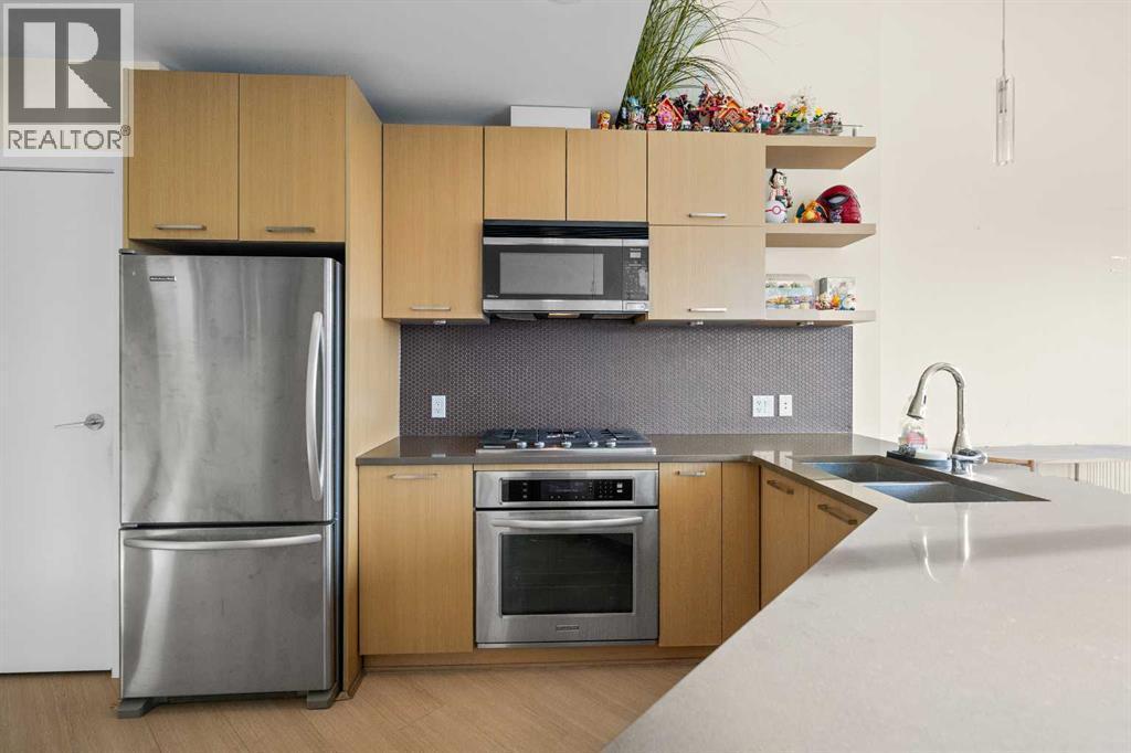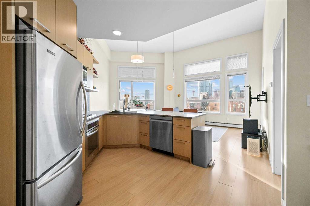 | MOTIVATED SELLER | 2 TITLED PARKING SPOTS SIDE BE SIDE | FURNITURES INCLUDES DINING TABLE SET, LIVING ROOM COUCH, TV WALL MOUNT, PORTABLE A/C, WASHROOM STORAGE CABINET, & DINING ROOM SHELF | 2024 DISHWASHER & 2024 WASHER & DRYER | Perched atop the hill between Bridgeland and Renfrew, this southwest-facing penthouse offers sweeping downtown city views through dramatic 13 foot ceilings. A rare highlight, the home includes two titled parking stalls, an exceptional feature for the building. Meticulously maintained, the unit showcases stainless steel appliances, elegant quartz countertops, full tub to ceiling tile in the bathroom, and 2023 carpet in both the bedroom and walk through closet.Renowned as one of the most functional floor plans in the development, the layout provides abundant storage, a spacious walk-through closet, and a conveniently designed bathroom with dual access from both the bedroom and main living area. The open concept kitchen, living, and dining spaces are bathed in natural light and seamlessly frame the stunning city skyline.Building amenities include two fully equipped gyms, car and dog wash stations, visitor parking, and generous bike storage offering both comfort and convenience in an unbeatable location. (id:6769)