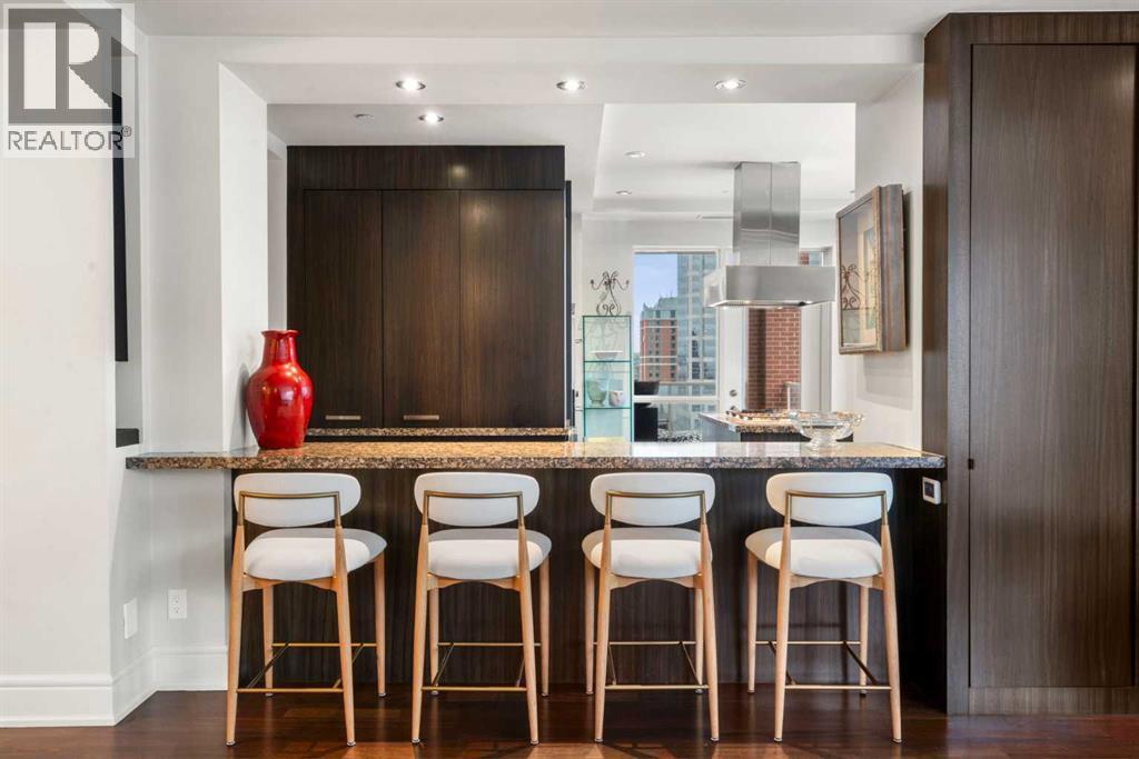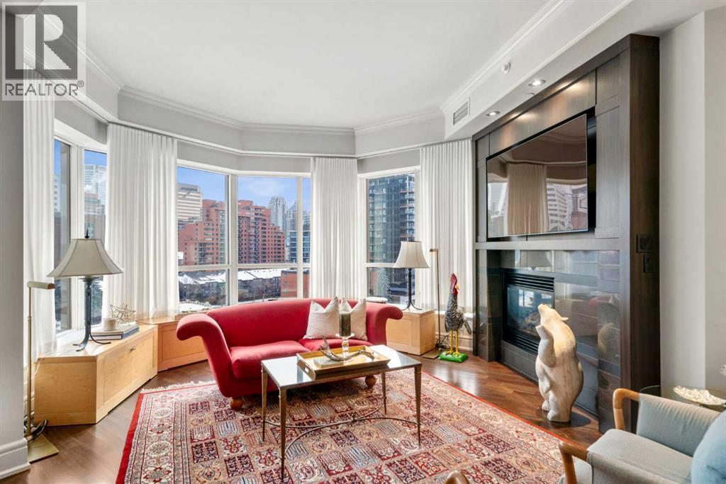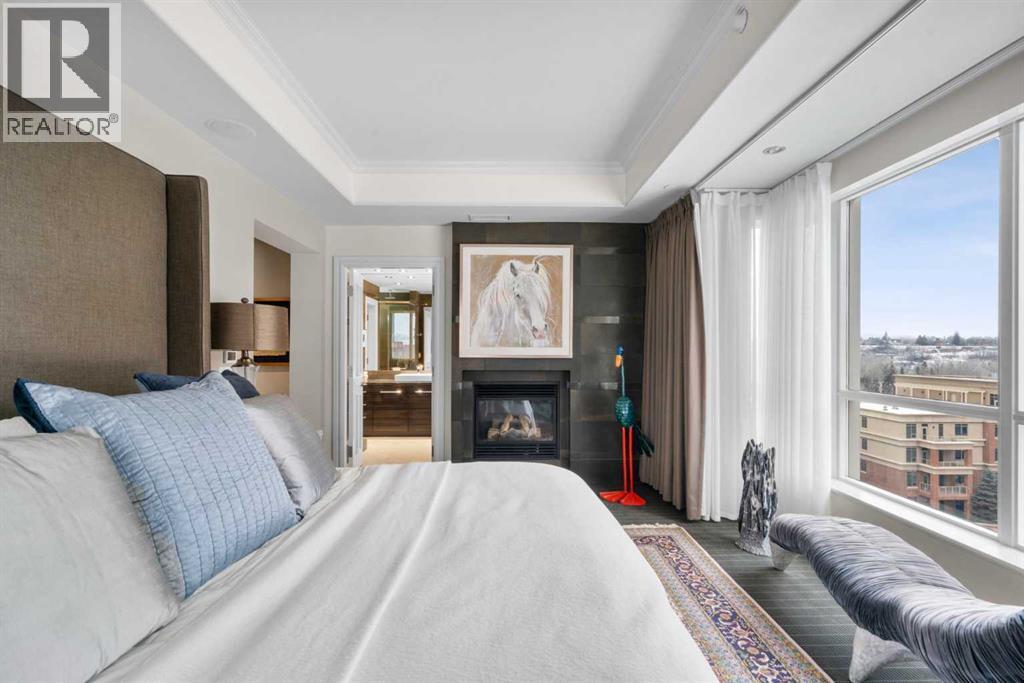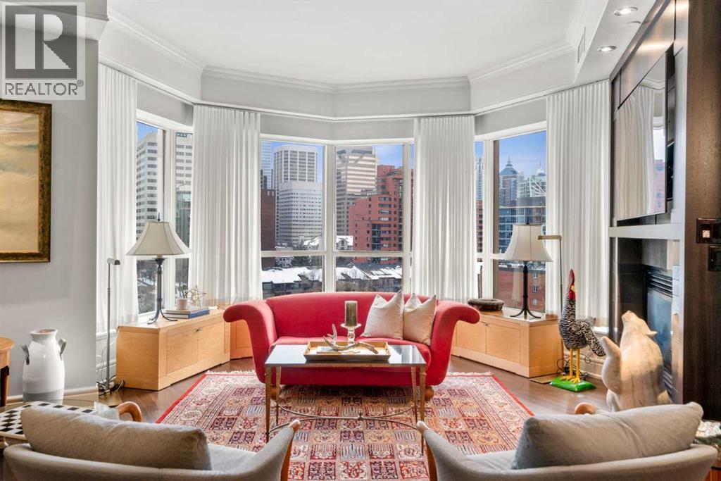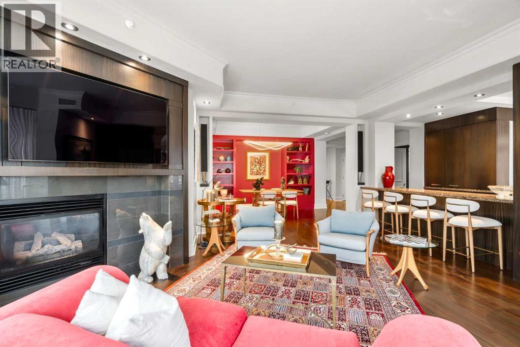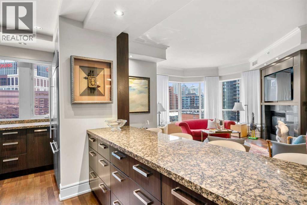 Welcome to Princeton Hall, one of Calgary’s most prestigious and renowned residential addresses, ideally situated in the heart of Eau Claire, directly along the Bow River and Prince’s Island Park. This exceptional 8th-floor, southwest-facing corner residence offers 1716 sq. ft. of luxurious living space, flooded with natural light through expansive floor-to-ceiling windows showcasing breathtaking views of the river, park, and downtown skyline. Meticulously redesigned by pre-eminent interior designer Douglas Cridland, the home is a refined contemporary masterpiece featuring rich solid hardwood flooring, exotic zebra wood paneling, custom solid wood built-ins, coffered ceilings, gas fireplaces, B&O sound system, luxurious wool carpeting in the bedrooms, Hunter Douglas window coverings, and central AC. The open concept living and dining areas are ideal for both elegant entertaining and everyday comfort featuring floor to ceiling windows, fireplace with custom feature wall, plus feature shelving in the dining area. The primary suite is a private retreat, totally separated from the main living area, featuring two walls of windows, a dual sided fireplace to the ensuite, wall-mounted TV, boutique style wood paneled walk-in closet, in addition to a full wall of built-in drawers and cabinets, custom blinds, a spa-inspired 5-piece ensuite with freestanding wet tub, multiple head walk-in shower, granite counters, private water closet and granite tiled walls. The second bedroom / den showcases stunning wood paneling, plus discreetly concealed 3 piece ensuite and closets. The gourmet kitchen impresses with extensive custom cabinetry, thick granite counters, an oversized storage rich island, dual sized deep sink, professional appliances including gas cooktop with designer hood fan, built-in wall oven, microwave/oven, warming drawer, wine and bar fridges, Monogram fridge, dishwasher, and sleek aluminum pull-down cabinet doors that allow the storage to be concealed. The unique eat ing bar affords additional storage. The generous covered terrace with a gas BBQ line extends the living space. The beautifully finished service room combines in-suite laundry and storage. Exclusive features include private elevator access directly into the suite, two titled heated underground parking stalls, and an oversized titled storage locker. Princeton Hall offers a truly elevated lifestyle with 24 hour concierge, grand two story lobby, fitness center with steam and sauna, temperature controlled wine cellar and tasting room, private function and board rooms, owner’s lounge, guest suite, visitor parking, and a heated underground parkade with car wash. Steps from river pathways, downtown offices, boutique shopping, fine dining, Kensington, and major routes, this remarkable residence presents a rare opportunity to own an extraordinary home in one of Western Canada’s most distinguished condominium developments. (id:6769)