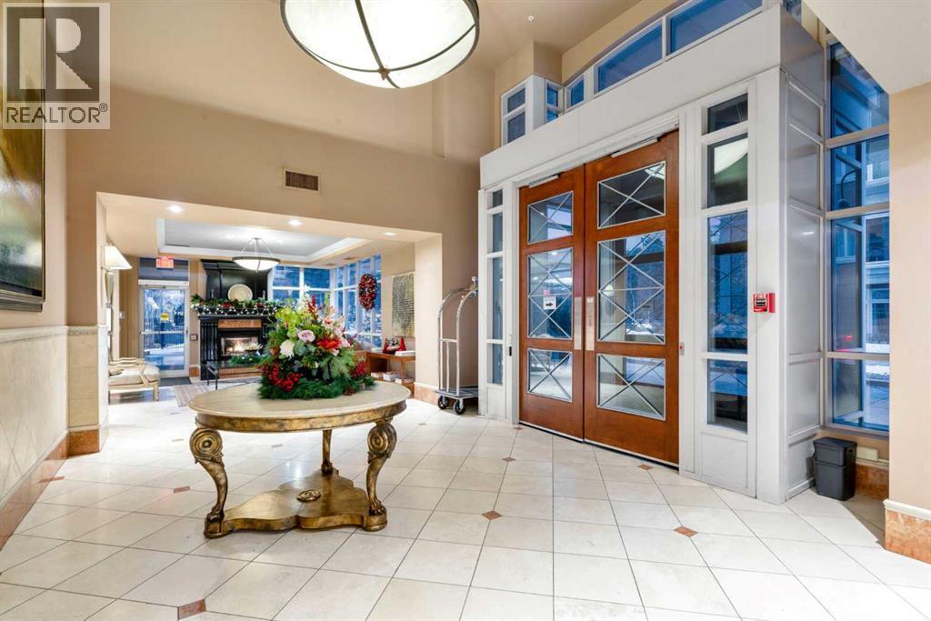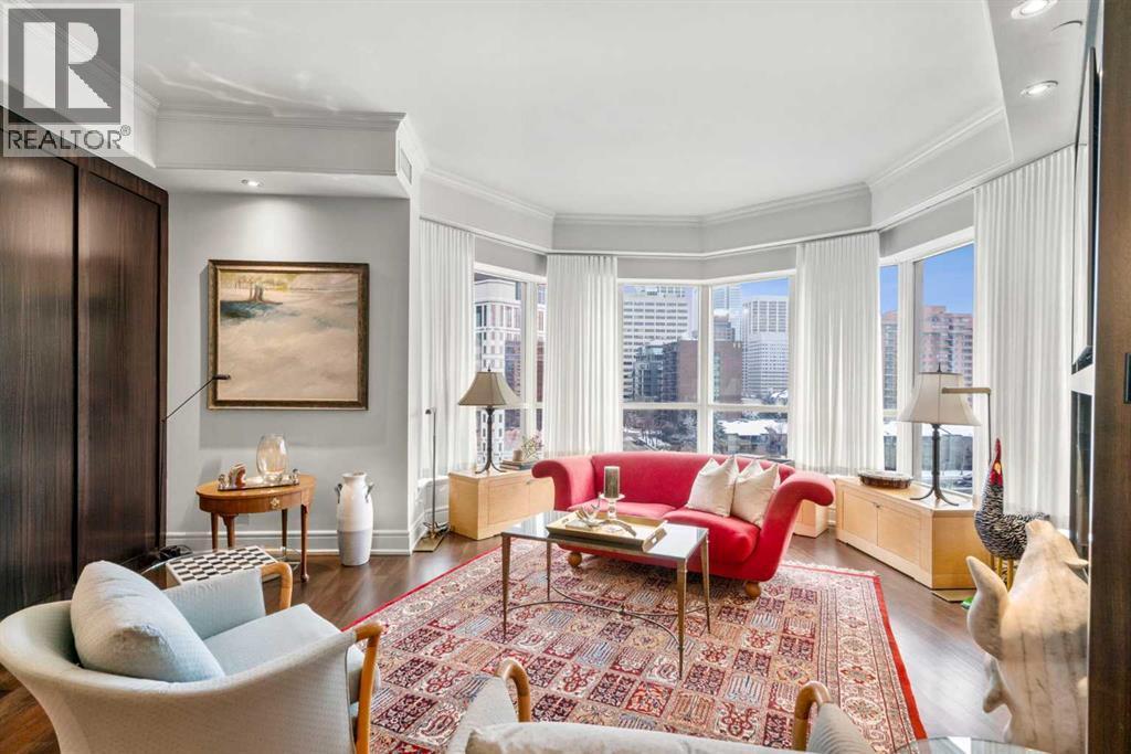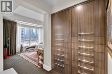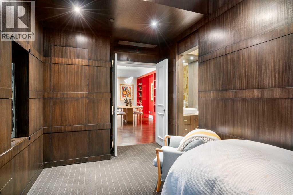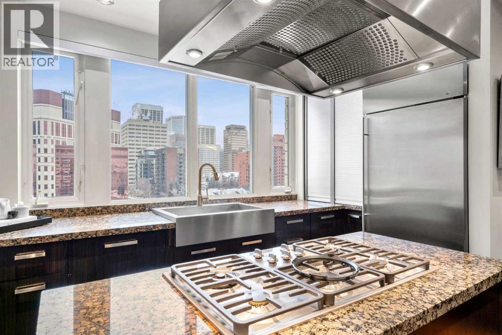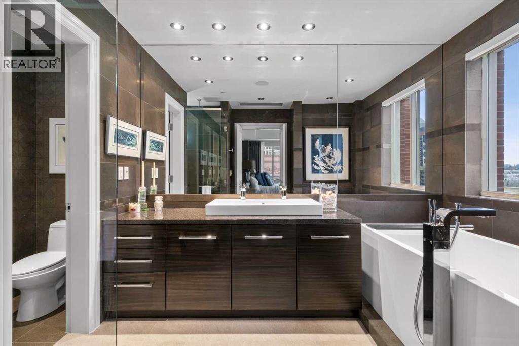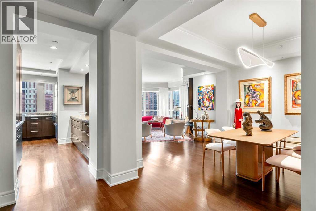 Welcome to Princeton Hall, one of Calgary’s most prestigious and renowned residential addresses, ideally situated in the heart of Eau Claire, directly along the Bow River and Prince’s Island Park. This exceptional 8th-floor, southwest-facing corner residence offers 1716 sq. ft. of luxurious living space, flooded with natural light through expansive floor-to-ceiling windows showcasing breathtaking views of the river, park, and downtown skyline. Meticulously redesigned by pre-eminent interior designer Douglas Cridland, the home is a refined contemporary masterpiece featuring rich solid hardwood flooring, exotic zebra wood paneling, custom solid wood built-ins, coffered ceilings, gas fireplaces, B&O sound system, luxurious wool carpeting in the bedrooms, Hunter Douglas window coverings, and central AC. The open concept living and dining areas are ideal for both elegant entertaining and everyday comfort featuring floor to ceiling windows, fireplace with custom feature wall, plus feature shelving in the dining area. The primary suite is a private retreat, totally separated from the main living area, featuring two walls of windows, a dual sided fireplace to the ensuite, wall-mounted TV, boutique style wood paneled walk-in closet, in addition to a full wall of built-in drawers and cabinets, custom blinds, a spa-inspired 5-piece ensuite with freestanding wet tub, multiple head walk-in shower, granite counters, private water closet and granite tiled walls. The second bedroom / den showcases stunning wood paneling, plus discreetly concealed 3 piece ensuite and closets. The gourmet kitchen impresses with extensive custom cabinetry, thick granite counters, an oversized storage rich island, dual sized deep sink, professional appliances including gas cooktop with designer hood fan, built-in wall oven, microwave/oven, warming drawer, wine and bar fridges, Monogram fridge, dishwasher, and sleek aluminum pull-down cabinet doors that allow the storage to be concealed. The unique eat ing bar affords additional storage. The generous covered terrace with a gas BBQ line extends the living space. The beautifully finished service room combines in-suite laundry and storage. Exclusive features include private elevator access directly into the suite, two titled heated underground parking stalls, and an oversized titled storage locker. Princeton Hall offers a truly elevated lifestyle with 24 hour concierge, grand two story lobby, fitness center with steam and sauna, temperature controlled wine cellar and tasting room, private function and board rooms, owner’s lounge, guest suite, visitor parking, and a heated underground parkade with car wash. Steps from river pathways, downtown offices, boutique shopping, fine dining, Kensington, and major routes, this remarkable residence presents a rare opportunity to own an extraordinary home in one of Western Canada’s most distinguished condominium developments. (id:6769)