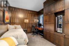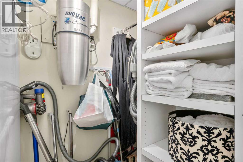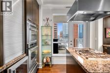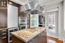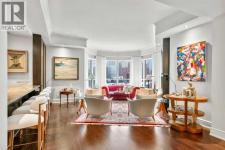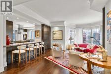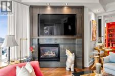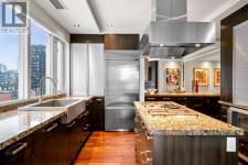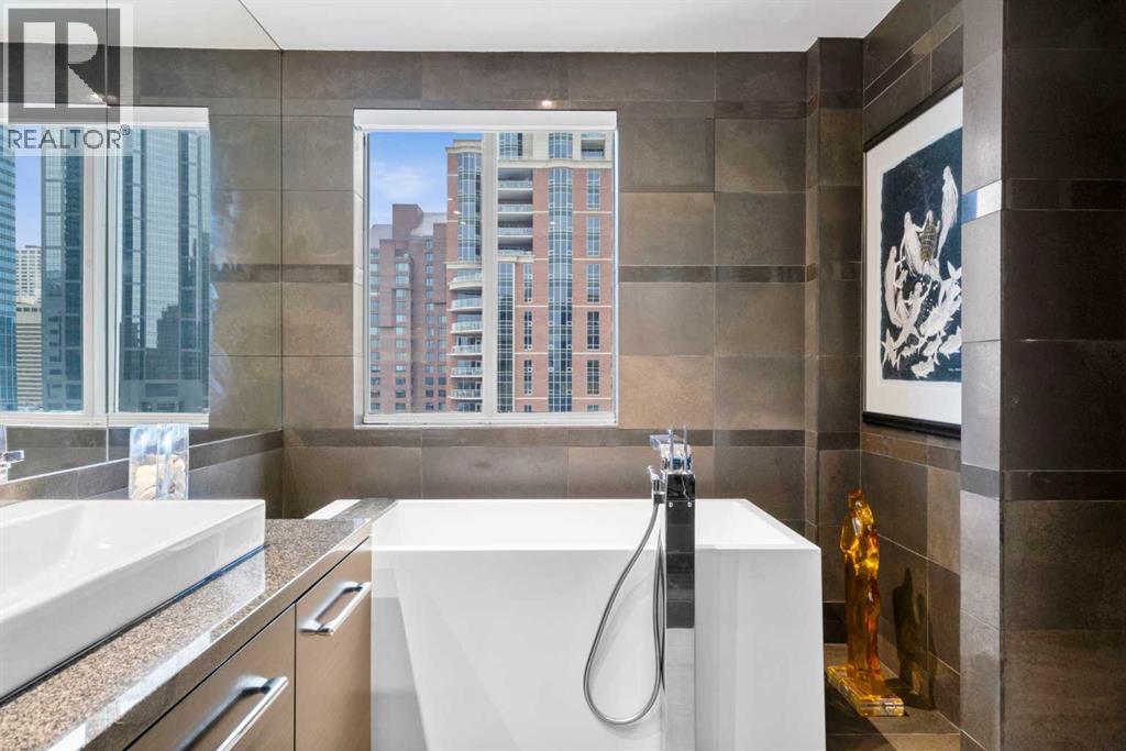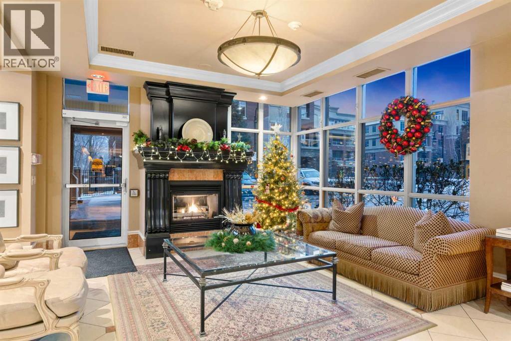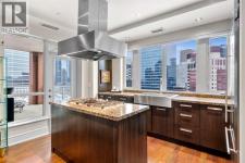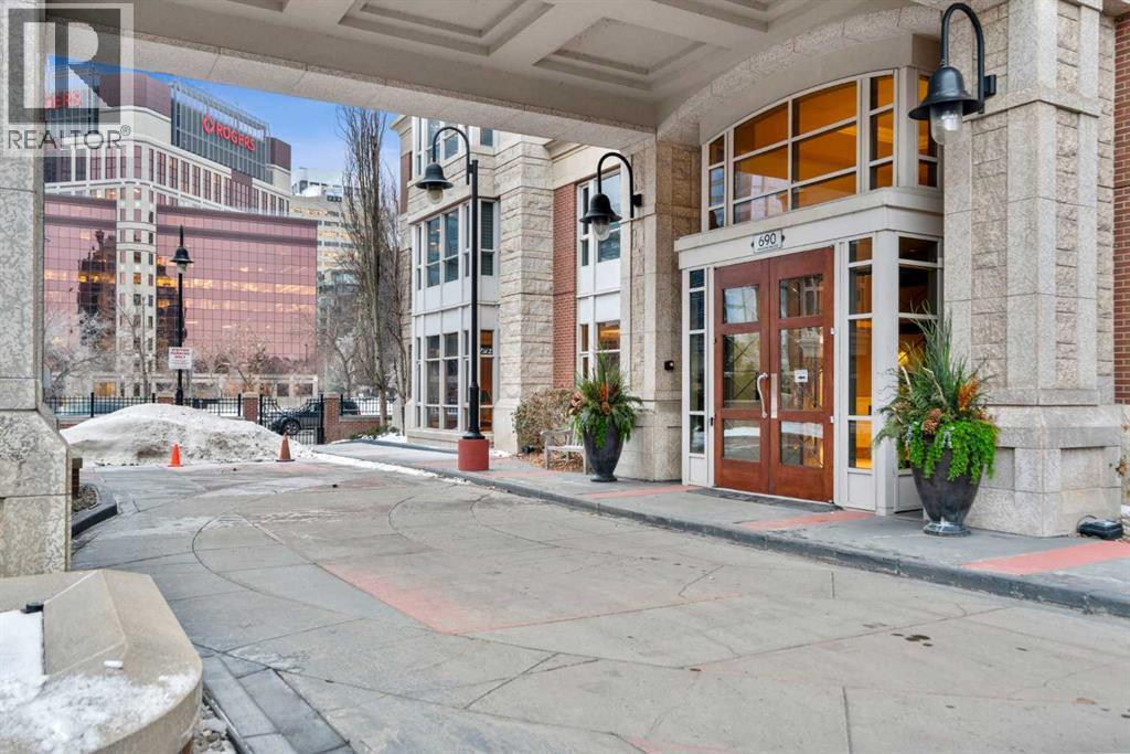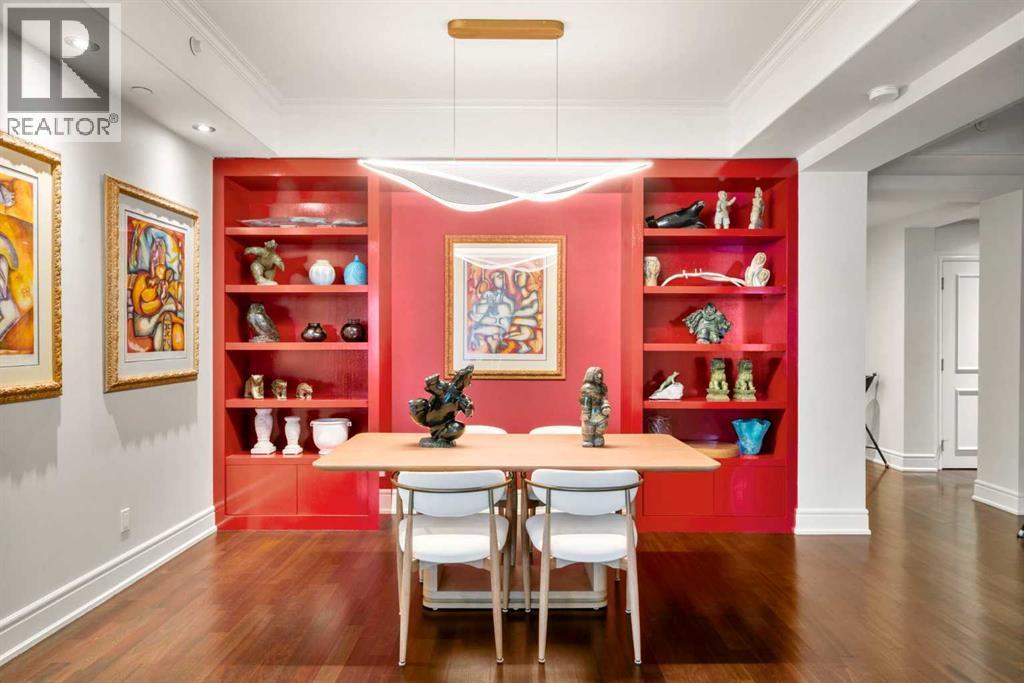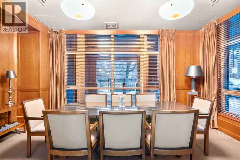 Welcome to Princeton Hall, one of Calgary’s most prestigious and renowned residential addresses, ideally situated in the heart of Eau Claire, directly along the Bow River and Prince’s Island Park. This exceptional 8th-floor, southwest-facing corner residence offers 1716 sq. ft. of luxurious living space, flooded with natural light through expansive floor-to-ceiling windows showcasing breathtaking views of the river, park, and downtown skyline. Meticulously redesigned by pre-eminent interior designer Douglas Cridland, the home is a refined contemporary masterpiece featuring rich solid hardwood flooring, exotic zebra wood paneling, custom solid wood built-ins, coffered ceilings, gas fireplaces, B&O sound system, luxurious wool carpeting in the bedrooms, Hunter Douglas window coverings, and central AC. The open concept living and dining areas are ideal for both elegant entertaining and everyday comfort featuring floor to ceiling windows, fireplace with custom feature wall, plus feature shelving in the dining area. The primary suite is a private retreat, totally separated from the main living area, featuring two walls of windows, a dual sided fireplace to the ensuite, wall-mounted TV, boutique style wood paneled walk-in closet, in addition to a full wall of built-in drawers and cabinets, custom blinds, a spa-inspired 5-piece ensuite with freestanding wet tub, multiple head walk-in shower, granite counters, private water closet and granite tiled walls. The second bedroom / den showcases stunning wood paneling, plus discreetly concealed 3 piece ensuite and closets. The gourmet kitchen impresses with extensive custom cabinetry, thick granite counters, an oversized storage rich island, dual sized deep sink, professional appliances including gas cooktop with designer hood fan, built-in wall oven, microwave/oven, warming drawer, wine and bar fridges, Monogram fridge, dishwasher, and sleek aluminum pull-down cabinet doors that allow the storage to be concealed. The unique eat ing bar affords additional storage. The generous covered terrace with a gas BBQ line extends the living space. The beautifully finished service room combines in-suite laundry and storage. Exclusive features include private elevator access directly into the suite, two titled heated underground parking stalls, and an oversized titled storage locker. Princeton Hall offers a truly elevated lifestyle with 24 hour concierge, grand two story lobby, fitness center with steam and sauna, temperature controlled wine cellar and tasting room, private function and board rooms, owner’s lounge, guest suite, visitor parking, and a heated underground parkade with car wash. Steps from river pathways, downtown offices, boutique shopping, fine dining, Kensington, and major routes, this remarkable residence presents a rare opportunity to own an extraordinary home in one of Western Canada’s most distinguished condominium developments. (id:6769)