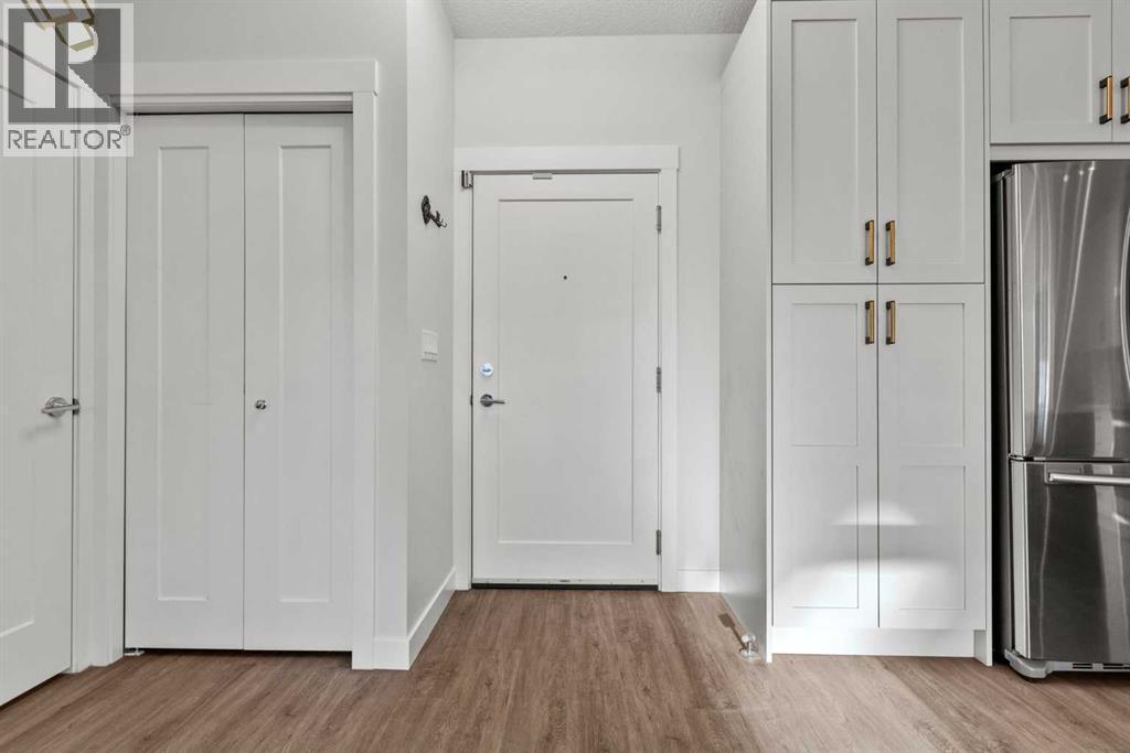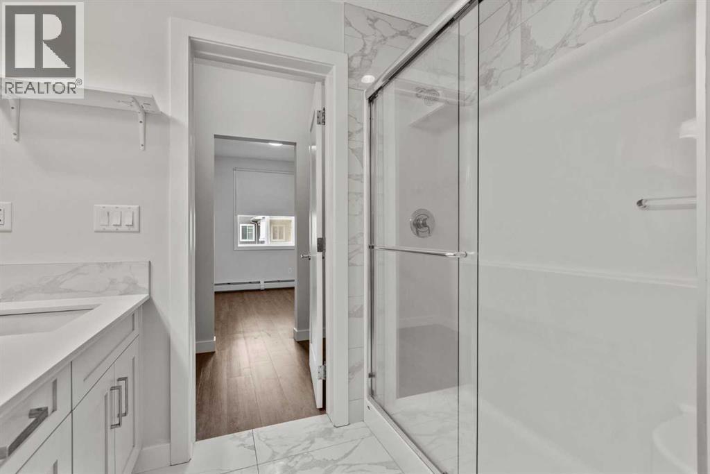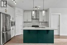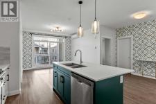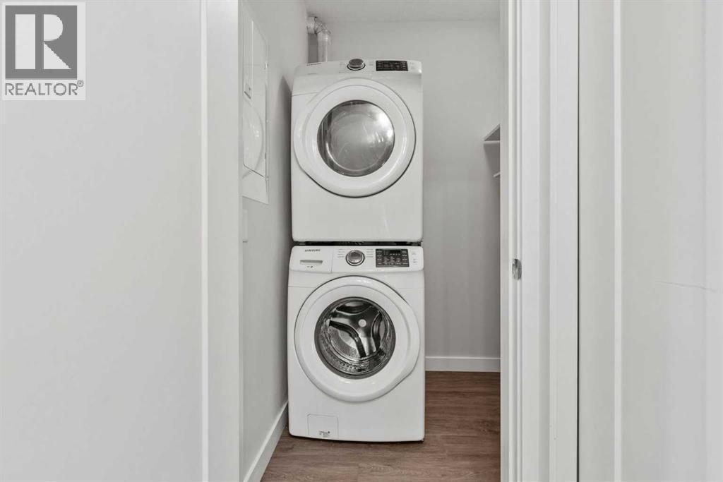 Welcome to Cranston Ridge — where modern style meets everyday convenience!This STUNNING 2-bedroom, 2-bathroom condo showcases an open floor plan, wide-plank flooring, and plenty of natural light. The UPGRADED & EXTENDED KITCHEN impresses with QUARTZ countertops, stainless steel appliances, a corner pantry, tile backsplash, built-in microwave, and a welcoming eat-up bar at the spacious kitchen island. Two-tone cabinetry and a designer accent wall add a touch of flair.The bright living area opens to a private balcony with a natural gas hookup—perfect for barbecuing or relaxing outdoors. The spacious primary suite fits a king bed and features a WALK-THROUGH CLOSET and 4-piece ensuite with a glass shower and separate tub. A second bedroom, full bath, and in-suite laundry complete the layout.Enjoy AIR CONDITIONING, TITLED UNDERGROUND PARKING, and a separate storage locker. Ideally located near shops, restaurants, parks, and major roadways, this home offers the perfect blend of comfort and convenience in sought-after Cranston Ridge! (id:6769)