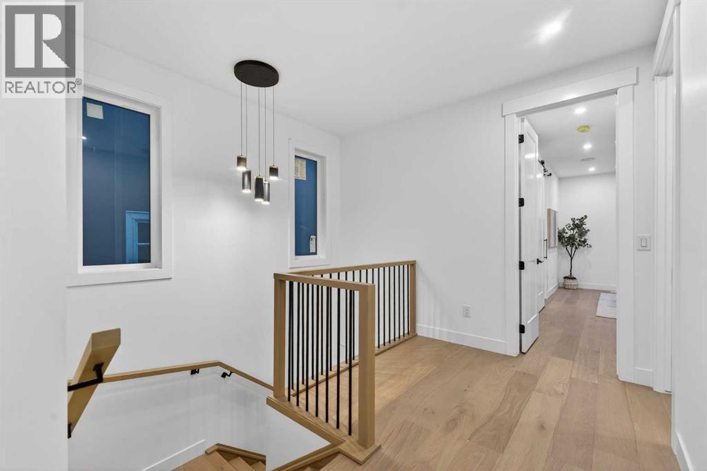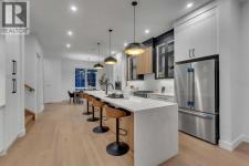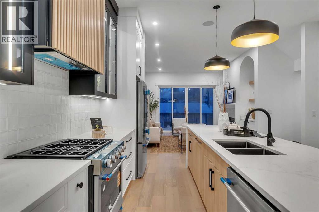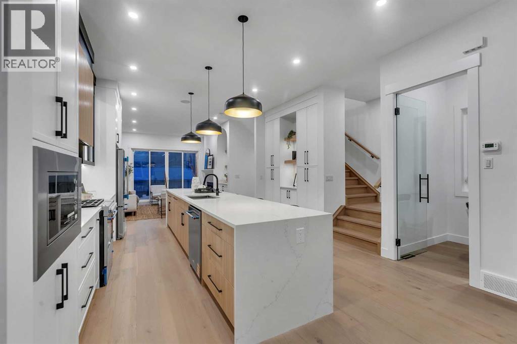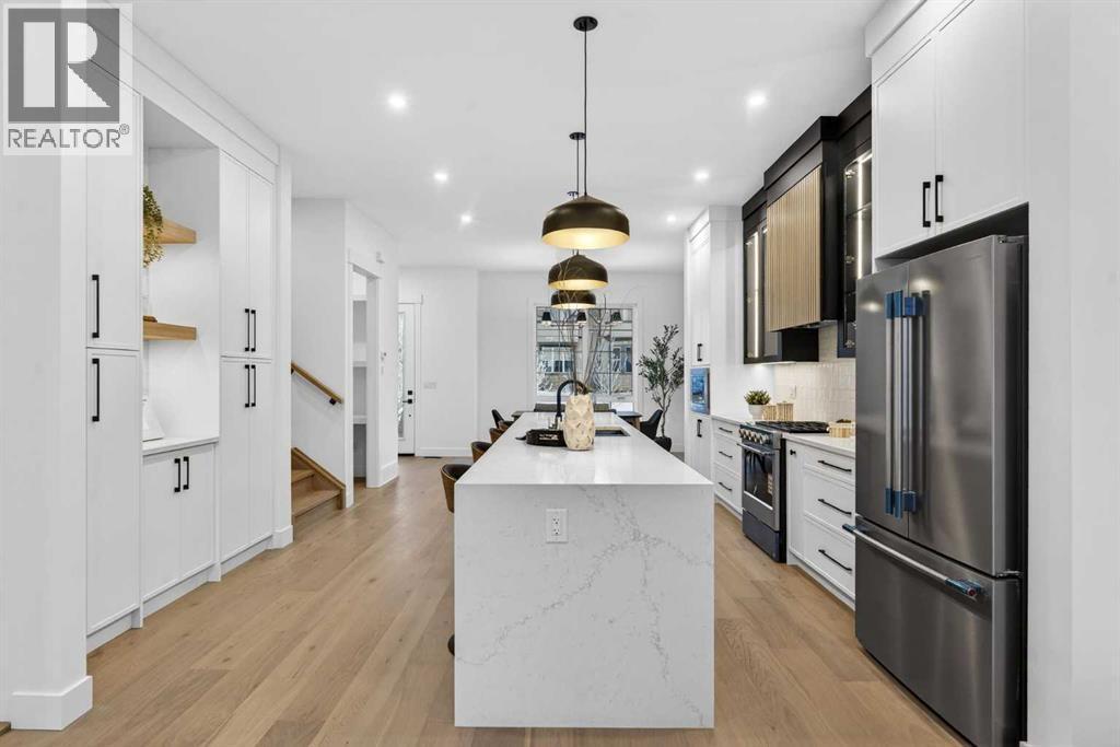 OPEN HOUSE JAN 31ST 12-3PM **FREE A/C INSTALLED IF THE SALE IS FIRM BEFORE FEBRUARY 15TH** IMMEDIATE POSSESSION AVAILABLE | 4 BEDROOMS | 3.5 BATHROOMS | WALK-OUT BASEMENT WITH GYM, REC ROOM & WET BAR | SUNNY SOUTH FACING BACKYARD WITH DOWNTOWN VIEWS | Welcome to this brand-new, move-in ready infill that perfectly blends modern sophistication with smart, functional design and an open concept layout. This home has been thoughtfully curated with high-end finishes, tons of natural light, and a layout that combines luxury with practicality. Stepping inside, you're greeted with soaring 10-foot ceilings and expansive windows bringing in an array of natural light. The open-concept main floor flows seamlessly, starting with a welcoming foyer featuring custom built-in cabinetry and a bench - offering convenience, storage, and a stylish first impression. The dining area, bathed in sunlight, sets the tone for everything from casual family dinners to elegant hosting. Just steps away from the dining area - the gourmet kitchen is a true centrepiece and a chef's dream. The kitchen boasts floor-to-ceiling custom cabinetry, quartz countertops, LED under-cabinet and built-in lighting, and top-tier KitchenAid stainless steel appliances. A striking and expansive waterfall island anchors the space - perfect for prepping meals, morning coffees, evening cocktails, or just to get some work done. Extras like a built-in pantry with custom cabinetry, tiled coffee station, and floating shelves with integrated lighting elevate both form and function. Just off the kitchen, you have your own private home office offering a custom glass door and providing a quiet retreat for remote work or study. The spacious living room features a stunning tiled fireplace and oversized double sliding glass patio doors that extend your living space outdoors to the backyard patio offering downtown views - ideal for summer entertaining, morning coffees, or quiet evenings. A well-designed mudroom with built-in cabinets provides additional storage space and helps keep daily essentials organized. A chic powder room with a quartz vanity, designer fixtures, LED under lighting, and stunning wallpaper adds a refined touch to the main floor. Upstairs, the primary suite is a showstopper. Custom detailing, an expansive walk-in closet, and a spa-inspired ensuite with IN-FLOOR HEATING, a quartz double vanity, LED accent lighting, backlit mirror, free-standing tub, and oversized glass shower make this a true retreat. Two additional bedrooms, each with their own spacious walk-in closets, provide cozy, private spaces and share a beautifully appointed four-piece bathroom. A dedicated laundry room with custom cabinetry, quartz countertops, and a sink finish off this masterful upper level. The fully finished WALK-OUT basement is thoughtfully designed and features an additional bedroom, four-piece bathroom, gym/exercise area, a wet bar, and recreation area perfect for additional living space. (id:6769)