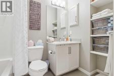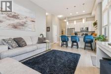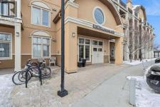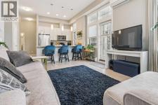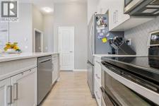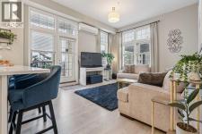 Step into this showcase worthy main floor corner unit offering almost 900 sq ft of bright, open concept living. Soaring 11 foot ceilings and floor-to-ceiling windows flood the space with natural light, creating an airy, upscale feel the moment you walk in. The modern white chef inspired kitchen features sleek quartz countertops, stainless steel appliances, and plenty of cabinetry perfect for cooking, hosting, or enjoying a quiet night in. The layout is ideal with two spacious bedrooms positioned on opposite sides of the unit for added privacy, along with two full bathrooms, including a stylish ensuite. Enjoy the convenience of in-suite laundry, durable mahogany-tone vinyl flooring, and the comfort of being on the main floor, no elevators needed. As a corner unit, you benefit from extra windows, enhanced privacy, and additional outdoor exposure. Located just steps from shopping, restaurants, transit, and daily amenities, this home blends modern style with unbeatable convenience. Perfect for first time buyers, downsizers, or investors. (id:6769)