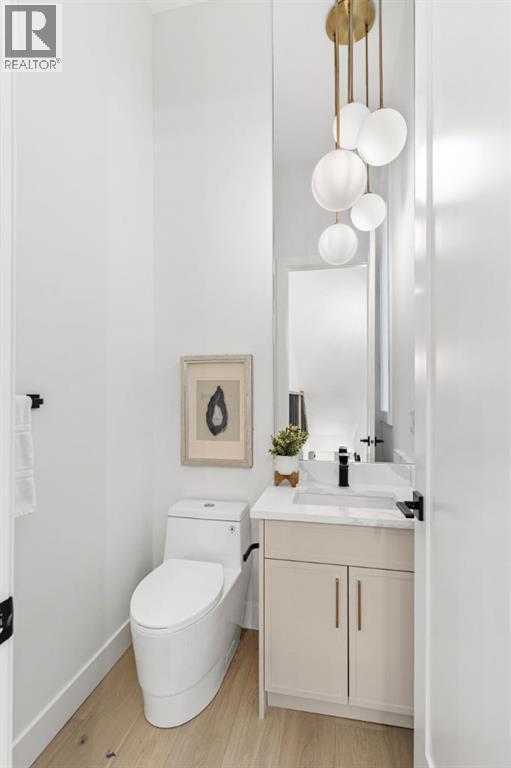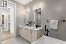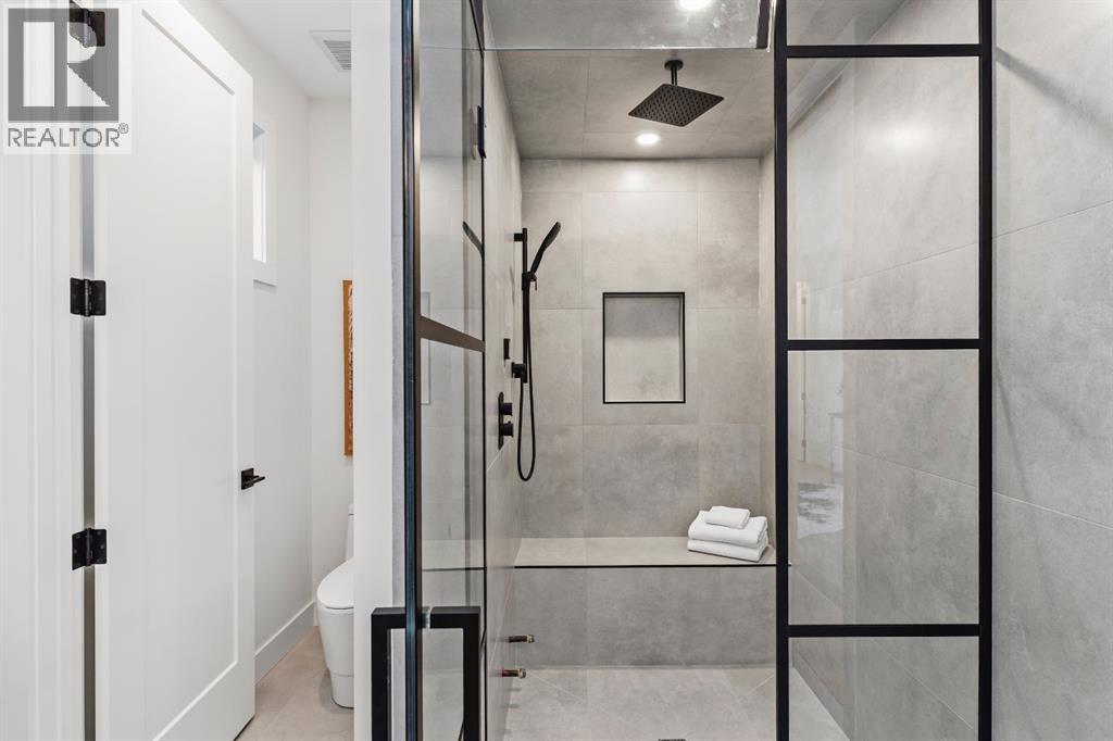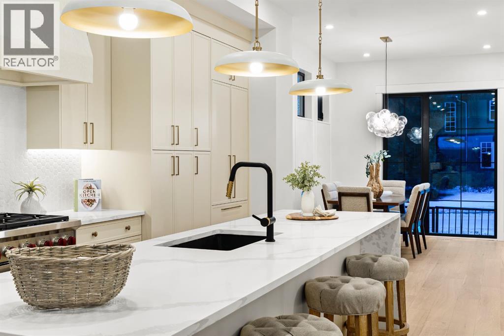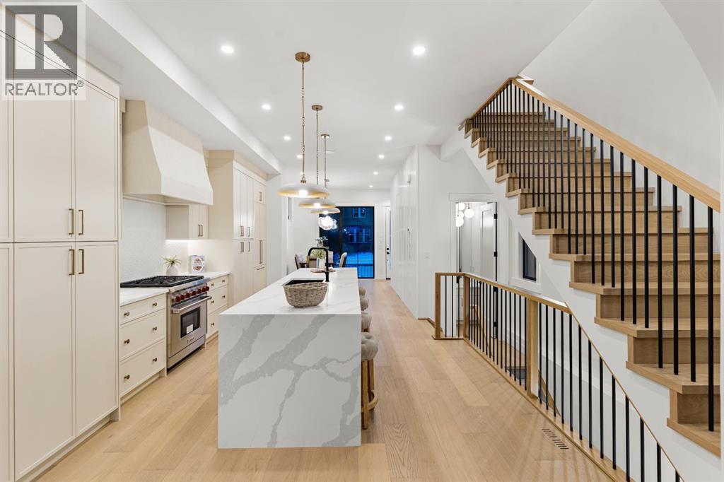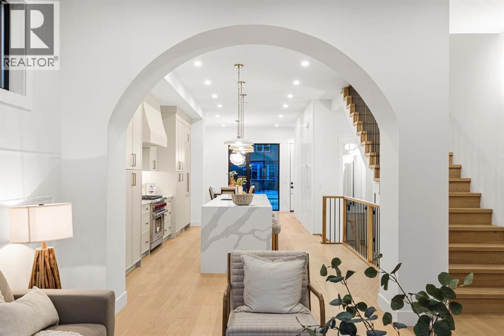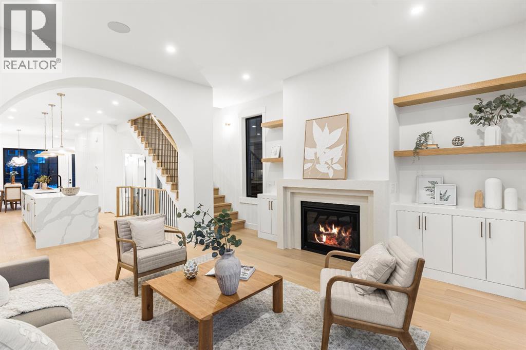 This extraordinary brick-exterior home is set in one of the most desirable locations and built by Jerry Homes with a thoughtfully designed, functional floor plan. A spacious foyer welcomes you into the main level with soaring 10-foot ceilings, a dining area accented with custom wainscoting, and a stunning kitchen featuring a massive 12-foot island, hidden walk-in pantry, high-end built-in Wolf and Dacor appliances, quartz countertops with under-cabinet lighting, and elegant gold accents. A beautifully crafted archway separates the kitchen from the great room, anchored by a custom multi-tier gas fireplace, while the mudroom provides ample storage. Large windows throughout the home fill every level with natural light, enhancing the open and airy design. Upstairs, 9-foot ceilings frame a lavish primary suite with two large walk-in closets and a spa-inspired 5-piece ensuite fully wrapped in designer tile, complete with steam shower rough-in, in-floor heating, and a soaking tub. Two additional bedrooms, a 3-piece bath, and a full laundry room complete the upper level. The fully developed basement includes in-floor heating rough-in, a spacious rec room, wet bar, fourth bedroom, and a 3-piece bath. Additional features include rough-ins for A/C, built-in ceiling speakers, an alarm system, and exterior cameras. Ideally located near top schools, parks, and the shops and restaurants of Marda Loop, this home blends quiet luxury with unmatched convenience. Call today to book your tour! (id:6769)
