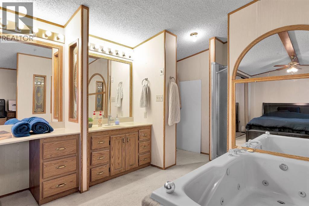 A rare opportunity for first-time buyers to own a detached home under $340,000. Designed for year-round comfort and peace of mind, this home is equipped with air-conditioning and winterized heat tape for cold-weather protection. This well-designed, air-conditioned 1,200 sq. ft. bungalow-style modular home offers 3 bedrooms, 2 full bathrooms, and a bright open-concept layout, situated on fully titled and owned land. Vaulted ceilings and large windows fill the living space with natural light, while the oak kitchen features a skylight, generous pantry, and built-in cabinetry—perfect for everyday living and entertaining.The primary bedroom is a relaxing retreat, featuring a spa-inspired open ensuite design with a two-person jetted soaker tub, separate shower, private toilet area, and dedicated vanity space. Two additional bedrooms are located at the opposite site of the home along with full main bathroom that provides private and comfortable space for family or guests.A rear entrance with built-in storage leads to a separate laundry room with front-load washer and dryer. The property features a beautifully landscaped yard with apple tree and cherry bushes to enjoying the summer, along with patio and two storage sheds for added functionality and outdoor living.Additional highlights include no condo fees or pad rent, asphalt parking, nearby walking paths and green spaces, plus quick access to Stoney Trail, Deerfoot, Peigan Trail, Downtown, Costco, and amenities like schools and restaurants. Move-in ready and offering exceptional value—this is a fantastic entry into detached homeownership. (id:6769)