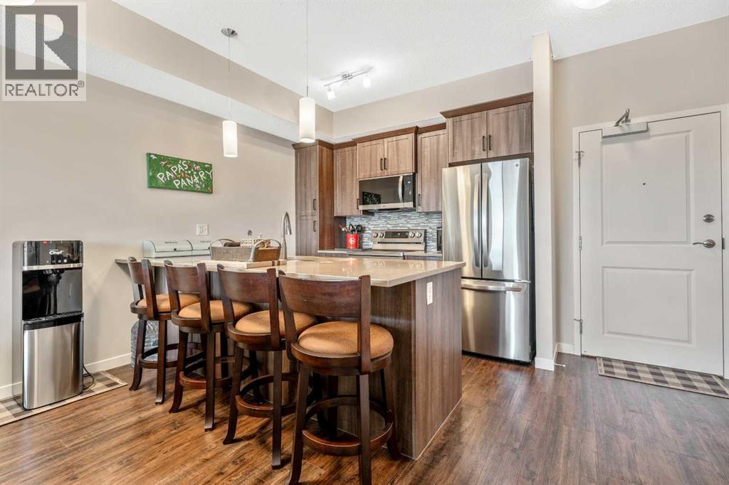 ***Do you ever DREAM of waking up to MILLION $ VIEWS OF THE ROCKY MOUNTAINS from your own bedroom EVERY MORNING?*** WELCOME HOME! This Beautifully RENOVATED & UPDATED PENTHOUSE level unit is all about LOCATION LOCATION LOCATION & WOW... THE VIEW!! Nestled in the PERFECT SPOT on the TOP FLOOR, this meticulously MAINTAINED home exudes style with elevated finishes and boasts nearly 650ft of thoughtfully designed living space, offering a bright, open concept floor plan with 9’ ceilings, Upgraded Soft-close Cabinetry, Rich Vinyl Plank flooring & bathed in natural light! Ideal for entertaining and everyday living, the stylish and modern layout flows seamlessly from the Gourmet CHEF’S Kitchen, complete with elegant QUARTZ countertops, ALL NEW APPLIANCES, an oversized peninsula with convenient eat-up breakfast bar, open to the inviting dining area and living room with Large WINDOWS and a front row seat to Cochrane’s natural scenic landscapes! A Private Master Retreat PLUS versatile Den/Office (or Guest area), chic and Beautifully RENOVATED Bathroom and In-Suite laundry complete the interior of this TURN-KEY GEM! Your private BALCONY, where the Rocky Mountains are your backdrop, offers the ideal spot to BBQ and entertain friends and family, or relax and connect with NATURE! Located in a well-managed, pet-friendly complex (with board approval), this unit also includes your own titled UNDERGROUND HEATED PARKING, DEDICATED STORAGE UNIT and more! Enjoy the comfort and convenience of numerous ON-SITE AMENITIES and everyday essentials, including medical, dental, pharmacy, retail AND MANY MORE right downstairs! Cochrane is known for its distinct Western heritage and friendly small town feel, offering a strong sense of community, nature focused living and outdoor adventure, balanced with modern conveniences with big city access, yet only a short scenic drive to the MOUNTAINS. Simply move in and enjoy everything that living at The Trading Post in Sunset Ridge has to offer! (id:6769)