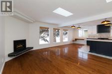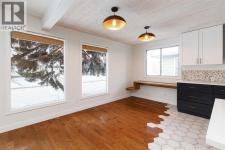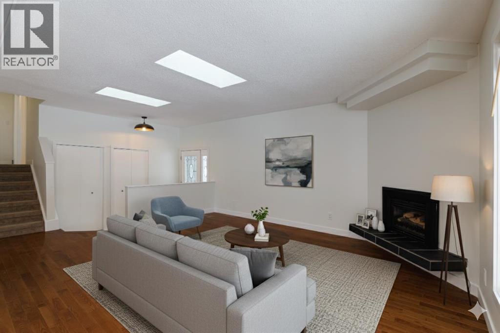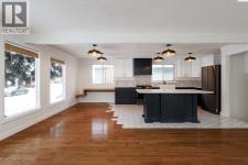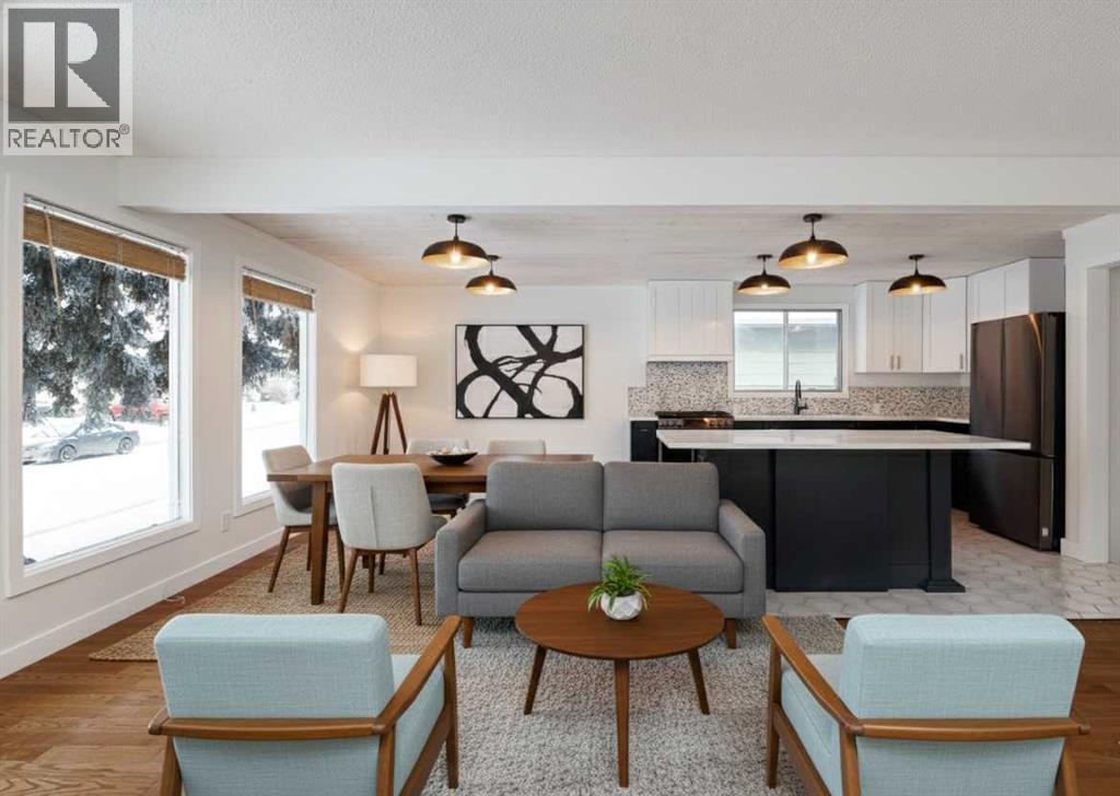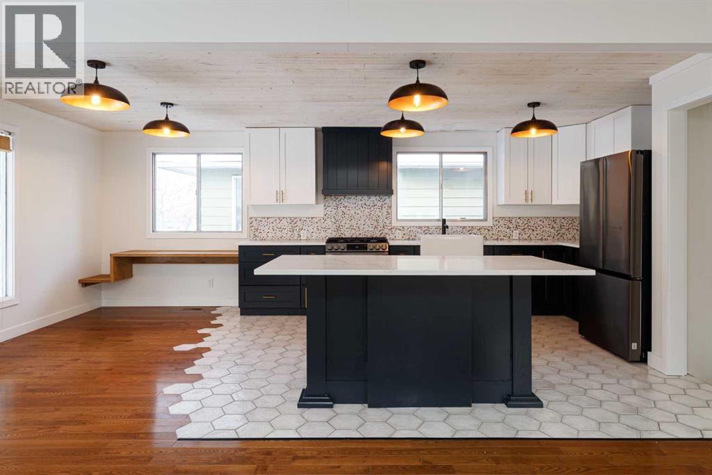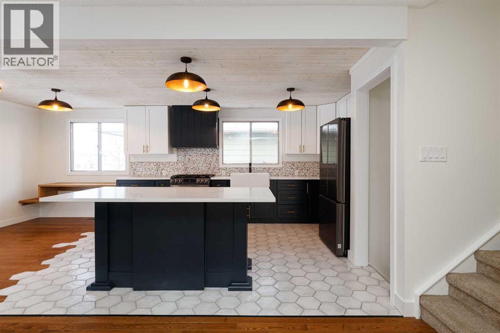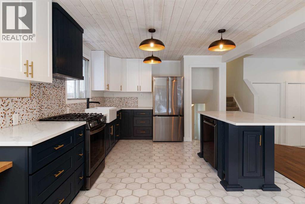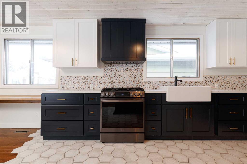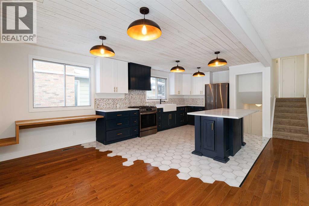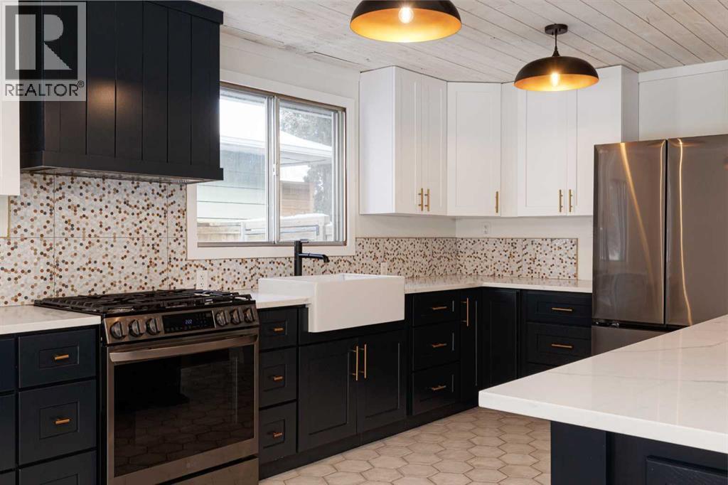 Welcome to this stunningly transformed 4-level split in the heart of Queensland, where mid-century charm meets contemporary luxury. No expense was spared in this top-to-bottom renovation, offering 1,738 square feet of finished living space. The main floor is a showstopper, featuring an open concept layout with gorgeous hardwood flooring and a custom kitchen. The culinary space boasts sleek navy and white cabinetry, a large central island, quartz countertops, a classic farmhouse sink, and a unique hexagonal tile transition that seamlessly blends the kitchen and dining areas. Large windows and dual skylights flood the space with natural light, highlighting the modern wood plank ceiling and industrial-chic lighting. Relax in the expansive living room, anchored by a sleek, minimalist fireplace with a slate hearth. Retreat to the upper level where you will find three generously sized bedrooms, including the primary with two piece ensuite. The lower level provides even more versatility with a massive recreation room—perfect for a home theatre or play area—along with a fourth bedroom and a second full bathroom, making it an ideal space for guests or teenagers. The basement level houses the laundry and a large open space ensuring you’ll never be short of storage. A separate entrance walks up to the large private yard with mature trees and plenty of space to roam. An oversized double detached garage and parking space for your RV complete this property. This home is ideally located and is just minutes from schools, shopping, the ridge at Fish Creek Park, and an off leash dog park. Don’t miss your chance to own one of the most uniquely renovated homes in this established, quiet community! (id:6769)