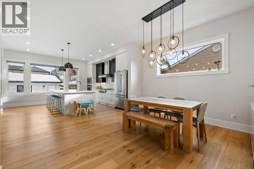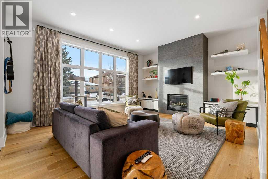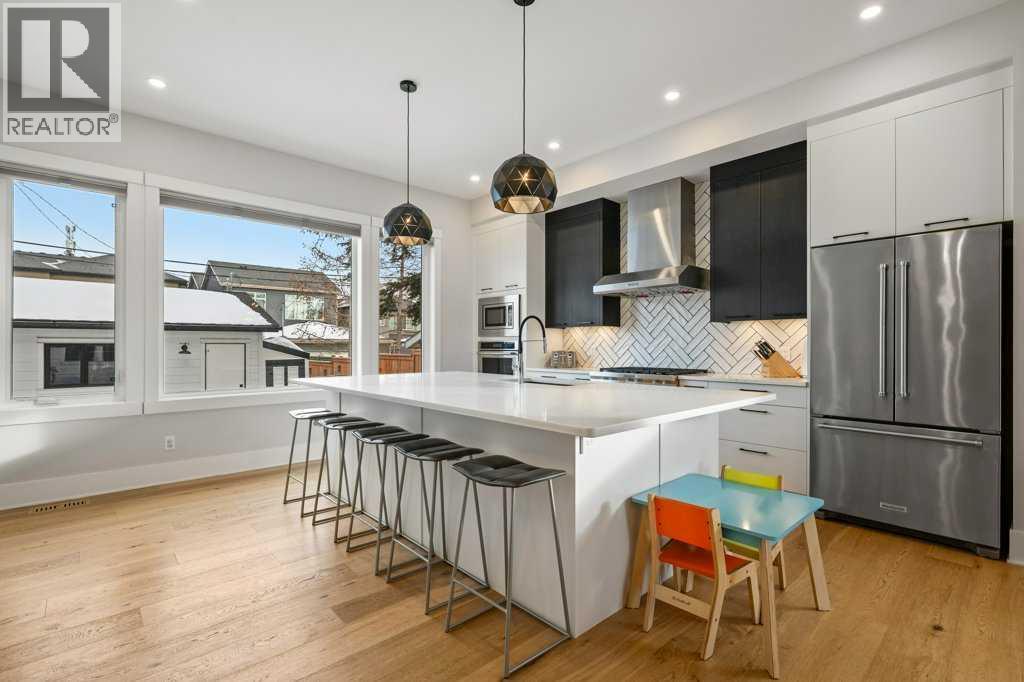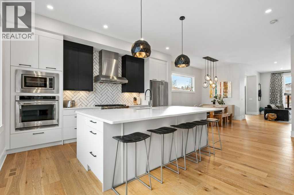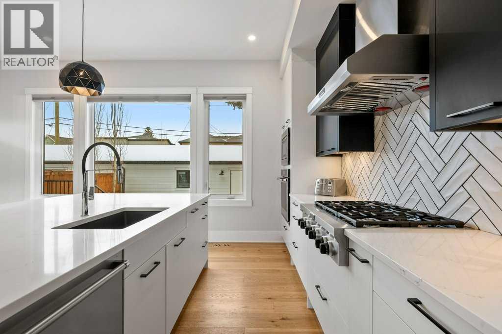 Stunning modern farmhouse located on a quiet street in the heart of the inner-city community of Renfrew. Custom built on a rare 60-foot lot with a 26-foot-wide footprint, this home offers exceptional space and functionality—ideal for growing families. The open-concept main floor is flooded with natural light and showcases 10-foot ceilings, wide-plank engineered oak flooring, solid core doors, custom railings, and a striking gas fireplace with floor-to-ceiling tile and built-in cabinetry from your family size front foyer into the West facing lifestyle room, the perfect start to this impressive plan.The thoughtfully designed kitchen is both stylish and practical featuring extended-height white cabinetry, soft-close mechanics, a massive quartz island, built-in oven and microwave, gas cooktop, French-door refrigerator, walk-in pantry with custom built-ins and an under counter built-in fridge/freezer with pullouts and a built-in desk area. The adjacent wall of windows is overlooking the backyard, with a conveniently located 2-piece powder room and walk in pantry with beverage center completes the main level.Open rail guides you to the 10' ceilings in the upper plan and 3 large skylights. A front primary retreat is a true sanctuary, offering a vaulted 12' ceilings, luxurious 5-piece spa ensuite with heated tile floors (including the shower), freestanding soaker tub, water closet, dual vanities, and a walk-through custom closet with built-ins connecting directly to the upper laundry room with added storage. Two generously sized children’s bedrooms are located at the rear of the home and share a beautifully finished 5-piece bathroom with dual sinks, along with a linen closet.The fully developed basement expands the living space with a large recreation room, built-in media center, as well as a built in wet bar with added storage, a beverage and wine cooler, full-height wine wall and 120-bottle wine towers with quartz counters, a fourth bedroom, a stylish fourth b athroom with curbless walk-in shower, and additional storage.Outside, the property is fully landscaped and fenced, featuring an expansive deck, aggregate concrete walkways, storage shed, and extensive perennial gardens. The oversized double detached garage comfortably accommodates two vehicles with room to spare. Additional highlights include central air conditioning and high-end finishes throughout.This is a quality-built inner-city home offering space, craftsmanship, and modern comfort in a highly desirable, family-friendly location one block to the walking embankment and groomed paths as well as close to parks, schools, amenities, and downtown access. (id:6769)