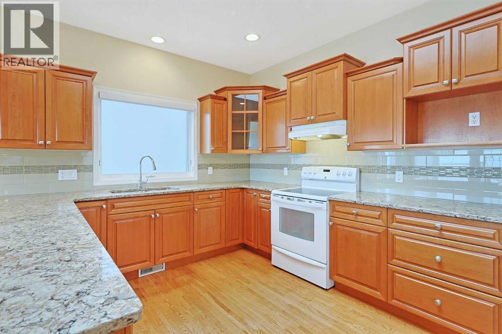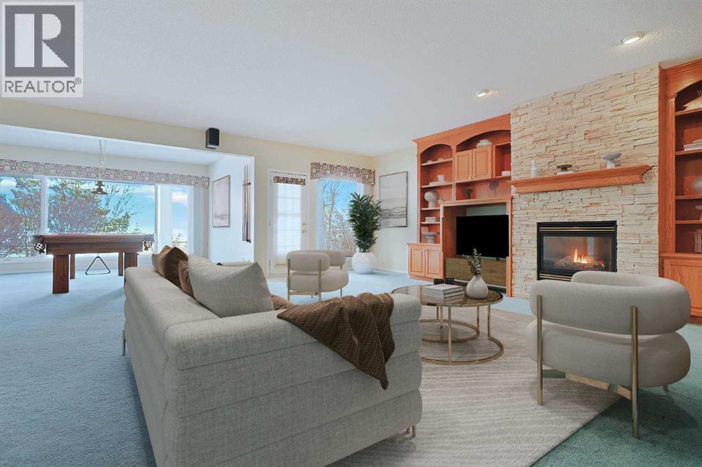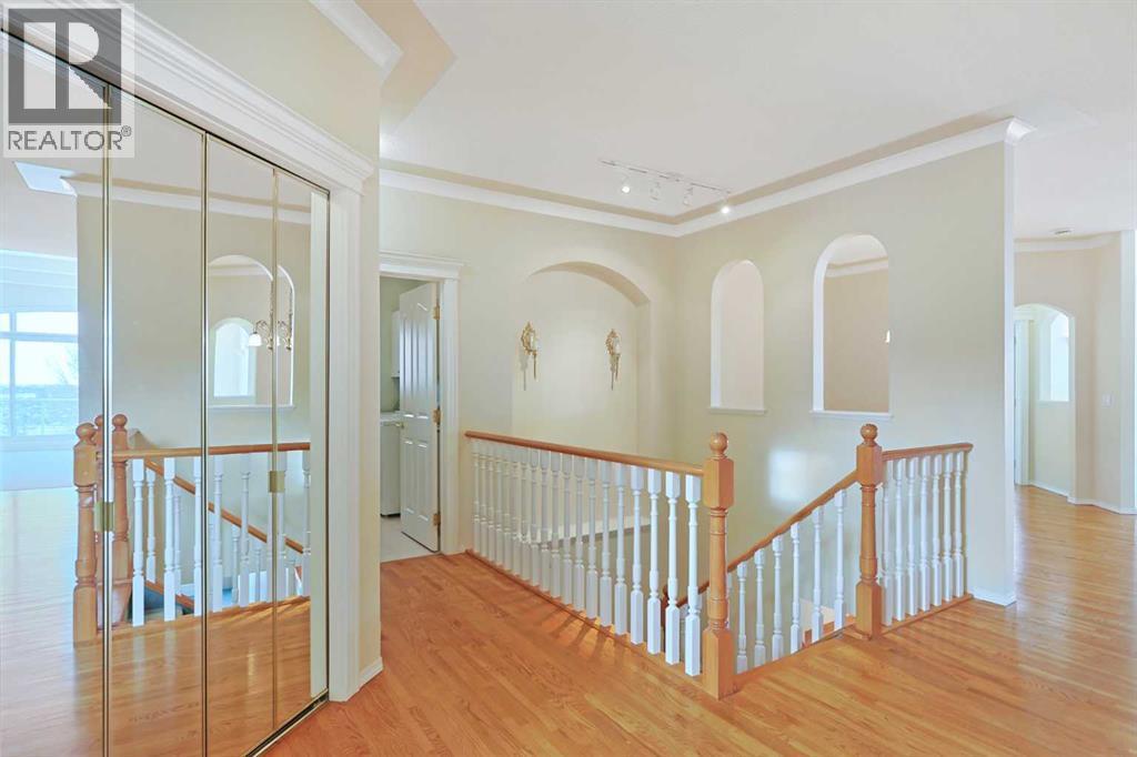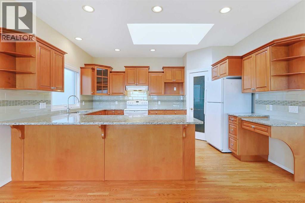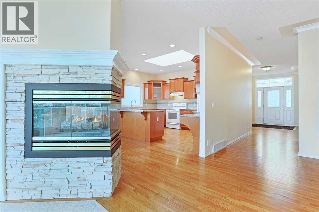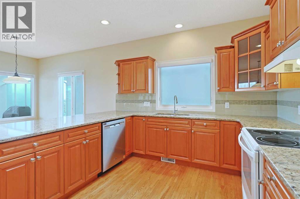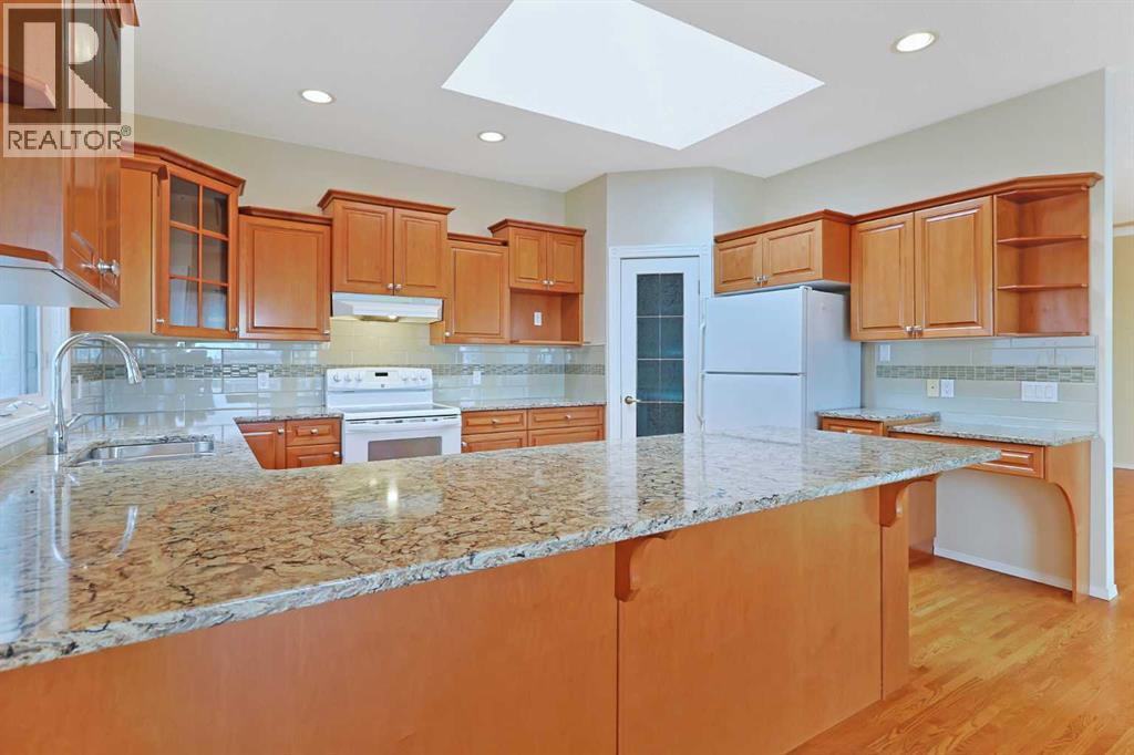 Lovingly maintained by the original owners, this wonderful home is ready & waiting for a new family to make it their very own, located here on exclusive Hamptons Heights backing onto the prestigious Hamptons golf course. Surrounded by breathtaking views of the 16th hole & distant horizon, this mint condition walkout bungalow enjoys beautiful hardwood floors & central air, 3 bedrooms + den, 2 toasty gas fireplaces & 2 fantastic decks to take in the glorious wide open views. Complemented by 9ft ceilings & expansive picture windows, you will just love the inviting & airy feel of the main floor with its stunning living room with 11ft stepped ceilings & 3-sided fireplace, elegant open concept formal dining room & sun-drenched maple kitchen with skylights & quartz counters, walk-in pantry & white/stainless steel appliances. A French door from the dining nook leads out onto the L-shaped balcony…with a covered section & almost 300sqft of outdoor space. The relaxing owners’ retreat has a big bay window with views of the golf course, great-sized walk-in closet & jetted tub ensuite with double vanities & separate shower. The beautifully finished walkout level – with infloor heating, has 2 large bedrooms (1 with a big walk-in closet), another full bathroom, loads of extra space for storage & fantastic games/rec room with wet bar, stone-facing fireplace & built-in cabinets. The main floor also has a dedicated home office with desk (included) & built-in bookcases, & laundry room complete with Maytag washer & dryer, sink & built-in cabinets. In addition to the balcony, you’ve also got a 300+sqft patio in the backyard, which is fully fenced & landscaped, & comes complete with winding gardens, mature shrubs & trees. Other features include crown moldings, finished garage, red brick façade & clay tile roof, Hunter Douglas blinds, 2 hot water tanks, central vacuum system & storage shed in the backyard for your gardening tools. Not-to-miss opportunity to make your home on one of the Ham ptons most desirable streets, only a few short minutes to all community amenities (Hamptons School, tennis courts & sports fields), shopping at the Hamptons Co-op & Edgemont Superstore, plus quick & easy access to Crowfoot Centre & LRT, University of Calgary, hospitals, major retail centers & downtown. (id:6769)