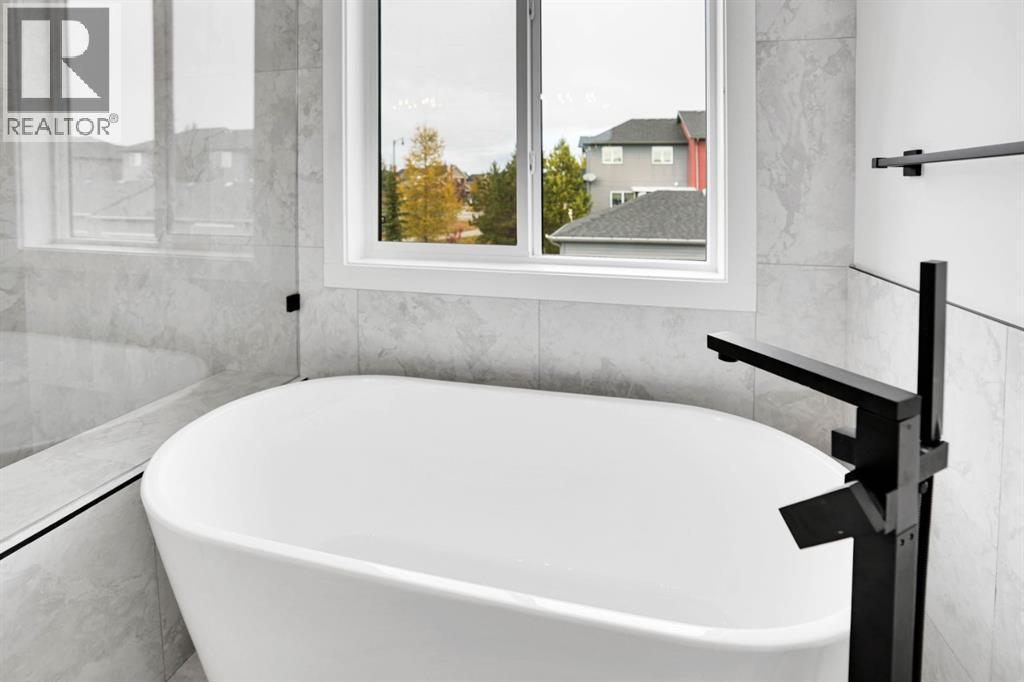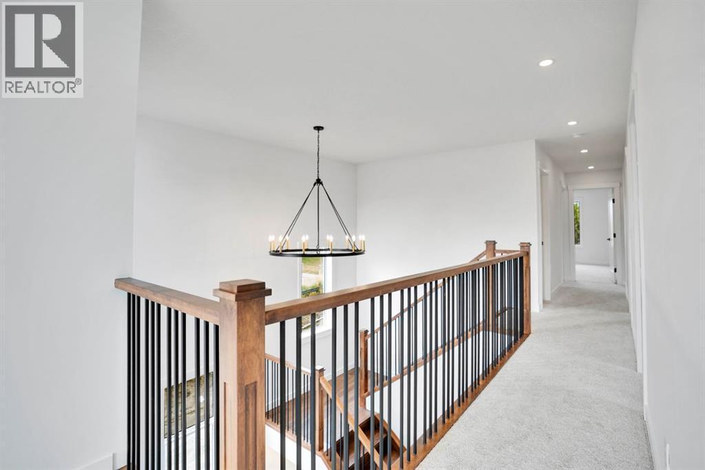 Welcome to this stunning 2200+ sq. foot home in the heart of Pinnacle in Sunset Ridge, Cochrane, where modern design meets natural beauty. Just 45 mins from the majestic Rocky Mountains and 30 mins from downtown Calgary, this home is surrounded by serene ravine and mountain views, offering the perfect balance between peaceful retreat and urban convenience. Built with every detail in mind, the home features a timeless neutral colour palette and large windows that fill each room with natural light. The open-concept great room centers around a cozy fireplace, seamlessly connecting to a spacious dining area and chef inspired kitchen. The kitchen boasts elegant white oak cabinetry with under-cabinet lighting, a large central quartz island ideal for entertaining, and high-end stainless steel KitchenAid appliances, including a gas stove, built in wall oven, and microwave. A Blanco granite sink adds both functionality and style to this beautiful space. Upstairs a central bonus room opens onto a private balcony where you can take in the sweeping views of the ravine and mountains. The primary suite is a tranquil retreat with a soft accent wall and a decorative barn door leading to the luxurious 5-piece ensuite complete with a stand-up shower, freestanding soaker tub, dual vanity, and large walk in closet with custom built in shelving. The upper floor also features a convenient laundry room with washer and dryer, built in sink, and additional cabinetry, as well as 2 spacious secondary bedrooms designed fo comfort and flexibility. Thoughtful details are found throughout the home, including a wide front entrance with built in bench, a mudroom with organized shoe racks and coat hooks, and balconies at both front and back of the house that offer 360-degree views. Additional conveniences include AC, blinds, gas line to the garage, a separate side entrance, and a large back deck with a BBQ gas hookup, perfect for outdoor gatherings. This exceptional property is ideally located nea r scenic walking trails, schools, restaurants, and shopping, making it the perfect place to call home. Combining modern craftsmanship, elegant finishes, and breathtaking surroundings, this Cochrane residence offers the best of luxury living with a touch of mountain tranquility. Call for your private showing today. (id:6769)