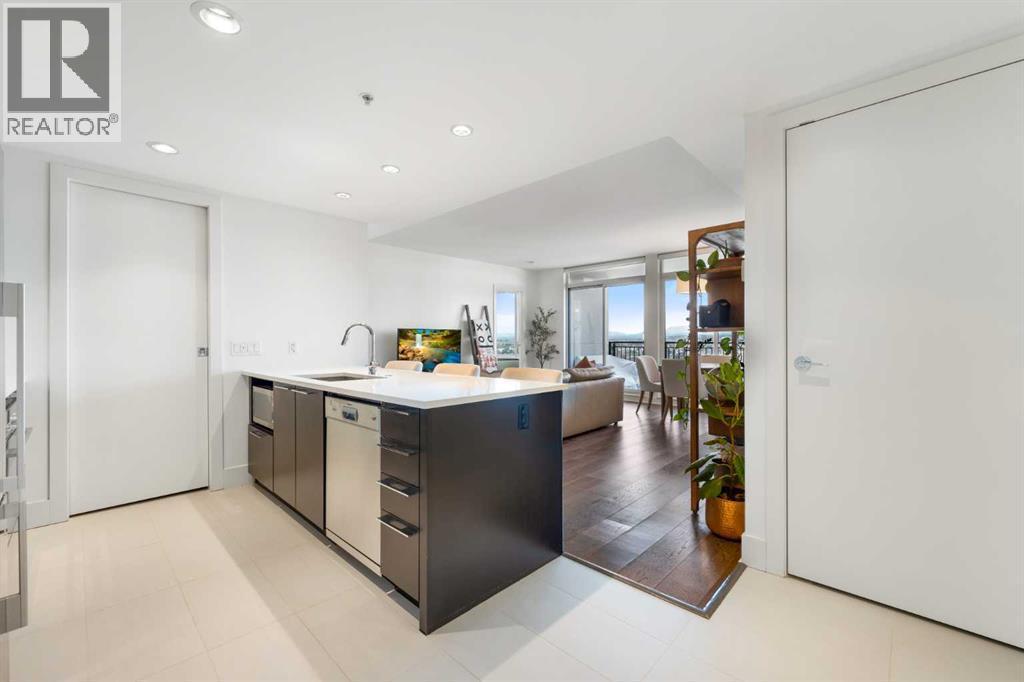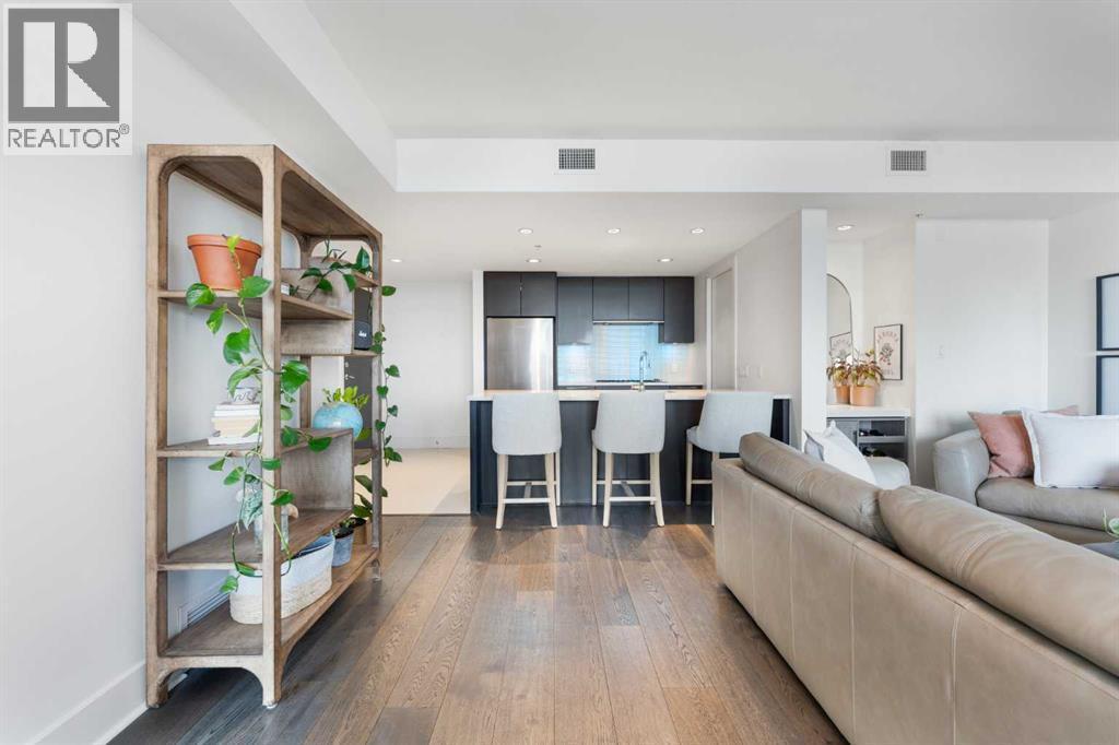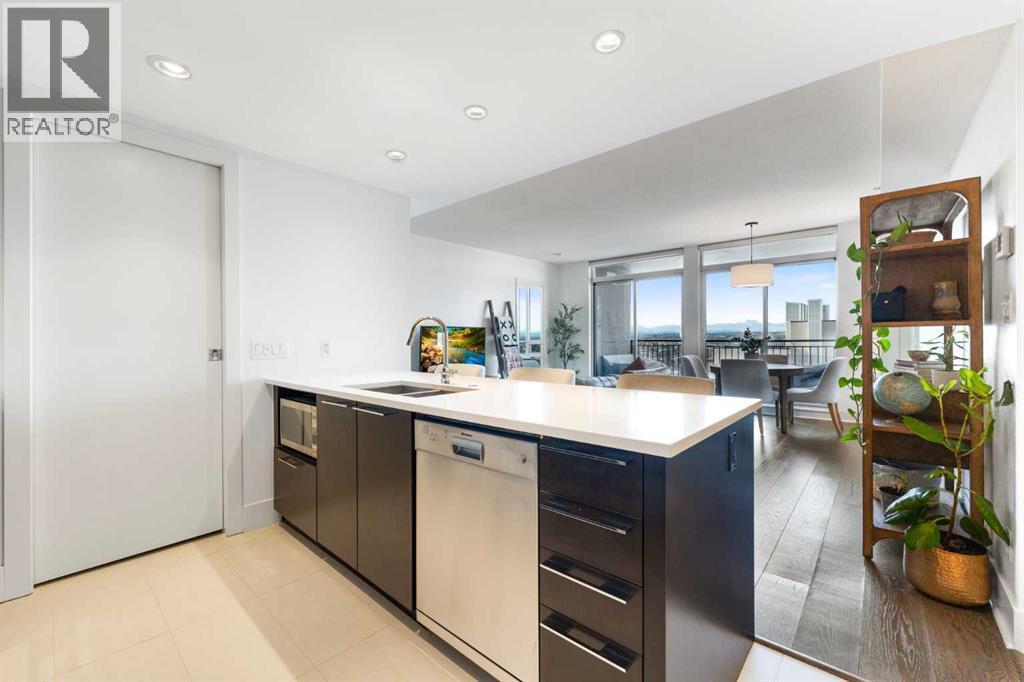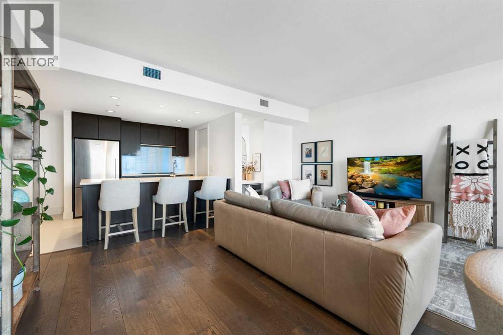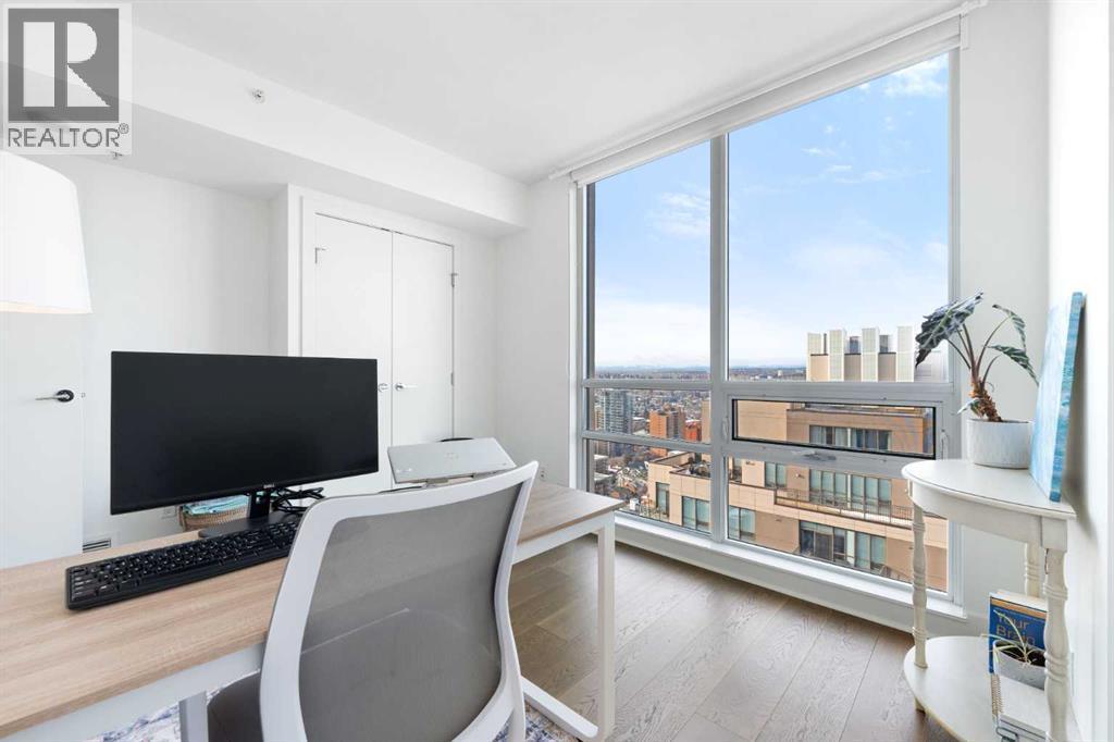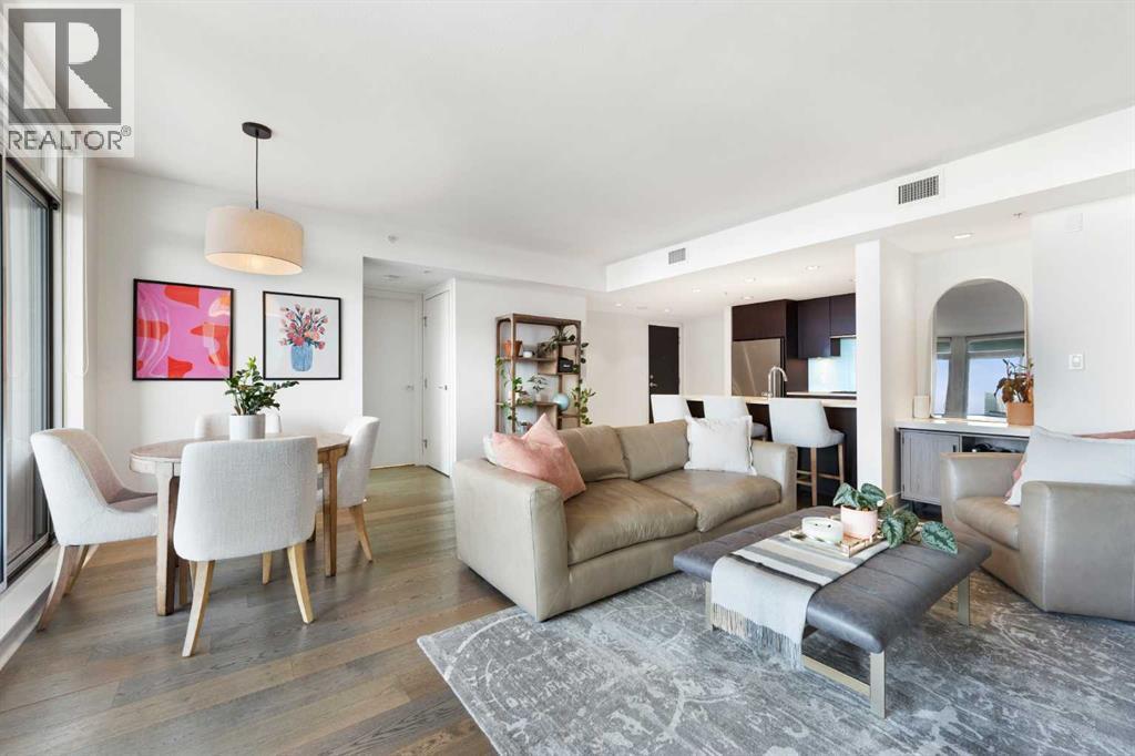 29 storeys above the city, this west-facing sub-penthouse offers a commanding perspective over the Bow River and Rocky Mountains — a front-row seat to Calgary’s most breathtaking sunsets.This bright and beautifully laid-out two-bedroom, two-bathroom residence features a functional split-bedroom design, ideal for professionals, guests, or those working from home. A generous entryway welcomes you into an open-concept living space where the kitchen, dining, and living areas flow seamlessly together — all positioned to fully capture the view.The gourmet kitchen overlooks the main living area and offers excellent storage, a large pantry, and a dining space comfortably seating six. The living room is thoughtfully designed with room for a built-in desk or coffee bar — perfect for modern city living.The primary suite is a private retreat with a walk-in closet and a spa-inspired ensuite featuring dual vanities and a deep soaker tub. The second bedroom is well-proportioned with generous closet space and easy access to the second full bathroom.Floor-to-ceiling windows and hardwood flooring throughout enhance the natural light and elevate the space, while in-suite laundry and air conditioning add everyday comfort. Step outside through double sliding doors to your private patio — the ideal place to unwind and enjoy Calgary’s most dramatic sunsets.Included are a titled parking stall on P1 and a separate storage locker.Residents of Luna enjoy concierge and security services, a state-of-the-art fitness centre, yoga studio, steam rooms, owner’s lounge with fireplace and kitchen, pool table, and an expansive outdoor terrace. (id:6769)