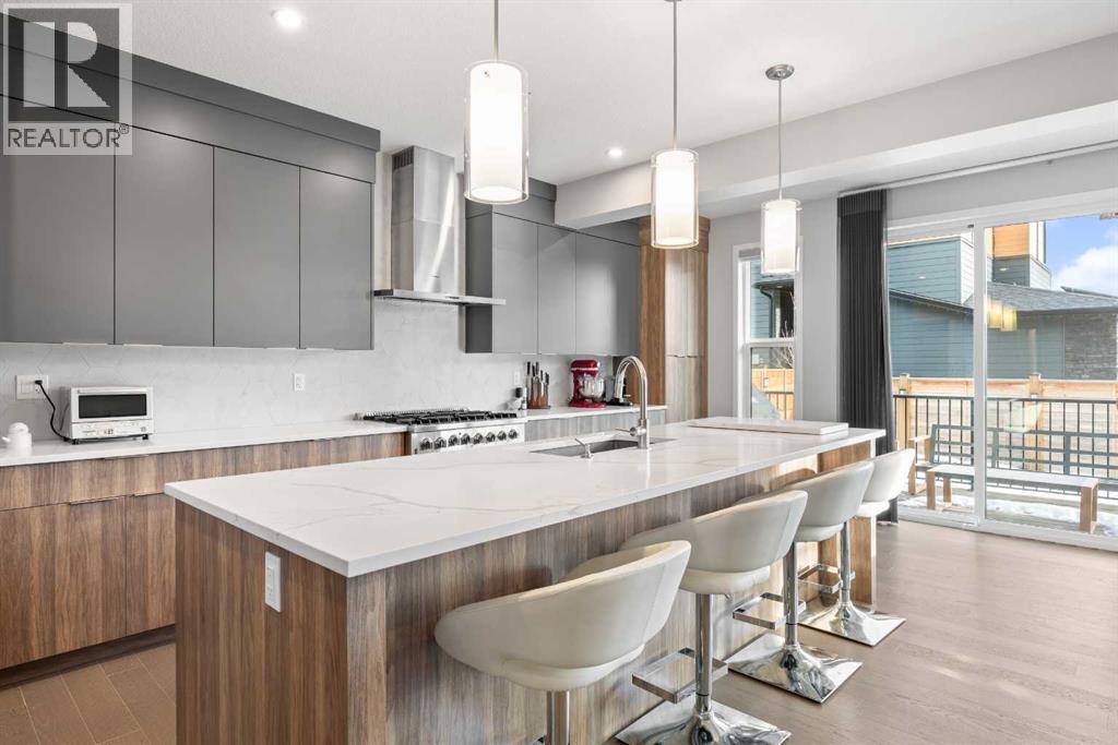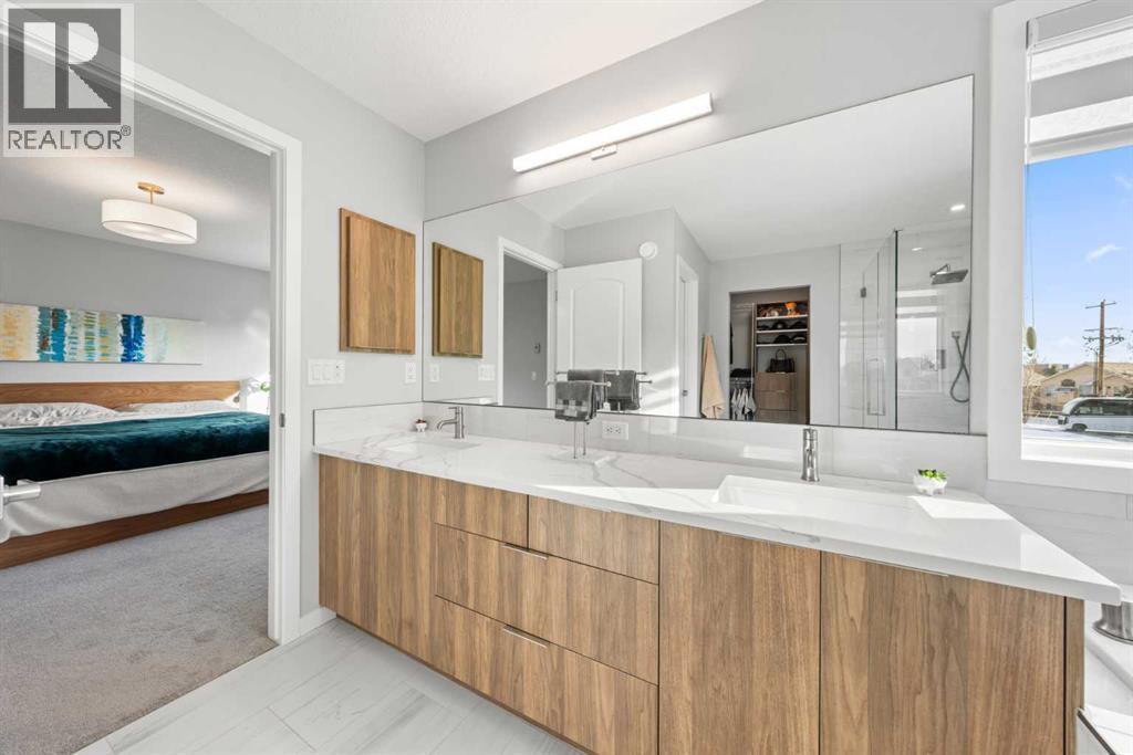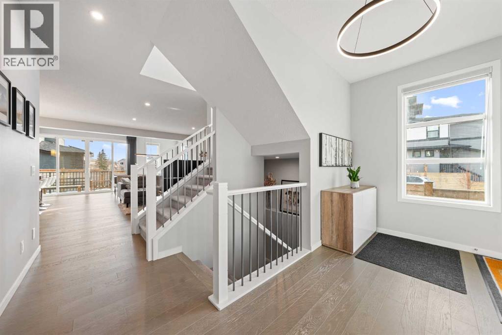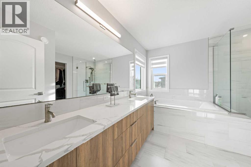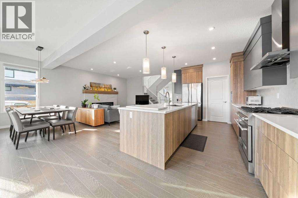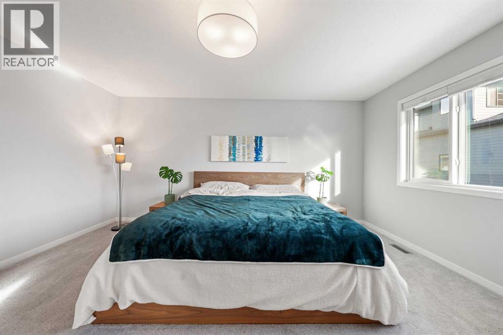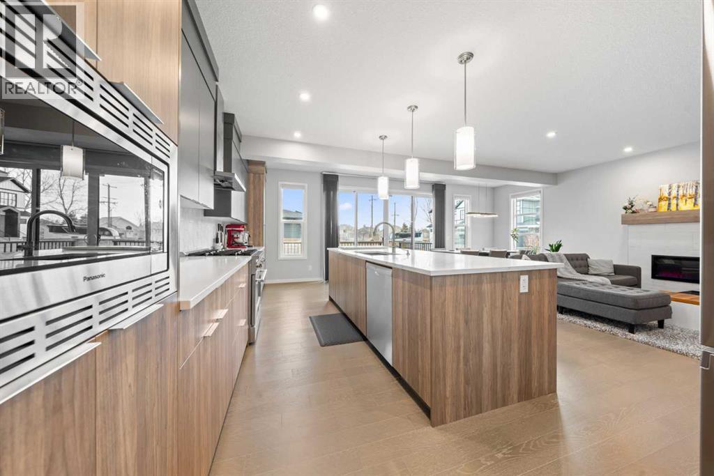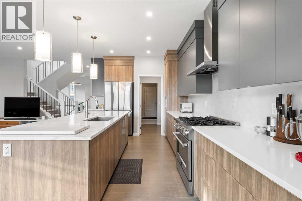 Welcome to this thoughtfully crafted home in the desirable community of Harvest Hills, perfectly positioned on a CORNER LOT offering added privacy, great curb appeal, and abundant natural light.This beautifully upgraded 3-bedroom, 2.5-bathroom home features an open-concept main floor ideal for everyday living and entertaining. Highlights include ENGINEERED HARDWOOD FLOORS, soaring ceilings, oversized windows, WiFi-ready smart features, upgraded LED lighting, UPGRADE QUARTZ COUNTERTOPS, and sleek modern finishes throughout.The chef-inspired kitchen offers a main-level WALKTHROUGH PANTRY, GAS STOVE with industrial hood fan, extended cabinetry, and a large centre island perfect for hosting and meal prep.Upstairs, enjoy two generously sized bedrooms, a versatile family room with motorized window coverings, and a spacious primary retreat complete with a custom ensuite featuring a stand-in shower, soaker tub, and double vanity. All bathrooms include elongated toilets for added comfort.The unfinished basement features 9-foot ceilings, rough-in plumbing, a WATER SOFTENER, RADON MITIGATION SYSTEM, AIR CONDITIONING, and a TANKLESS HOT WATER SYSTEM, offering endless future potential.Outside, enjoy a FULLY FENCED YARD, oversized custom deck, and landscaped backyard. An EXTENDED DOUBLE CAR GARAGE with EV plug-in capability and durable HARDIE BOARD SIDING complete the home.Located minutes from parks, schools, Harvest Hills Lake, shopping, dining, and major roadways, this is a rare opportunity to own a highly upgraded home in a sought-after Calgary community. (id:6769)