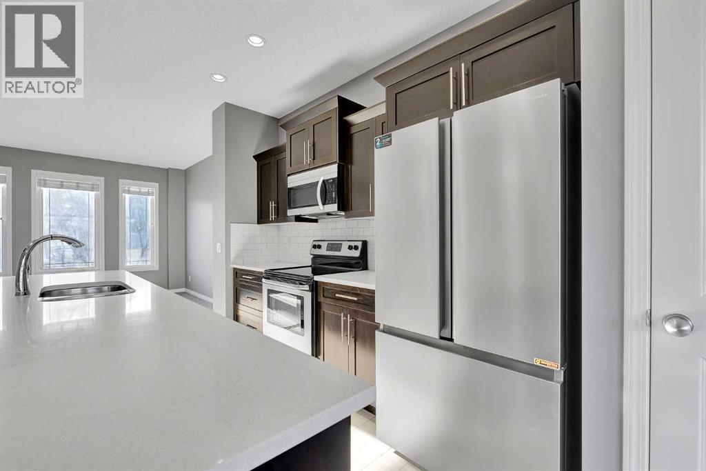 **Open House: 1 -4 pm, Sun, Jan 25**. Modern upgrades and bright, functional living come together in this fully finished and MOVE-IN READY 2-storey detached home in the award-winning lake community of Mahogany. Offers 3+1 bedrooms, 3.5 bathrooms, a double detached garage, a fully developed basement and fresh paint throughout. Central A/C for those hot summer days. Quick possession available! The open-concept main floor is warm and welcoming, featuring a sun filled-living room with 9 ft ceilings and brand new carpet. a well-appointed central kitchen with a large quartz island, ample cabinetry, generous counter space, and SS appliances including a brand new fridge. Spacious dining area opens directly onto a huge 12x20 deck—perfect for summer BBQs, outdoor dining, or relaxing evenings in the private and fenced backyard (no neighbours behind). A convenient 2-pc bathroom completes the main level. Upstairs, the primary bedroom offers a private retreat with a walk-in closet and 4-piece ensuite, and a sunny balcony is great for morning coffee or reading a book. Complemented by 2 additional bedrooms and another full bath on this level. The fully developed basement adds excellent versatility with a large family/rec room, a 4th bedroom, and a 4pc bath—ideal for guests or a home office. Lots of storage space in the mechanical room and under the stairs. Outside, the backyard leads to the double detached garage, providing both parking and extra storage. Ideally located with easy access to Mahogany’s lake and beaches, residents enjoy amazing four-season amenities, plus access to nearby schools, parks, playgrounds, scenic pathways, and quick access to Mahogany Village Market, shopping, restaurants, transit, and major roadways. An outstanding opportunity to enjoy lake living at its best! (id:6769)