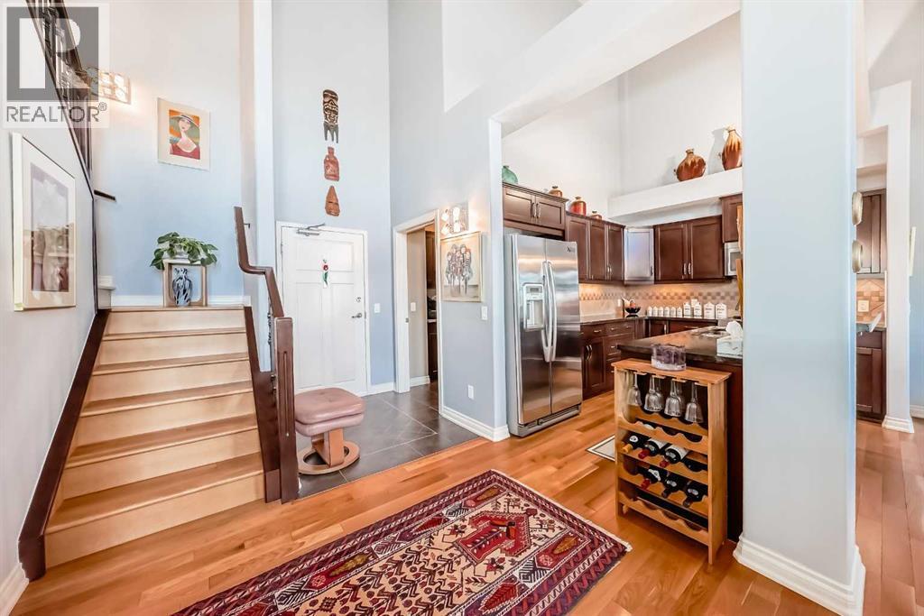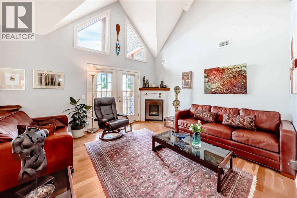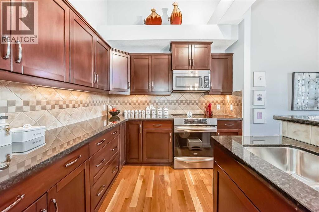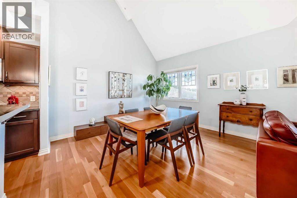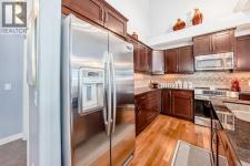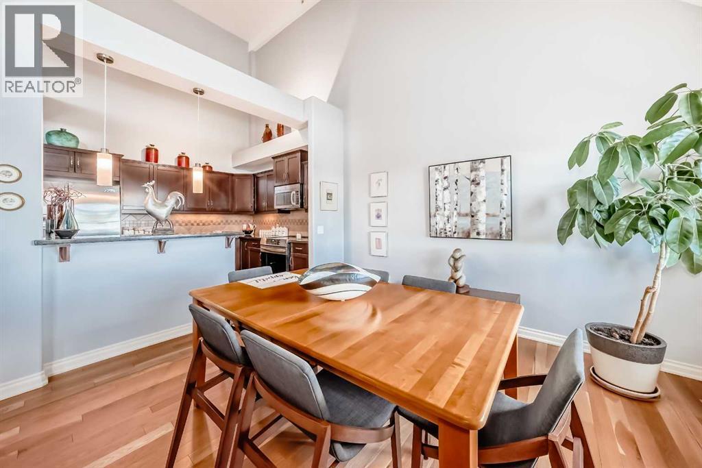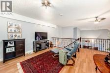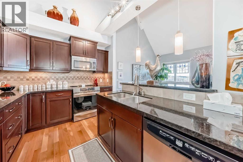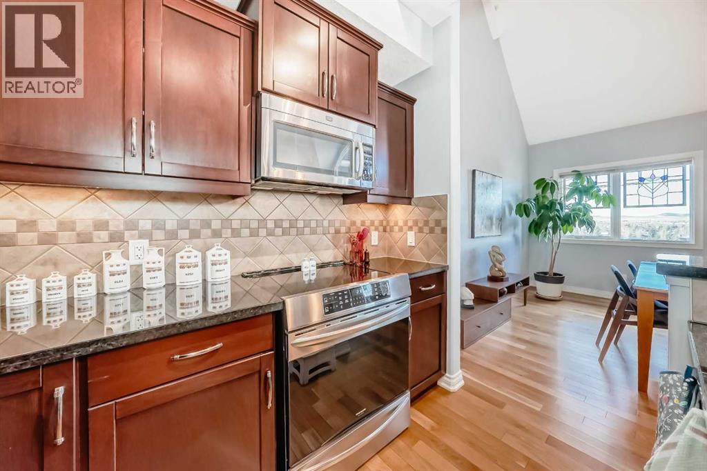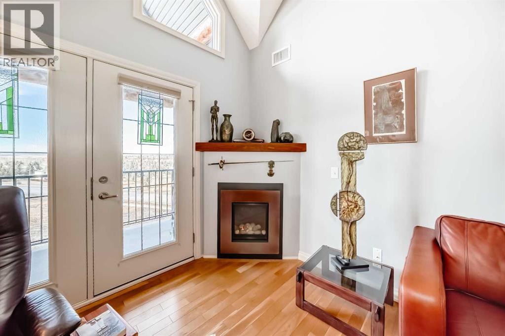 TOP FLOOR ~ WEST Facing with Mountain View~ Incredibly well taken care of with classic style. This 1 bedroom 2 bath condo with LOFT is beautiful. The additions added throughout the years make it simply stylish from the Hardwood Flooring throughout, Refaced Gas Fireplace, ( one of only two in the entire building) and classic paint colour. As you enter notice the Soaring Vaulted ceilings with windows that let in so much light, Tastefully designed kitchen with SS appliances, Breakfast Bar and a perfect cooking space. Ample dining area with the sit up breakfast bar makes for a great entertaining space. The living room with gas fireplace, and garden doors to the west facing balcony is a wonderful size. Up the stairs to the LOFT adds more living space for whatever you desire ~ TV room, Office, Guest bedroom, Library...... Back down the hall there is a closet, 4 piece main bath, and the Master Bedroom with walk through closet and 5 piece en suite. Love this tub shower combo. Heading out the garden doors to the deck there is a gas line for a BBQ and storage room which has been drywalled and wired with a light and plug in. Some have added a small chest freezer into this space. Perfect fit! The view from the balcony looks onto a forested area and greenspace and there is a mountain view. Stay warm in the winter months with in floor heating and in the SUMMER you have CENTRAL AIR to keep you COOL! This condo comes with 1 TITLED parking stall and there is unassigned parking outside the building that come with plug ins for winter. LOFTS on the BOW is a beautiful HIGHER end 55+ condo complex in Cochrane with a Mountain feel. There are 13 different common areas throughout the building including, Banquet Room and Kitchen, Pool table area, Fireplace Lounge, 7000 sq ft Courtyard with Fireplace and BBQ, Fitness Room, Library, 2 guest suites and more. Across from Lofts are pathways that lead to the Bow River and over to the shops. Easy access to the 22 and out to the Mountains or he ading into Calgary. Always a sought after building View this property TODAY and live here TOMMORROW! (id:6769)