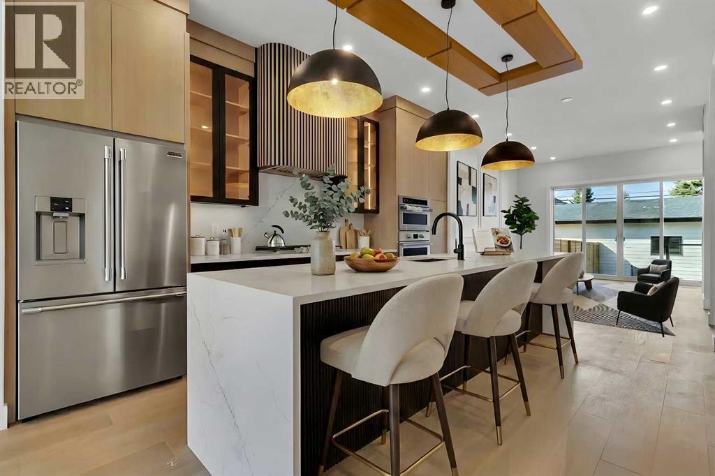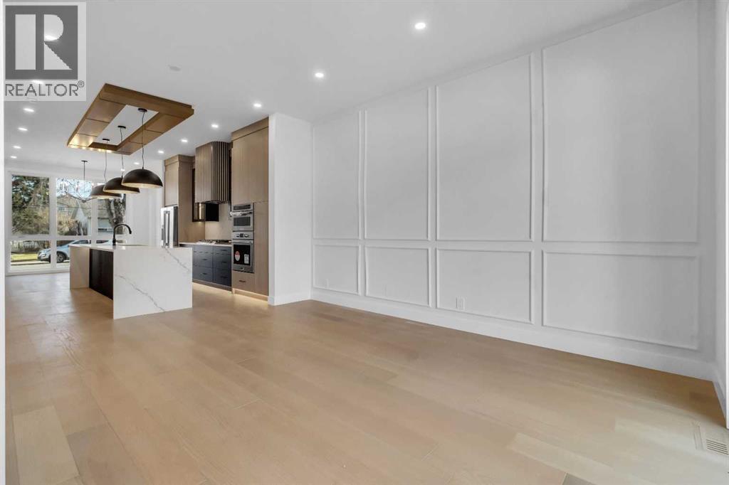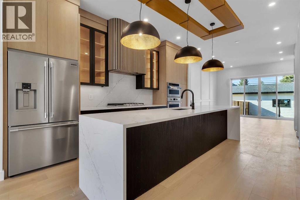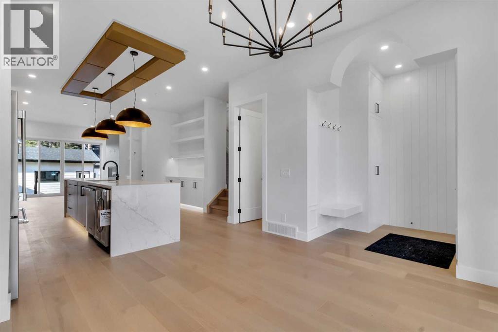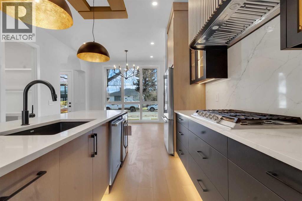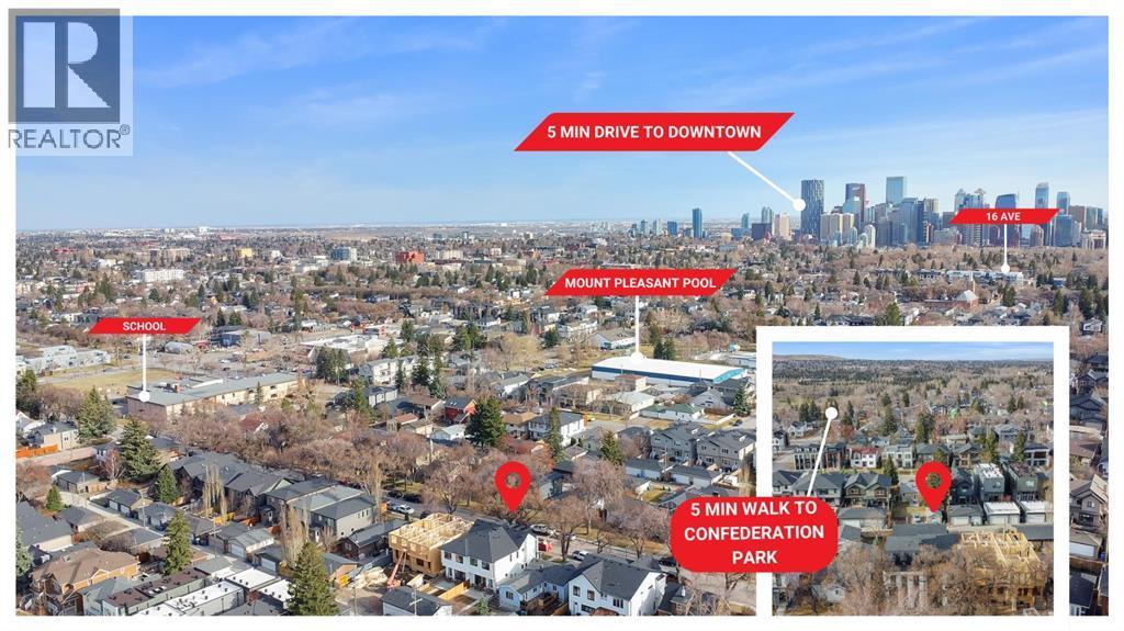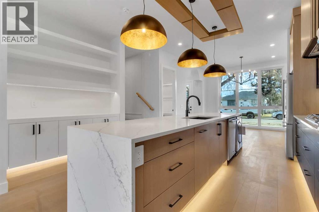 Welcome to this brand new, meticulously crafted luxury infill by Moon Homes, located on a quiet, tree lined street in the heart of Mount Pleasant. Thoughtfully designed across all three levels, this five bedroom residence offers refined craftsmanship, elegant architectural detailing, and exceptional functionality just steps from Confederation Park and minutes to downtown.The main floor features soaring 10 foot ceilings, rich hardwood flooring, oversized windows, and custom millwork throughout. A grand arched front entry opens to a spacious foyer, setting the tone for the timeless interior. The open concept layout blends classic elegance with modern design. The dining area is highlighted by a designer chandelier, while the living room centers around a beautifully tiled gas fireplace. Large sliding patio doors open to a rear concrete patio, creating seamless indoor outdoor living.The chef inspired kitchen is a true showpiece, featuring a massive quartz island, built in Frigidaire Professional Series appliances, a custom slat hood fan, bar fridge, and extensive full height cabinetry with pull out storage. Integrated LED lighting throughout the kitchen, including toe kick, under cabinet, floating shelf, and glass front upper lighting, adds both function and ambiance. A dedicated home office with a built in desk and under lit floating shelves is positioned near the entry. At the rear, a well designed mudroom with bench seating and coat hooks leads to a stylish powder room with a floating vanity and pendant lighting.Upstairs, wainscoting continues along the staircase into a bright hallway filled with natural light. The primary retreat showcases nearly 15 foot vaulted ceilings, plush carpeting, a striking chandelier, a full wainscoted feature wall, and three upper transom windows. The walk in closet includes custom shelving with pull outs and motion sensor LED lighting. The spa inspired ensuite offers heated tile floors, dual vanities, a freestanding soaker tub, a ti led rainfall shower with bench, ambient lighting, and a private toilet area.Two additional bedrooms each feature walk in closets and share a beautifully finished four piece bathroom. The upper laundry room includes LG appliances, folding counter, deep sink, cabinetry, and linen storage conveniently located near the bedrooms. The fully finished two bedroom legal basement suite (pending final inspection), includes a private side entrance and mirrors the quality of the main home. It offers a full kitchen, spacious living area, modern four piece bathroom, and dedicated laundry with a built in sink, making it ideal for extended family, guests, or future rental income. Finished with a detached double garage and paved alley access, this home is surrounded by top rated schools, parks, Mount Pleasant Pool, and everyday amenities, with quick access to major routes and the city core. A rare opportunity to own a truly refined, brand new luxury residence in one of Calgary’s most sought after communities. (id:6769)