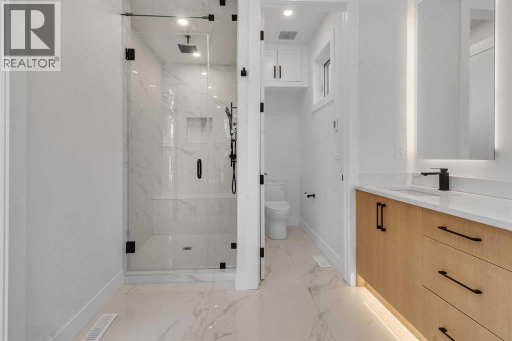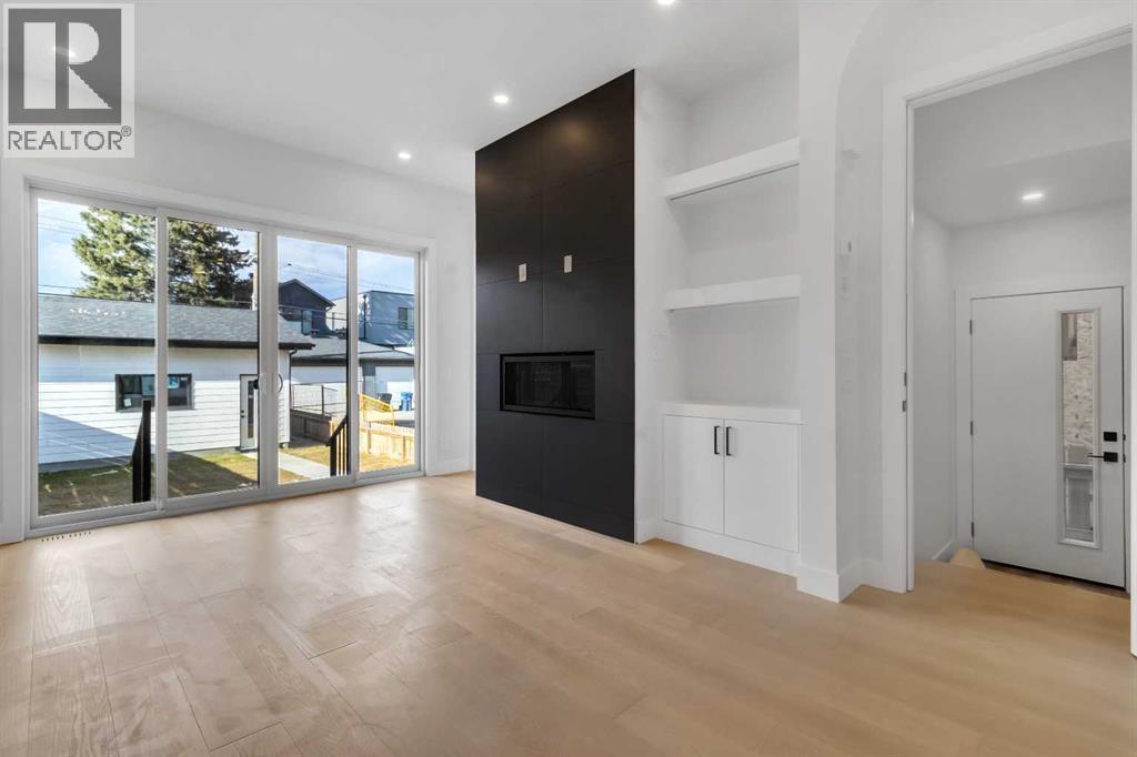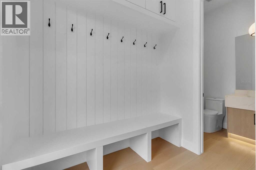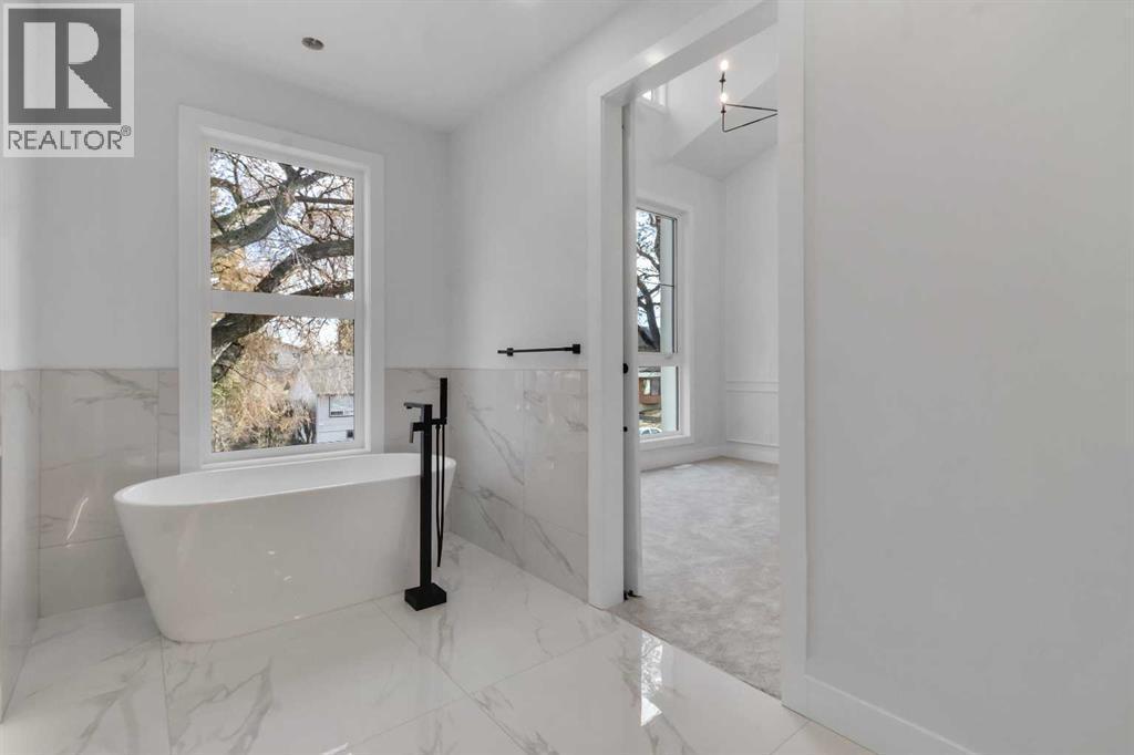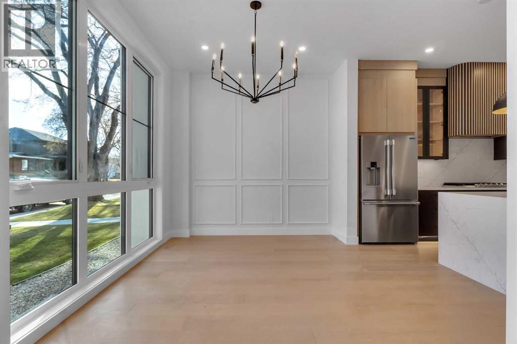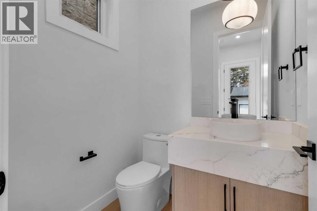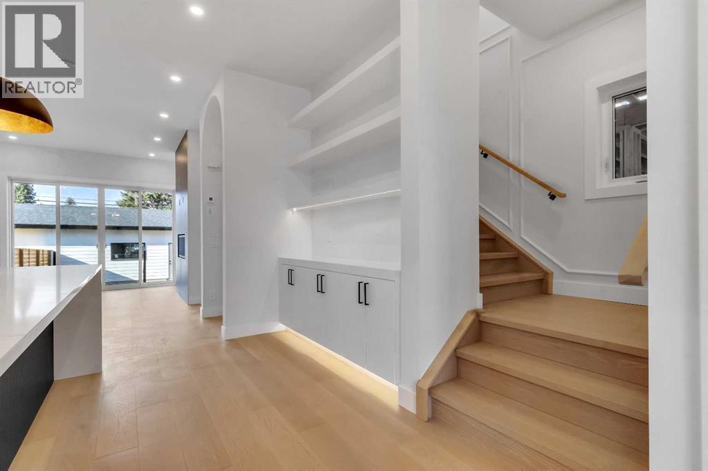 Welcome to this brand new, meticulously crafted luxury infill by Moon Homes, located on a quiet, tree lined street in the heart of Mount Pleasant. Thoughtfully designed across all three levels, this five bedroom residence offers refined craftsmanship, elegant architectural detailing, and exceptional functionality just steps from Confederation Park and minutes to downtown.The main floor features soaring 10 foot ceilings, rich hardwood flooring, oversized windows, and custom millwork throughout. A grand arched front entry opens to a spacious foyer, setting the tone for the timeless interior. The open concept layout blends classic elegance with modern design. The dining area is highlighted by a designer chandelier, while the living room centers around a beautifully tiled gas fireplace. Large sliding patio doors open to a rear concrete patio, creating seamless indoor outdoor living.The chef inspired kitchen is a true showpiece, featuring a massive quartz island, built in Frigidaire Professional Series appliances, a custom slat hood fan, bar fridge, and extensive full height cabinetry with pull out storage. Integrated LED lighting throughout the kitchen, including toe kick, under cabinet, floating shelf, and glass front upper lighting, adds both function and ambiance. A dedicated home office with a built in desk and under lit floating shelves is positioned near the entry. At the rear, a well designed mudroom with bench seating and coat hooks leads to a stylish powder room with a floating vanity and pendant lighting.Upstairs, wainscoting continues along the staircase into a bright hallway filled with natural light. The primary retreat showcases nearly 15 foot vaulted ceilings, plush carpeting, a striking chandelier, a full wainscoted feature wall, and three upper transom windows. The walk in closet includes custom shelving with pull outs and motion sensor LED lighting. The spa inspired ensuite offers heated tile floors, dual vanities, a freestanding soaker tub, a ti led rainfall shower with bench, ambient lighting, and a private toilet area.Two additional bedrooms each feature walk in closets and share a beautifully finished four piece bathroom. The upper laundry room includes LG appliances, folding counter, deep sink, cabinetry, and linen storage conveniently located near the bedrooms. The fully finished two bedroom legal basement suite (pending final inspection), includes a private side entrance and mirrors the quality of the main home. It offers a full kitchen, spacious living area, modern four piece bathroom, and dedicated laundry with a built in sink, making it ideal for extended family, guests, or future rental income. Finished with a detached double garage and paved alley access, this home is surrounded by top rated schools, parks, Mount Pleasant Pool, and everyday amenities, with quick access to major routes and the city core. A rare opportunity to own a truly refined, brand new luxury residence in one of Calgary’s most sought after communities. (id:6769)