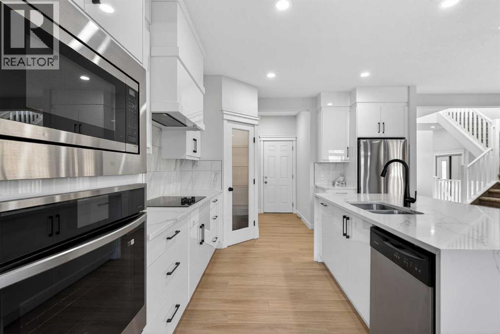 Welcome to this exquisite residence offering over 3,200 sq. ft. of beautifully developed living space, where modern luxury meets timeless sophistication. From the moment you step inside, you’ll be captivated by the home's meticulous upgrades—featuring fresh designer paint, elegant new flooring, and fully renovated bathrooms. The open-concept layout is enhanced by soaring ceilings, sleek LED lighting, and an abundance of natural light, creating a warm and inviting ambiance throughout. At the heart of the main level is a chef-inspired gourmet kitchen, thoughtfully redesigned with top-tier appliances, contemporary countertops, and generous cabinetry—perfect for everyday living and entertaining alike. Just off the kitchen, a stylish dining area provides the ideal backdrop for family dinners or gatherings, while the grand living room centers around a cozy gas fireplace, making it the perfect place to relax on cooler evenings. A versatile flex room adds functionality to suit your lifestyle needs. Upstairs, you'll find an expansive bonus room featuring vaulted ceilings, three skylights, and a private balcony—an impressive and sunlit retreat. The home boasts three spacious bedrooms, each designed with comfort in mind, and two fully upgraded bathrooms. The convenient laundry room includes a new linen closet, adding both style and practicality. The luxurious primary suite is a true sanctuary, complete with a large walk-in closet and a stunning 5-piece ensuite featuring a rejuvenating Jacuzzi tub—ideal for unwinding after a long day. The fully developed basement offers even more living space, featuring a soundproofed ceiling and a stylish 2-bedroom Legal suite with its own private entrance. This self-contained suite includes a modern kitchen with brand-new appliances, a full bathroom, and separate access—perfect for extended family, guests, or rental income. Located in a vibrant and family-friendly neighborhood, this home is surrounded by outstanding amenities including a Fre shCo shopping center, nearby parks, a large field with a playground and baseball diamond, two elementary schools, and the soon-to-open Evanston Middle School. Enjoy easy transit access, flat walking paths ideal for all ages, and close proximity to Beacon Hill shopping center with Costco and Walmart. Plus, it’s just a 10-minute drive to Calgary International Airport. Additional recent upgrades such as new LED lighting, brand-new carpeting, and a newly installed EV charging outlet in the garage further elevate this already stunning property. This home truly has it all—space, style, location, and versatility. Don’t miss your opportunity to make it yours. (id:6769)