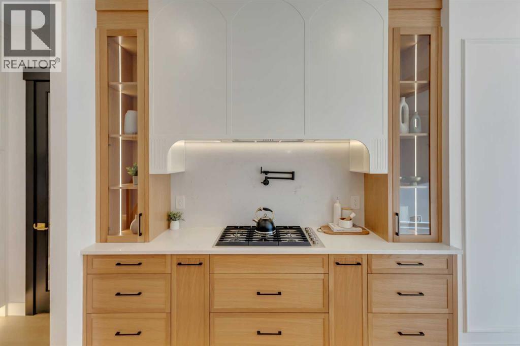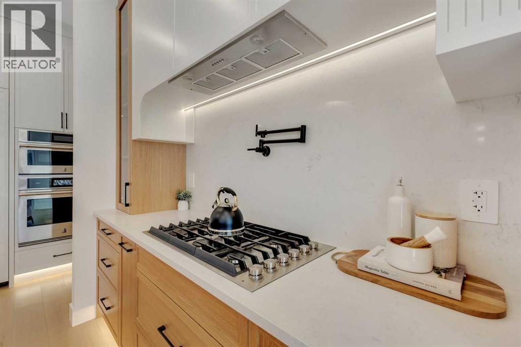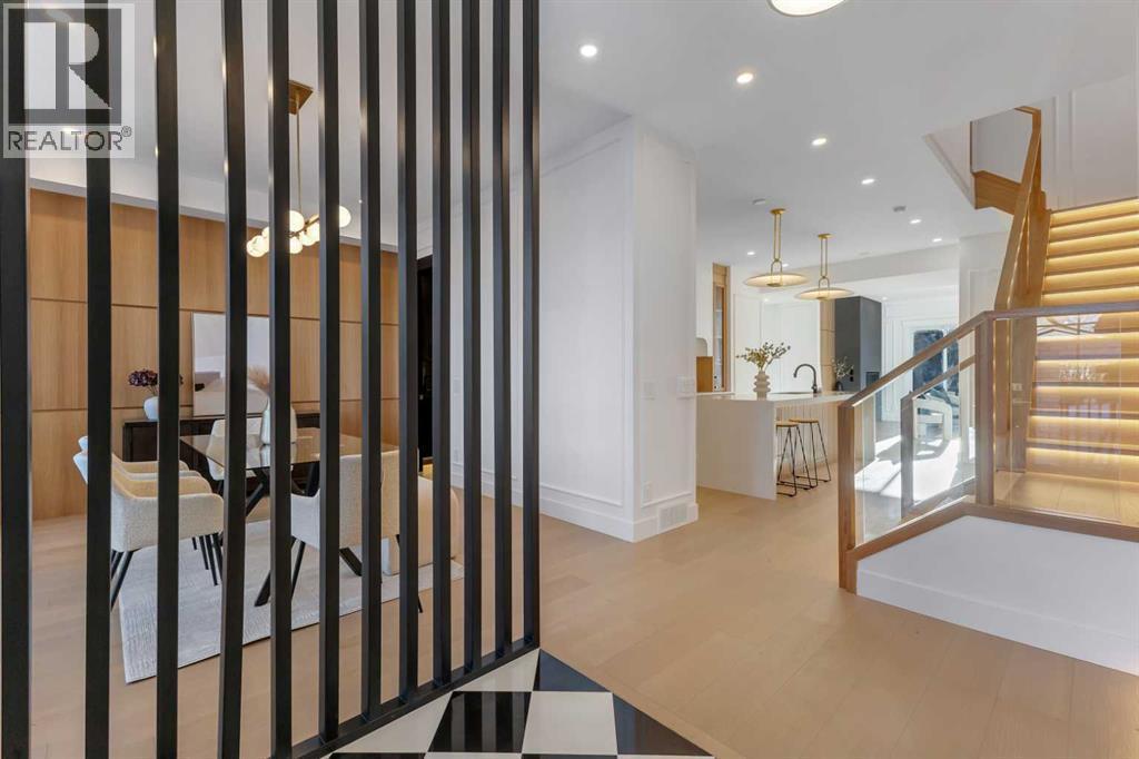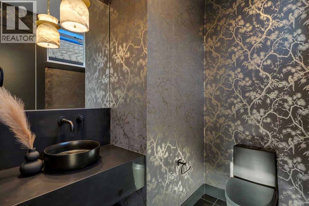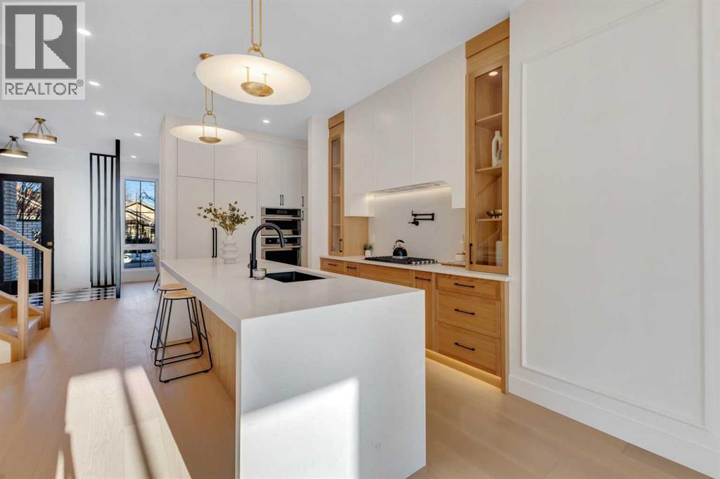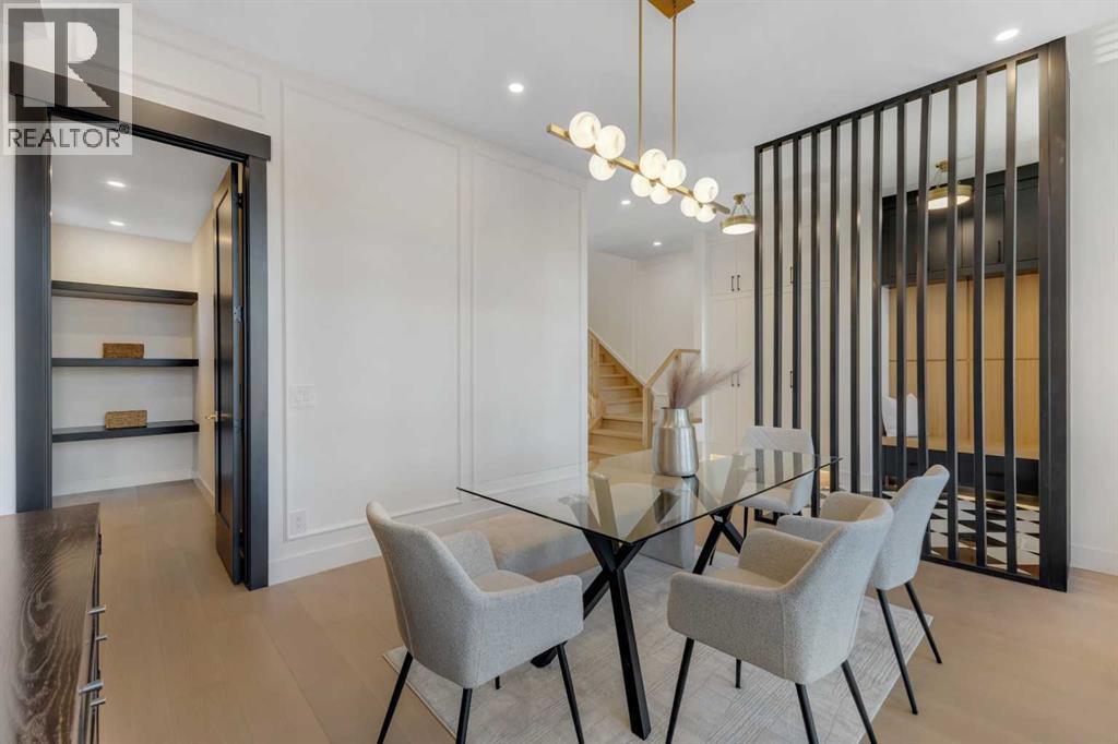 This exceptional detached infill by Moon Homes is set in a quiet pocket of Inglewood and offers a refined blend of architectural presence, thoughtful layout, and elevated living. Designed with intention throughout, the home delivers a strong sense of craftsmanship while remaining highly functional for everyday life.The main floor opens to a welcoming front entry finished with custom millwork and built in storage that provides subtle separation while maintaining an open flow. A dedicated front dining area is framed by oversized windows overlooking the tree lined street, creating a bright and inviting space for hosting and daily use. Carefully selected materials and cohesive detailing throughout the main level give the home a polished and timeless feel.At the centre of the home, the kitchen is both striking and highly functional. Quartz countertops, custom oak and white cabinetry, matte black fixtures, an arched hood fan, and a full JennAir appliance package including a gas range anchor the space. A pot filler and extensive storage support everyday cooking, while the hidden prep kitchen adds a second sink, additional cabinetry, and open shelving, allowing the main kitchen to remain clean and composed.The living room is warm and elevated, centered around a gas fireplace with a tiled surround and floating oak media feature. Large sliding doors open to the backyard, bringing in natural light and reinforcing seamless indoor outdoor living. At the rear of the home, a spacious mudroom with built in cabinetry continues the thoughtful storage theme, while a well finished powder room completes the main level.Upstairs, the primary suite is a true retreat. Vaulted ceilings create a sense of scale, while a full floor to ceiling oak panel feature wall adds depth, warmth, and architectural impact. The walk in closet is finished with custom built ins topped with quartz surfaces, combining durability with a refined aesthetic. The ensuite is equally impressive, featuring dual sinks, a freestanding soaker tub, and a fully tiled walk in steam shower, creating a calm and spa inspired space. A built in coffee bar with sink, floating shelves, and space for a beverage fridge adds everyday convenience and a boutique hotel feel.Each secondary bedroom is finished with tray ceilings, walk in closets, and private four piece ensuites, offering comfort and privacy for family or guests. An upper floor laundry room is conveniently positioned nearby.The fully developed basement expands the home’s versatility with a large recreation room featuring a custom wet bar, a fourth bedroom, full bathroom, quiet home office, dedicated gym space, and a temperature controlled wine room with custom shelving. This level is designed to accommodate entertaining, work, and relaxation with ease.Located just steps from Inglewood’s 9th Avenue, the home offers walkable access to cafés, restaurants, shops, river pathways, parks, and schools, all while remaining minutes from downtown. (id:6769)