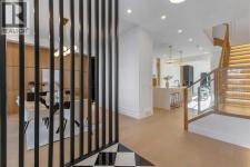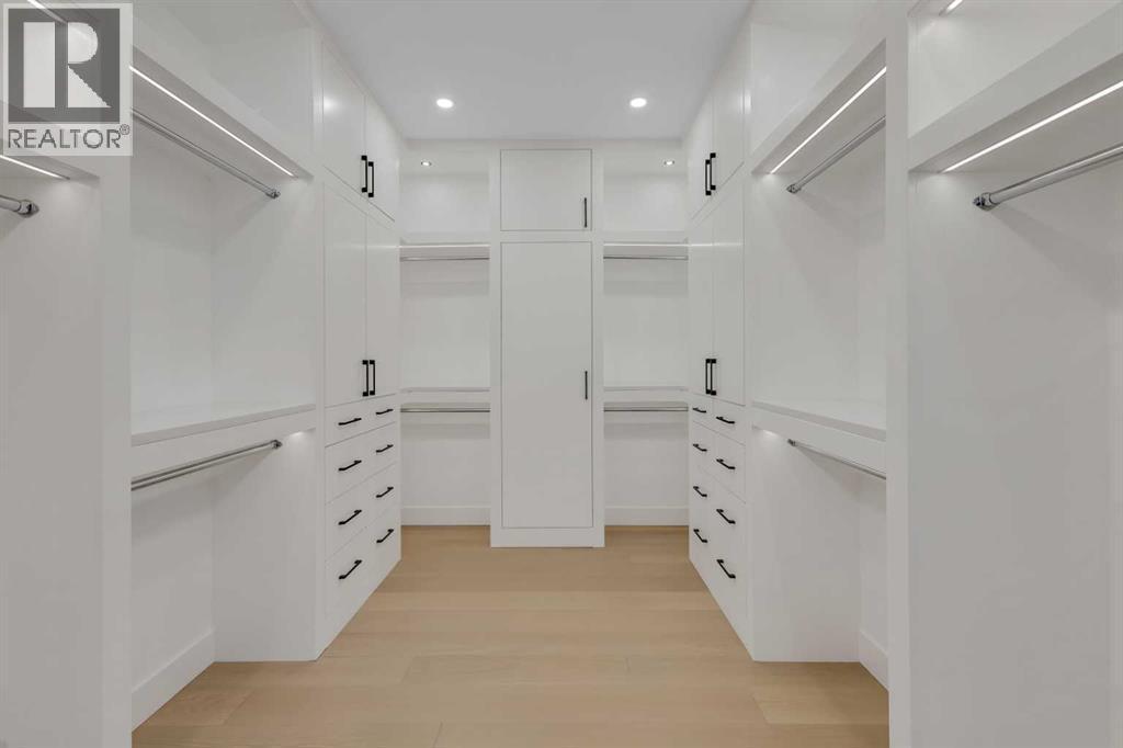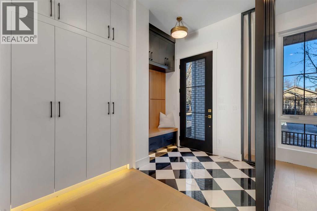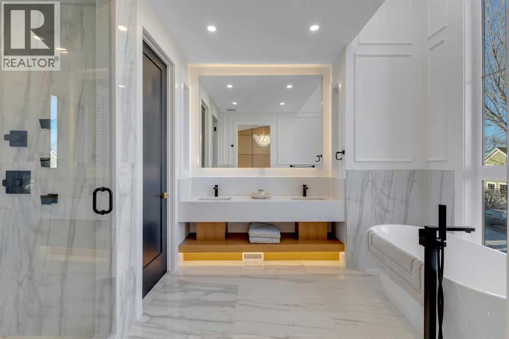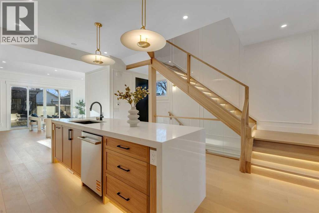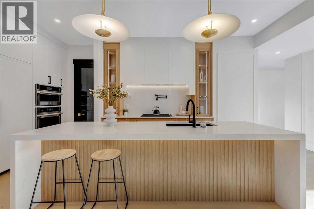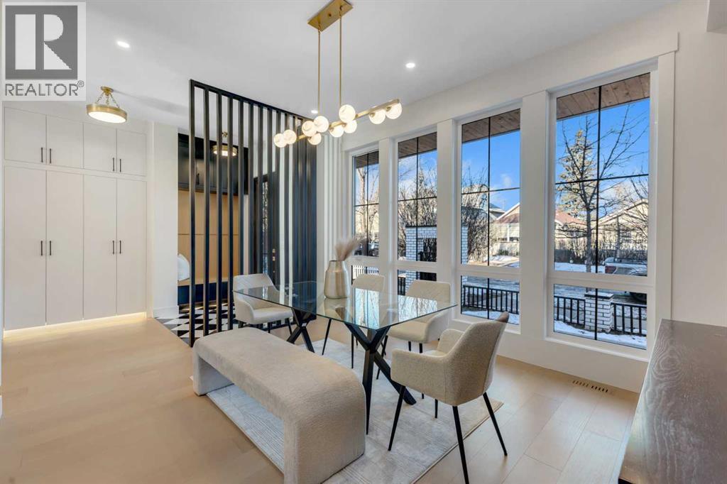 This exceptional detached infill by Moon Homes is set in a quiet pocket of Inglewood and offers a refined blend of architectural presence, thoughtful layout, and elevated living. Designed with intention throughout, the home delivers a strong sense of craftsmanship while remaining highly functional for everyday life.The main floor opens to a welcoming front entry finished with custom millwork and built in storage that provides subtle separation while maintaining an open flow. A dedicated front dining area is framed by oversized windows overlooking the tree lined street, creating a bright and inviting space for hosting and daily use. Carefully selected materials and cohesive detailing throughout the main level give the home a polished and timeless feel.At the centre of the home, the kitchen is both striking and highly functional. Quartz countertops, custom oak and white cabinetry, matte black fixtures, an arched hood fan, and a full JennAir appliance package including a gas range anchor the space. A pot filler and extensive storage support everyday cooking, while the hidden prep kitchen adds a second sink, additional cabinetry, and open shelving, allowing the main kitchen to remain clean and composed.The living room is warm and elevated, centered around a gas fireplace with a tiled surround and floating oak media feature. Large sliding doors open to the backyard, bringing in natural light and reinforcing seamless indoor outdoor living. At the rear of the home, a spacious mudroom with built in cabinetry continues the thoughtful storage theme, while a well finished powder room completes the main level.Upstairs, the primary suite is a true retreat. Vaulted ceilings create a sense of scale, while a full floor to ceiling oak panel feature wall adds depth, warmth, and architectural impact. The walk in closet is finished with custom built ins topped with quartz surfaces, combining durability with a refined aesthetic. The ensuite is equally impressive, featuring dual sinks, a freestanding soaker tub, and a fully tiled walk in steam shower, creating a calm and spa inspired space. A built in coffee bar with sink, floating shelves, and space for a beverage fridge adds everyday convenience and a boutique hotel feel.Each secondary bedroom is finished with tray ceilings, walk in closets, and private four piece ensuites, offering comfort and privacy for family or guests. An upper floor laundry room is conveniently positioned nearby.The fully developed basement expands the home’s versatility with a large recreation room featuring a custom wet bar, a fourth bedroom, full bathroom, quiet home office, dedicated gym space, and a temperature controlled wine room with custom shelving. This level is designed to accommodate entertaining, work, and relaxation with ease.Located just steps from Inglewood’s 9th Avenue, the home offers walkable access to cafés, restaurants, shops, river pathways, parks, and schools, all while remaining minutes from downtown. (id:6769)
