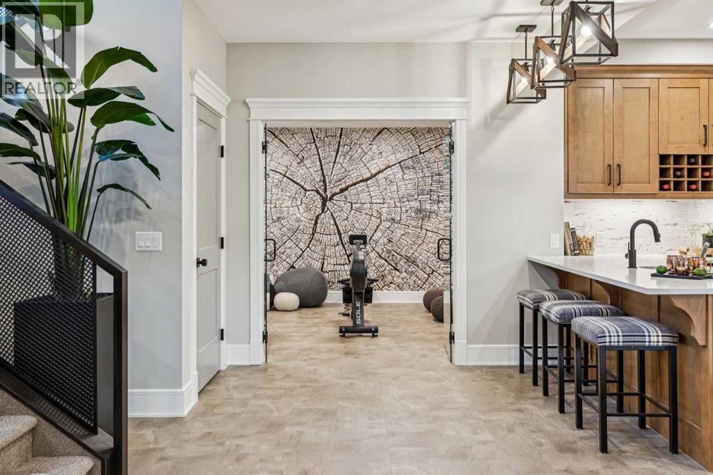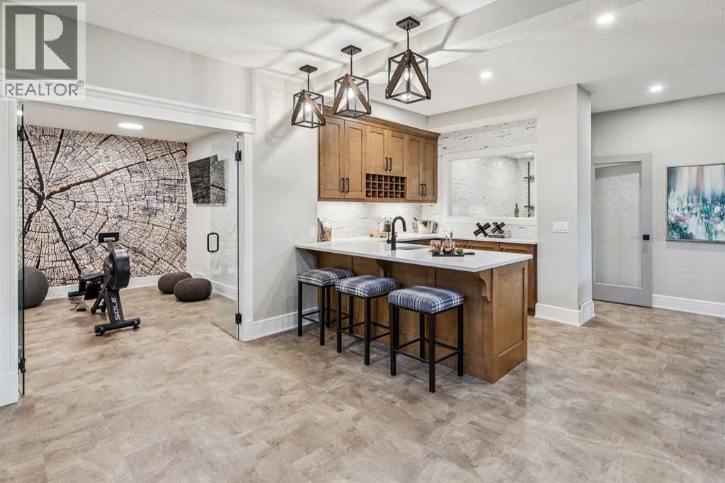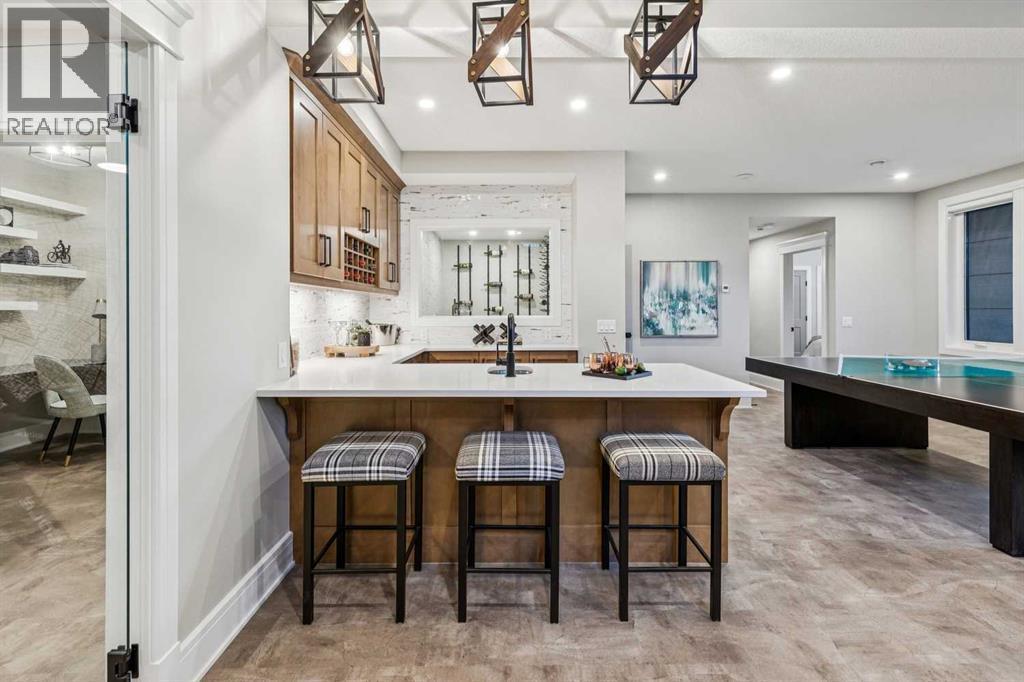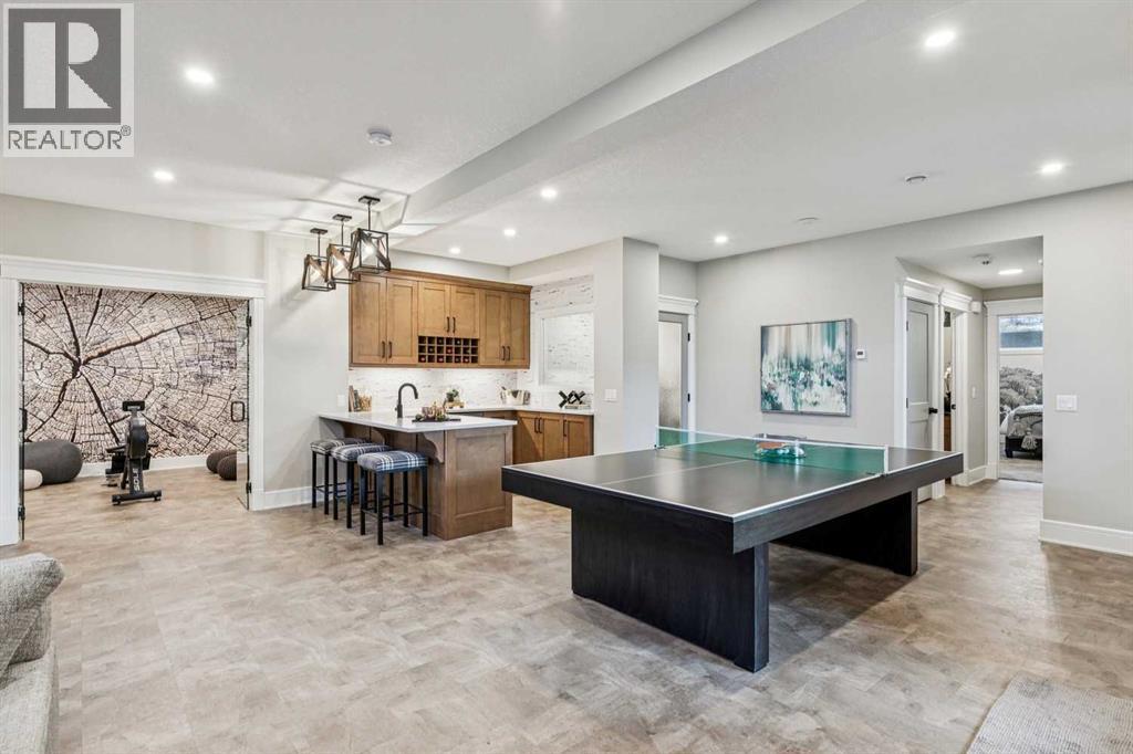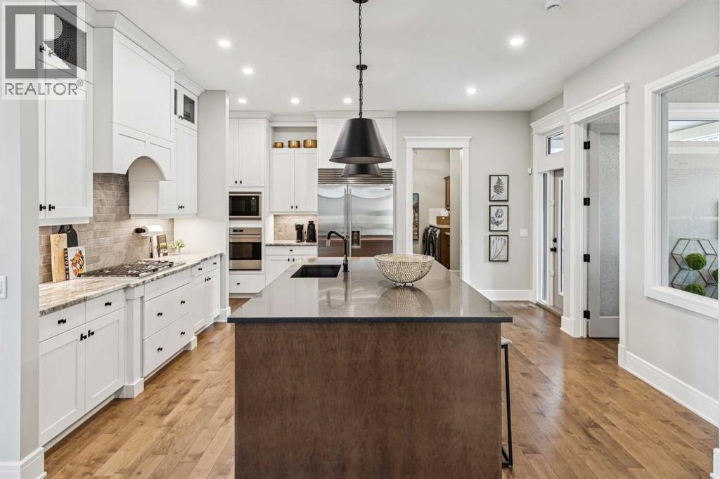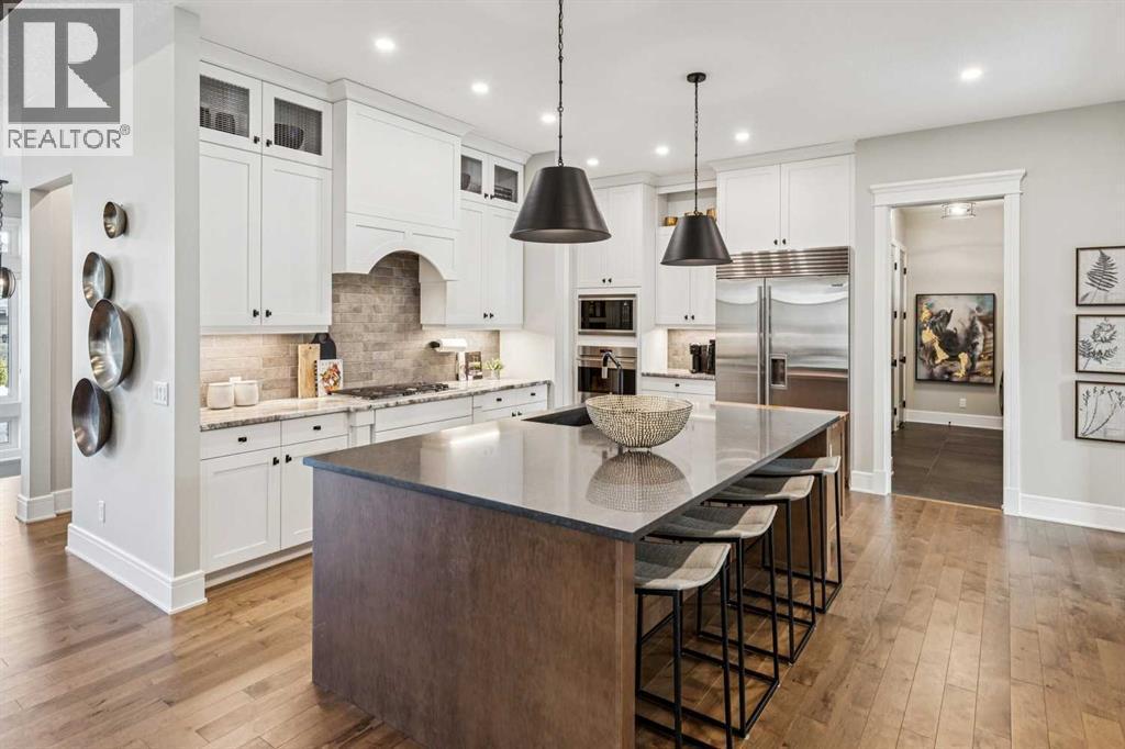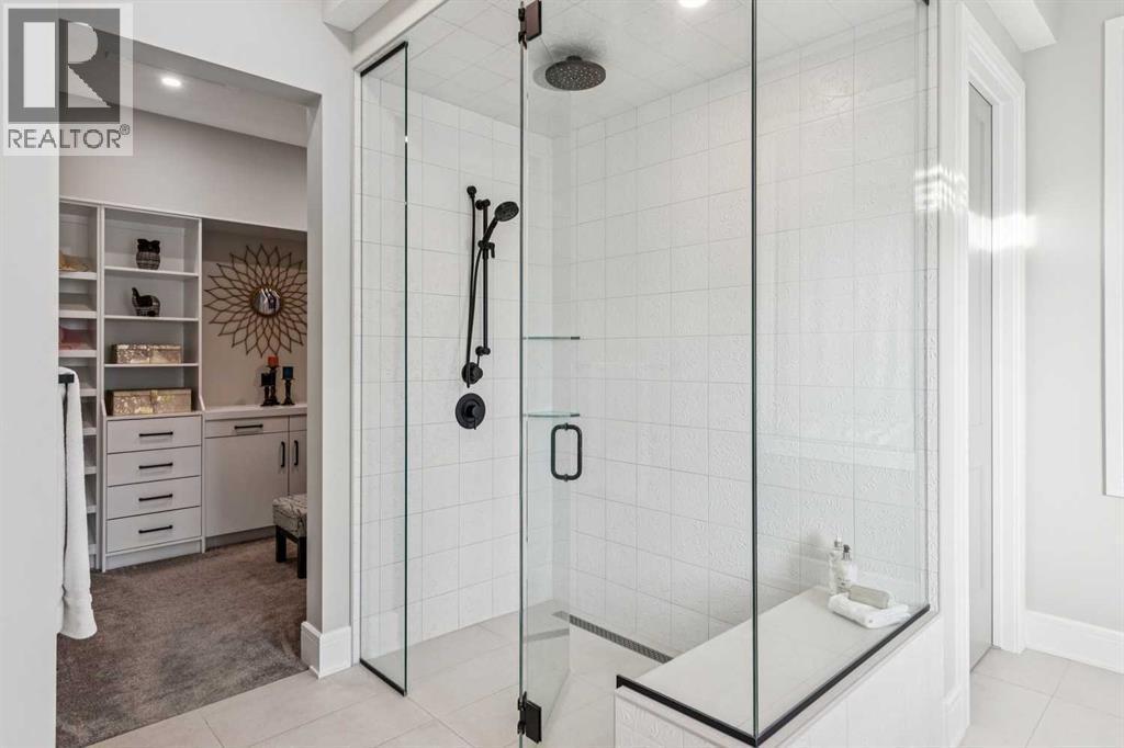 Welcome to a truly remarkable residence in the sought-after southwest community of Crestmont—a former Augusta show home showcasing extensive upgrades, refined craftsmanship, and a unique combination of luxury and functionality. Positioned on a generous corner lot with 3 bedrooms and rare 5-car garage, this highly coveted bungalow boasts more than 4,000 sq. ft. on two levels and offers an elevated lifestyle with thoughtfully designed spaces both indoors and out. The open-concept main level boasts 10' & 11' ceilings and is anchored by a stunning chef's kitchen, featuring extensive custom cabinetry, high-end Sub-Zero and Wolf appliances, and an oversized pantry—perfectly suited for both everyday living and elegant entertaining. Sunlight fills the space through transom windows, flowing seamlessly into inviting living and dining areas that open to multiple outdoor spaces. The primary suite on the main level is a private retreat of impressive scale, complete with its own southwest-facing deck. A spa-inspired ensuite with dual vanities, heated floors, a luxurious soaker tub and an expansive dressing room creates a serene, hotel-calibre experience. The main floor is complete with an executive style office featuring built-in desk and cabinetry, powder room and functional laundry & mudroom. Designed for entertaining and relaxation alike, the fully developed lower level offers two additional generously sized bedrooms, each with it's own full bath and an spacious recreation and games room. A sophisticated wet bar is complemented by a dedicated wine room, while a fitness room and hobby/craft room with second laundry area adds to the home’s lifestyle appeal. Outdoor living is equally exceptional, with multiple decks and private outdoor spaces, including a secluded walk-out cove featuring a hot tub. Outstanding landscaping includes feature rundle stone, wrought iron fence and back yard bordered by additional evergreen trees for enhanced privacy and year-round enjoyment. A stand out feature rarely found: a five-car garage with room for vehicle lifts, and offering unparalleled storage, dog wash and flexibility for car enthusiasts or hobbyists. Situated in the coveted Crestmont community on Calgary’s west side, this home offers more than just luxury indoors. Residents enjoy access to an inviting HOA clubhouse, scenic parks and pathways, and sport courts for recreation and play. Retail destinations are conveniently close, and the location provides easy access to downtown Calgary as well as direct routes to the mountains, making daily life and weekend escapes effortless. This is a rare opportunity to own a statement property in Crestmont—perfect for empty nesters or those about to be - where luxury, privacy, and thoughtful design converge in one extraordinary home. (id:6769)
