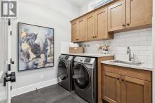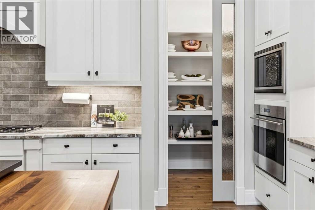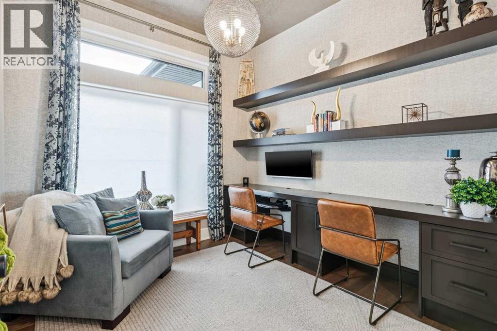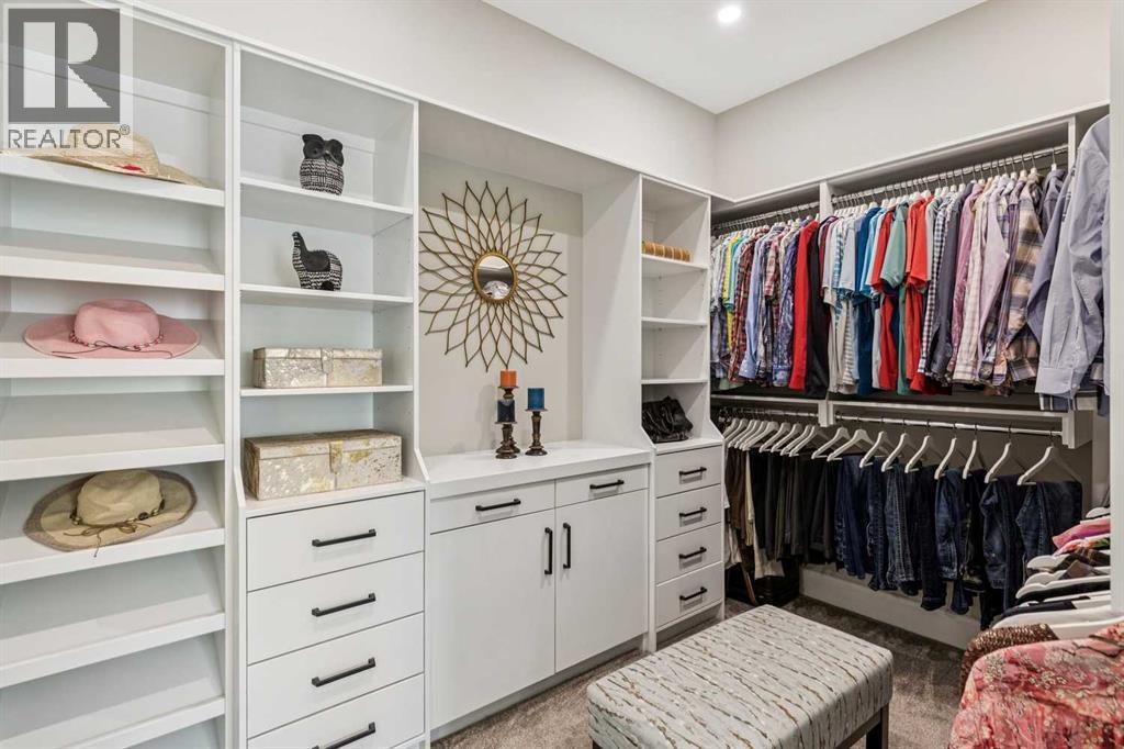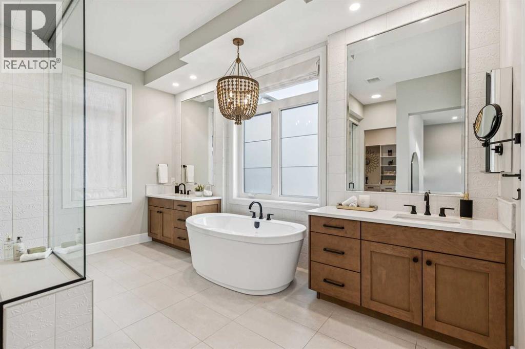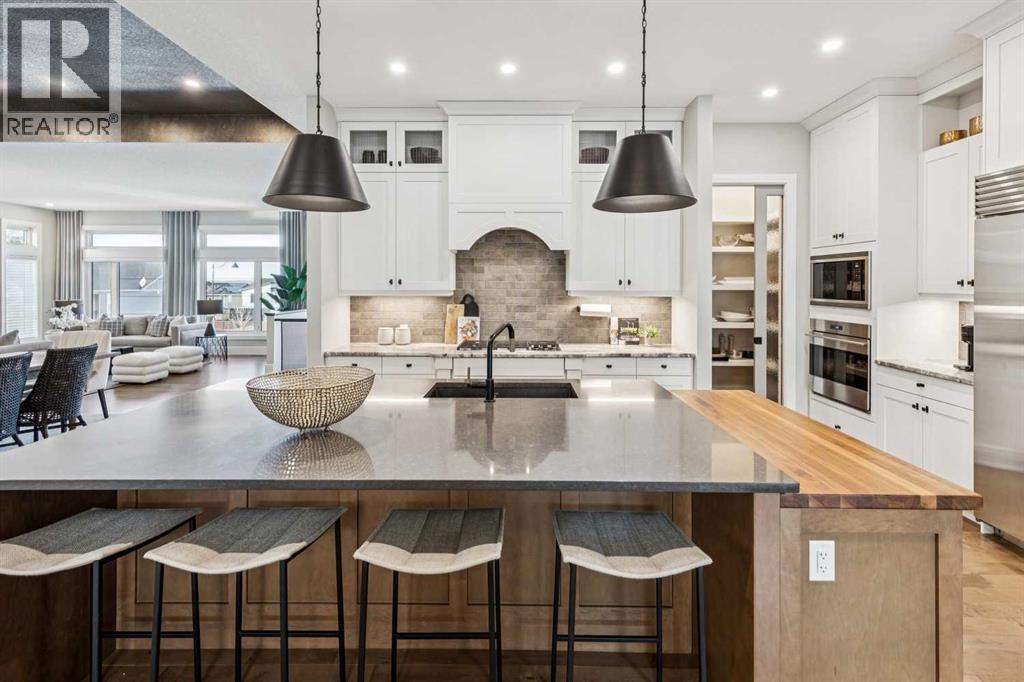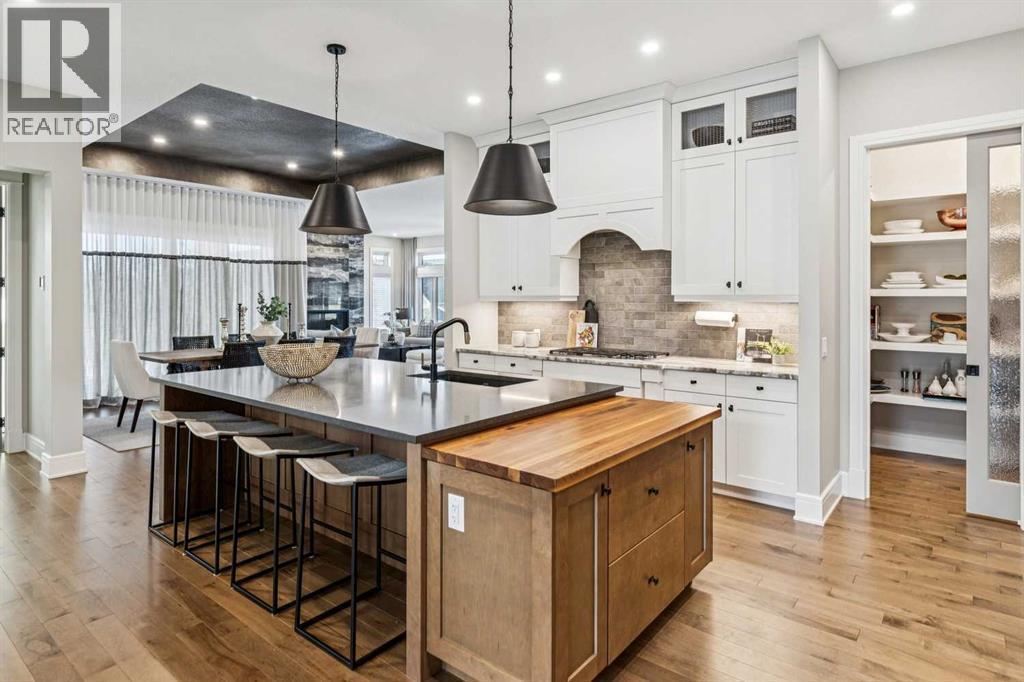 Welcome to a truly remarkable residence in the sought-after southwest community of Crestmont—a former Augusta show home showcasing extensive upgrades, refined craftsmanship, and a unique combination of luxury and functionality. Positioned on a generous corner lot with 3 bedrooms and rare 5-car garage, this highly coveted bungalow boasts more than 4,000 sq. ft. on two levels and offers an elevated lifestyle with thoughtfully designed spaces both indoors and out. The open-concept main level boasts 10' & 11' ceilings and is anchored by a stunning chef's kitchen, featuring extensive custom cabinetry, high-end Sub-Zero and Wolf appliances, and an oversized pantry—perfectly suited for both everyday living and elegant entertaining. Sunlight fills the space through transom windows, flowing seamlessly into inviting living and dining areas that open to multiple outdoor spaces. The primary suite on the main level is a private retreat of impressive scale, complete with its own southwest-facing deck. A spa-inspired ensuite with dual vanities, heated floors, a luxurious soaker tub and an expansive dressing room creates a serene, hotel-calibre experience. The main floor is complete with an executive style office featuring built-in desk and cabinetry, powder room and functional laundry & mudroom. Designed for entertaining and relaxation alike, the fully developed lower level offers two additional generously sized bedrooms, each with it's own full bath and an spacious recreation and games room. A sophisticated wet bar is complemented by a dedicated wine room, while a fitness room and hobby/craft room with second laundry area adds to the home’s lifestyle appeal. Outdoor living is equally exceptional, with multiple decks and private outdoor spaces, including a secluded walk-out cove featuring a hot tub. Outstanding landscaping includes feature rundle stone, wrought iron fence and back yard bordered by additional evergreen trees for enhanced privacy and year-round enjoyment. A stand out feature rarely found: a five-car garage with room for vehicle lifts, and offering unparalleled storage, dog wash and flexibility for car enthusiasts or hobbyists. Situated in the coveted Crestmont community on Calgary’s west side, this home offers more than just luxury indoors. Residents enjoy access to an inviting HOA clubhouse, scenic parks and pathways, and sport courts for recreation and play. Retail destinations are conveniently close, and the location provides easy access to downtown Calgary as well as direct routes to the mountains, making daily life and weekend escapes effortless. This is a rare opportunity to own a statement property in Crestmont—perfect for empty nesters or those about to be - where luxury, privacy, and thoughtful design converge in one extraordinary home. (id:6769)