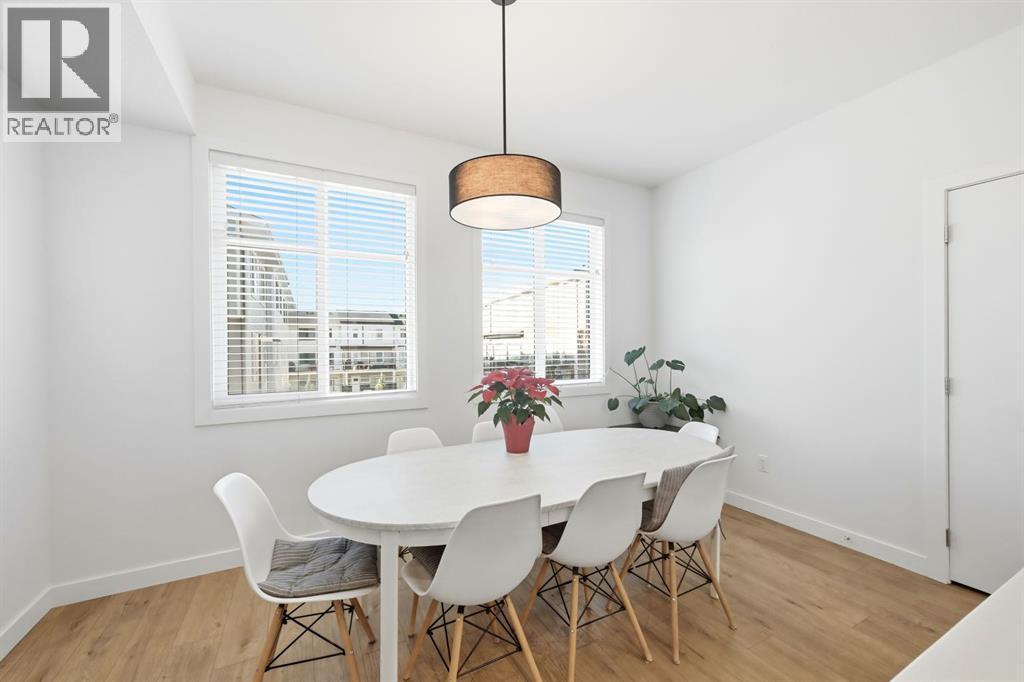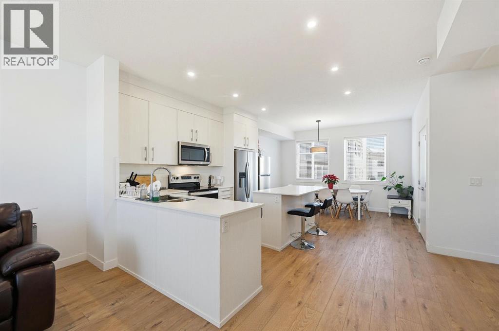 Beautifully upgraded townhome located in the family-friendly community of Carrington NW. Enjoy the convenience of nearby shops, walking paths, and easy access to downtown and the mountains. This modern 4-bedroom, 2.5-bath home offers 1,639 sq ft of thoughtfully designed living space. The main-floor bedroom is extremely versatile and works perfectly as a home office, gym, or guest room. The attached double garage provides secure parking and seasonal storage. The bright, open-concept second level is perfect for both daily living and entertaining. Large windows bring in plenty of natural light, while the upgraded kitchen features quartz countertops, stainless steel appliances, and ample storage. The living area opens onto a private balcony, great for morning coffee or relaxing in the evening. Upstairs offers three well-sized bedrooms, including a spacious primary suite with a walk-in closet and private 4-piece ensuite. Two additional bedrooms, a full bathroom, and upper-floor laundry add everyday convenience.The complex is well managed and features a landscaped courtyard with ample visitor and street parking. With growing amenities, future schools, and a planned LRT nearby, this is a fantastic option for families, professionals, or investors looking for a low-maintenance home in a growing community. Homes like this don’t last long in Carrington, book your private showing today and secure this one before it’s gone. (id:6769)