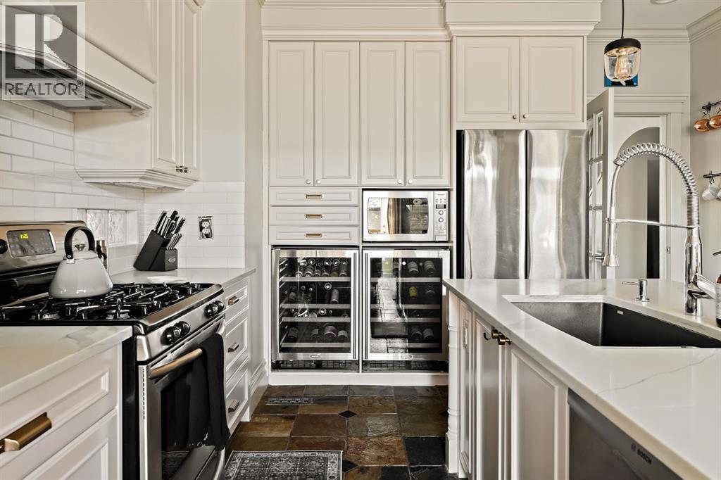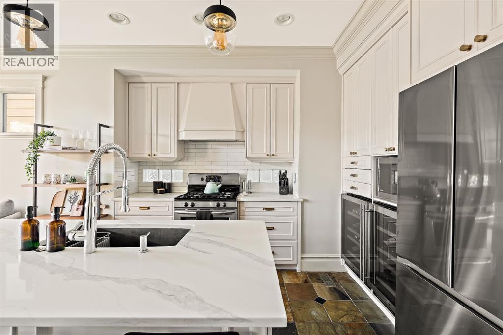 Refined inner-city living awaits at 2006 34 Street SW, an exquisite detached infill located in the heart of Killarney. Lovingly maintained and thoughtfully updated, this home blends traditional charm with modern elegance across nearly 2,500 square feet of beautifully finished living space. From the moment you arrive, the stunning curb appeal and classic exterior detailing set the tone for what lies within. Step inside to discover professionally curated interiors featuring flat ceilings, elegant crown mouldings, and a timeless colour palette that feels both warm and sophisticated. The open living and dining areas create an inviting space for entertaining, seamlessly flowing into a renovated kitchen designed for both function and style. Here, painted cabinetry is paired with quartz countertops, subway tile backsplash, updated lighting and hardware, modern appliances, and dual wine fridges. A breakfast bar allows guests to gather while meals are prepared, enhanced by a built-in speaker system that sets the mood for effortless hosting. At the rear of the home, the family room offers a cozy retreat anchored by a gas fireplace and direct access to the east-facing backyard. Outdoors, a weather-treated cedar deck and stone patio provide an exceptional extension of the living space, complete with low-maintenance perennial landscaping, multiple gas hookups, and integrated audio—perfect for year-round enjoyment. Upstairs, the second level features three well-appointed bedrooms, including a light-filled primary suite with vaulted ceilings, large windows, double closets, and a spa-inspired ensuite with dual vanities, soaker tub, and separate glass shower. Two additional bedrooms, a full four-piece bathroom, and upper-level laundry complete this floor with comfort and practicality. The fully developed basement adds outstanding versatility with a spacious recreation area, flexible space ideal for a home gym or office, a fourth bedroom, and a three-piece bathroom—perfect for guests or teens. Additional highlights include central air conditioning, smart home features, updated lighting, a heated and insulated double detached garage, and numerous thoughtful upgrades throughout. Ideally located close to parks, schools, transit, and amenities, with quick access to downtown and vibrant inner-city destinations, this exceptional home offers the very best of Calgary living. Simply put, 2006 34 Street SW is a home where comfort, style, and location come together seamlessly. (id:6769)