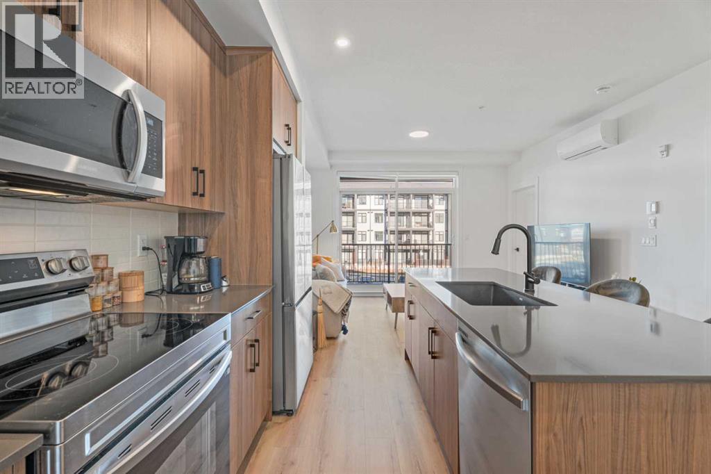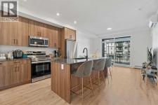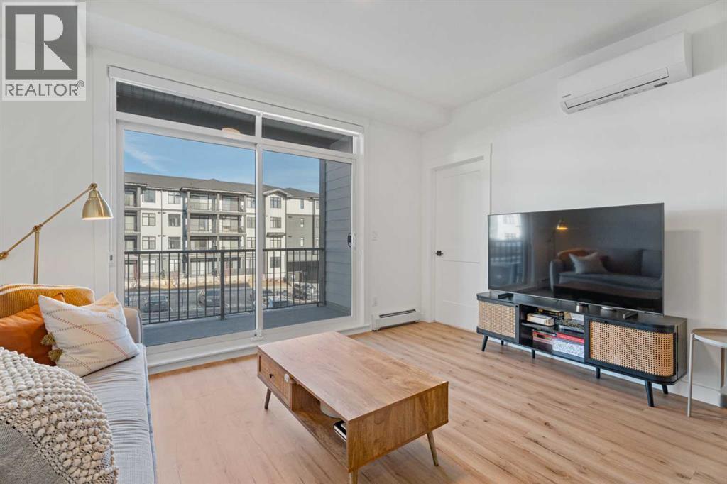 MOVE-IN READY! Discover the perfect balance of style and functionality in this impeccable condo built by award-winning Logel Homes. The unit remains under the first-year coverage period, providing 100% coverage and peace of mind. Located in the Sage Walk development, this unit offers over 700 sq. ft. of well-planned living space with two bedrooms, including a spacious primary suite, and two full bathrooms, plus a private patio for outdoor relaxation. The 9-foot ceilings create an open, airy feel throughout. Over $24,000 in upgrades enhance both style and comfort, including: Luxury Vinyl Plank (LVP) flooring throughout the unit, oversized kitchen sink, cabinets extended all the way to the ceiling with upgraded hardware, air conditioning, taller bathroom countertops, an extra closet in the primary suite, tiled shower in the ensuite bathroom, full-height tile in the secondary bathroom, and blinds added throughout the home. The gourmet kitchen features quartz countertops, stainless steel appliances, including a French door fridge and smooth-top range, and a tile backsplash extending under the cabinets. Designed for quiet living, the building features superior soundproofing, with a lightweight concrete topping separating the floors. Additional highlights include in-unit laundry and a titled, underground parking stall. Conveniently located near Shaganappi Trail and Sage Hill Blvd, this condo combines thoughtful upgrades, modern finishes, and a prime location with competitive condo fees, making it a rare opportunity in a highly sought-after community. (id:6769)