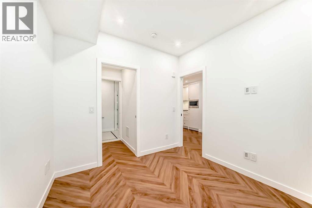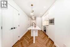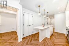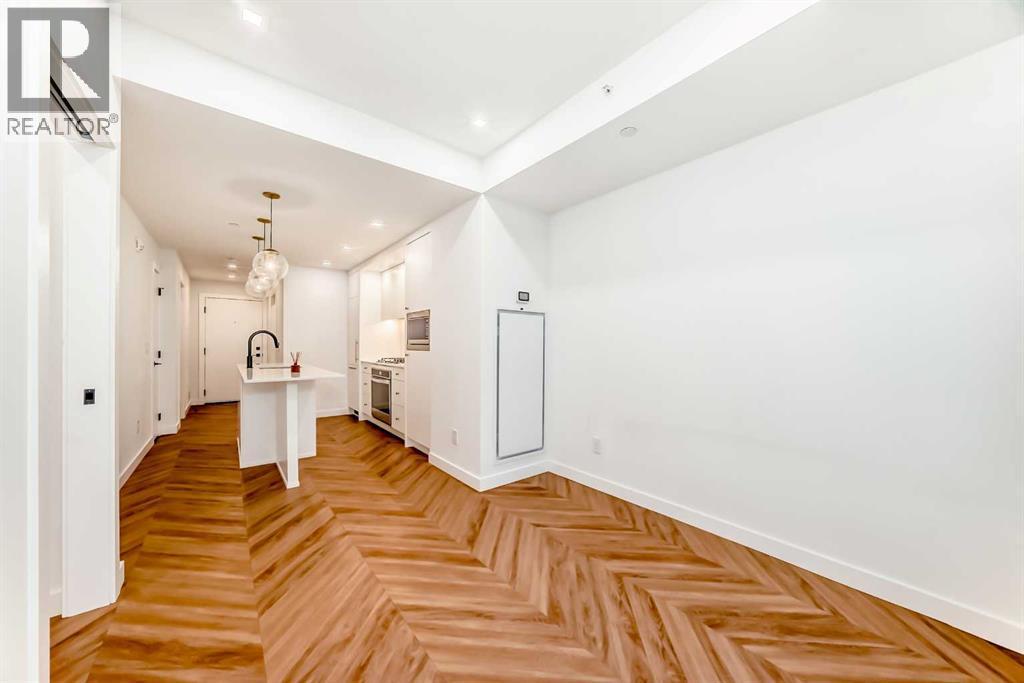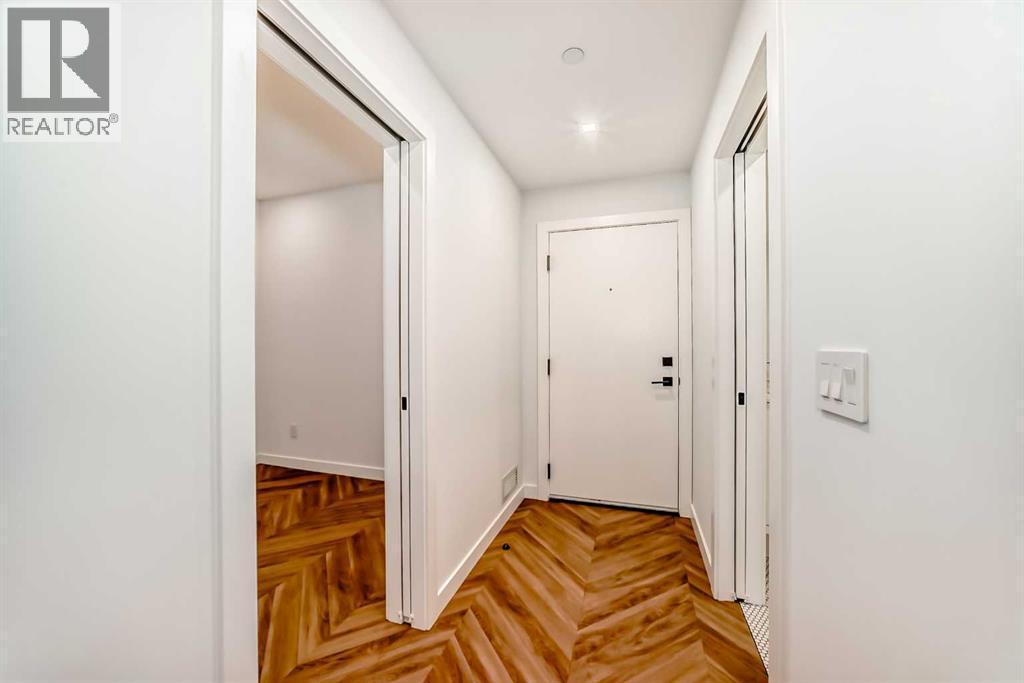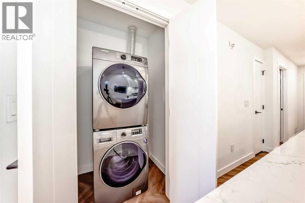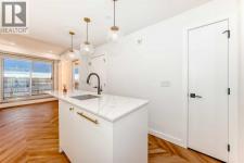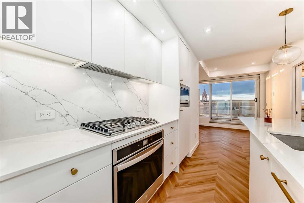 Welcome to Gateway by TRUMAN, ideally located in the vibrant, master-planned West District. This concrete-constructed, eight-storey residence offers an exceptional blend of modern luxury, thoughtful design, and urban convenience. Featuring two bedrooms, two bathrooms, and titled underground parking, this home is perfectly suited for both comfortable everyday living and stylish entertaining.Step inside to discover refined craftsmanship throughout, with chevron wide-plank flooring, designer lighting, and flat-painted ceilings creating a timeless, Ralph Lauren–inspired aesthetic. Expansive floor-to-ceiling windows flood the space with natural light and showcase beautiful mountain views, while air conditioning ensures year-round comfort.The chef-inspired kitchen is the heart of the home, combining elegance and functionality. It features matte-finish custom cabinetry with soft-close hardware, brushed-gold accents, quartz countertops with a matching backsplash, under-cabinet lighting, and a generous eating bar. Premium appliances include a gas cooktop, wall oven, 36” Fisher & Paykel integrated refrigerator, paneled dishwasher, and a statement hood fan—perfect for the home chef.The open living and dining areas flow seamlessly to a private terrace, offering ample space for outdoor lounging, gardening, and relaxed entertaining. The primary suite is calm and inviting, complete with a walk-in closet, and a spa-like ensuite, quartz counters, custom mosaic tile, and a glass-enclosed shower. The second bedroom is equally versatile, ideal as a guest room, home office, or creative space, with convenient access to a stylish four-piece bathroom.Additional highlights include in-suite laundry, generous storage, and secure underground parking. Residents of Gateway enjoy access to premium amenities, including a rooftop patio, private owner’s lounge, concierge service, bike storage, EV charging stations, and underground visitor parking.Surrounded by parks, walking paths, boutique sho pping, cafés, and dining, this exceptional home offers elevated urban living in one of Calgary’s most sought-after communities. (id:6769)