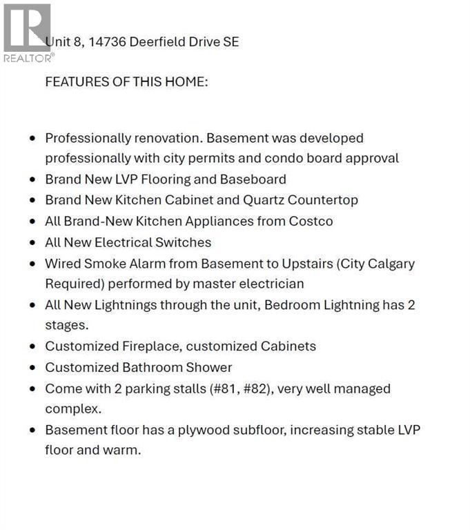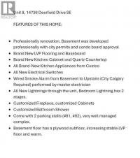 Welcome to Unit 8, 14736 Deerfield Drive SE, a fully renovated 3 bedroom 2 bathroom townhome in Deer Run community. This home has been professionally renovated, the basement was developed professionally with city permits and condo board approval. Floors are brand-new LVP and baseboard throughout the house. The kitchen has been fully renovated with brand new cabinets, stainless steel appliances from Costco, quartz countertop, modern white backsplashes, new electrical switches and lighting. The main floor also features a cozy living room with a custom wall-mounted electric fireplace, TV stand and lots of cabinets for your own décor and hiding everyday clutter. It has a sliding door opening to the deck and backyard providing abundant natural light to the home. Upstairs, you’ll find three generously sized bedrooms and a full bathroom, perfect for families or guests. The fully developed basement expands your living options even further, offering additional space for a media room, fitness area, or playroom—whatever suits your lifestyle best. The basement floor has a plywood subfloor, increasing stable LVP floor and warm. Outside, the private fenced yard offers a quiet retreat for enjoying warm weather, gardening, or letting pets play safely. This unit also includes two assigned parking stalls, a valuable convenience rarely found in similar properties. The complex is well-managed and situated in a peaceful, family-friendly setting surrounded by mature trees and green space. Located just steps from Fish Creek Provincial Park, this home provides easy access to walking and biking trails, playgrounds, and natural beauty. Schools, shopping, restaurants, and major roadways are all close by, making this an ideal location for both relaxation and everyday convenience. Don’t miss your chance to own this beautifully home in one of Calgary’s most desirable communities. Book your private showing today and experience the quality and comfort for yourself. (id:6769)
