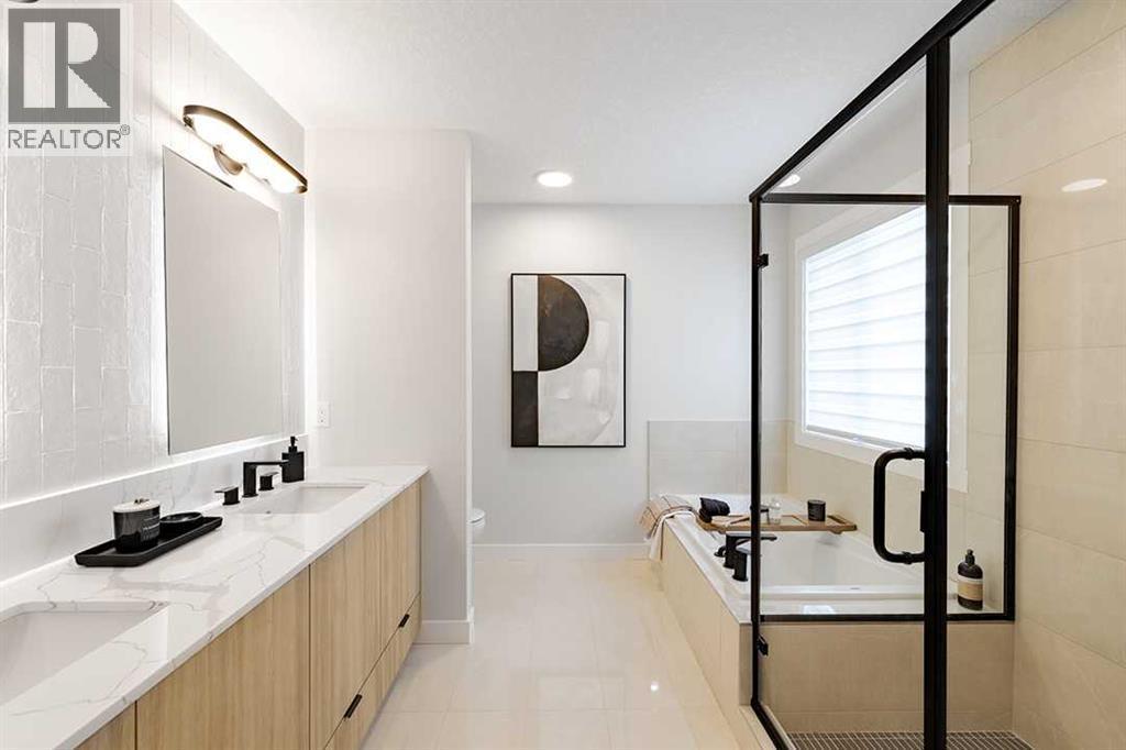Welcome to the Katalina by Shane Homes, a pre construction front-drive home with a double attached garage located in the community of Rose Ranch. The main floor features a full bedroom and full bathroom with shower, ideal for guests or multi-generational living. The open-concept layout includes a living room with electric fireplace, dining nook, and a kitchen with island seating and a walk-in pantry. Upstairs offers three bedrooms, including the primary bedroom with dual vanity ensuite, soaker tub, separate shower, and walk-in closet. All upstairs bedrooms include walk-in closets, along with a full laundry room and an additional full bathroom. The undeveloped basement is ready for potential future development and includes rough-ins. This home can be customized to suit buyer needs. Photos are illustrative and for representative purposes only. (id:6769)